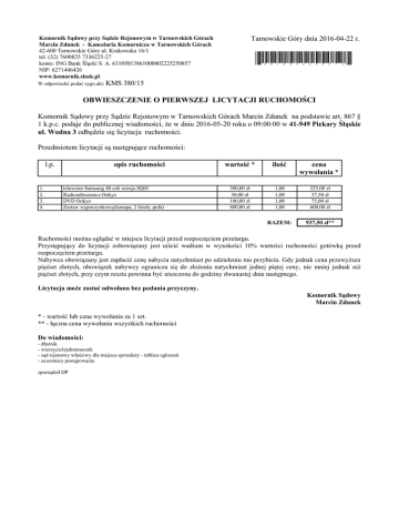 Tarnowskie Góry dnia 2016-04-22 r. Komornik Sądowy przy Sądzie Rejonowym w Tarnowskich Górach Marcin Zdunek - Kancelaria Komornicza w Tarnowskich Górach 42-600 Tarnowskie Góry ul. Krakowska 16/1 tel. (32) 7690825 7336225-27 konto: ING Bank Śląski S. A. 63105013861000002225250857 NIP: 6271446426 www.komornik.slask.pl W odpowiedzi podać sygn.akt: KMS *9016042200373* 380/15 OBWIESZCZENIE O PIERWSZEJ LICYTACJI RUCHOMOŚCI Komornik Sądowy przy Sądzie Rejonowym w Tarnowskich Górach Marcin Zdunek na podstawie art. 867 § 1 k.p.c. podaje do publicznej wiadomości, że w dniu 2016-05-20 roku o 09:00:00 w 41-949 Piekary Śląskie ul. Wodna 3 odbędzie się licytacja ruchomości. Przedmiotem licytacji są następujące ruchomości: l.p. 1. 2. 3. 4. opis ruchomości telewizor Samsung 40 cali wersja SQ01 Radioodtwarzacz Onkyo DVD Onkyo Zestaw wypoczynkowy(kanapa, 2 fotele, pufa) wartość * ilość cena wywołania * 300,00 zł 50,00 zł 100,00 zł 800,00 zł 1,00 1,00 1,00 1,00 225,00 zł 37,50 zł 75,00 zł 600,00 zł RAZEM: 937,50 zł** Ruchomości można oglądać w miejscu licytacji przed rozpoczęciem przetargu. Przystępujący do licytacji zobowiązany jest uiścić wadium w wysokości 10% wartości ruchomości gotówką przed rozpoczęciem przetargu. Nabywca obowiązany jest zapłacić cenę nabycia natychmiast po udzieleniu mu przybicia. Gdy jednak cena przewyższa pięćset złotych, obowiązek nabywcy ogranicza się do złożenia natychmiast jednej piątej ceny, nie mniej jednak niż pięćset złotych, przy czym reszta powinna być uiszczona do godziny dwunastej dnia następnego. Licytacja może zostać odwołana bez podania przyczyny. Komornik Sądowy Marcin Zdunek * - wartość lub cena wywołania za 1 szt. ** - łączna cena wywołania wszystkich ruchomości Do wiadomości: - dłużnik - wierzyciel/pełnomocnik - sąd rejonowy właściwy dla miejsca sprzedaży - tablica ogłoszeń - uczestnicy postępowania sporządził DP