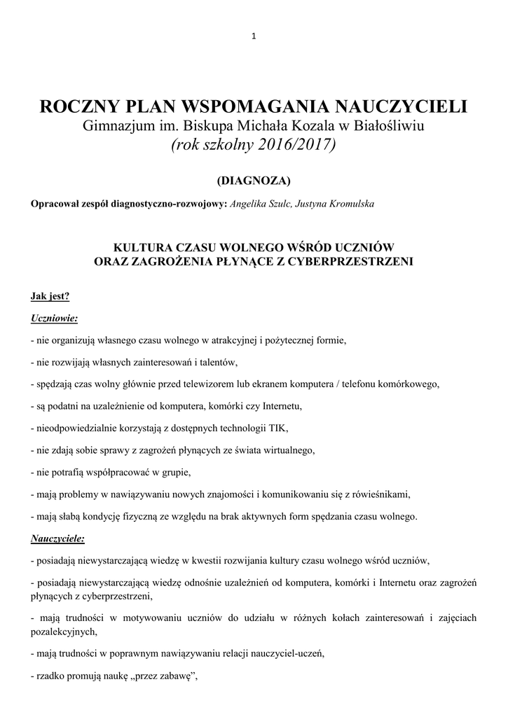 1 ROCZNY PLAN WSPOMAGANIA NAUCZYCIELI Gimnazjum im. Biskupa Michała Kozala w Białośliwiu (rok szkolny 2016/2017) (DIAGNOZA) Opracował zespół diagnostyczno-rozwojowy: Angelika Szulc, Justyna Kromulska KULTURA CZASU WOLNEGO WŚRÓD UCZNIÓW ORAZ ZAGROŻENIA PŁYNĄCE Z CYBERPRZESTRZENI Jak jest? Uczniowie: - nie organizują własnego czasu wolnego w atrakcyjnej i pożytecznej formie, - nie rozwijają własnych zainteresowań i talentów, - spędzają czas wolny głównie przed telewizorem lub ekranem komputera / telefonu komórkowego, - są podatni na uzależnienie od komputera, komórki czy Internetu, - nieodpowiedzialnie korzystają z dostępnych technologii TIK, - nie zdają sobie sprawy z zagrożeń płynących ze świata wirtualnego, - nie potrafią współpracować w grupie, - mają problemy w nawiązywaniu nowych znajomości i komunikowaniu się z rówieśnikami, - mają słabą kondycję fizyczną ze względu na brak aktywnych form spędzania czasu wolnego. Nauczyciele: - posiadają niewystarczającą wiedzę w kwestii rozwijania kultury czasu wolnego wśród uczniów, - posiadają niewystarczającą wiedzę odnośnie uzależnień od komputera, komórki i Internetu oraz zagrożeń płynących z cyberprzestrzeni, - mają trudności w motywowaniu uczniów do udziału w różnych kołach zainteresowań i zajęciach pozalekcyjnych, - mają trudności w poprawnym nawiązywaniu relacji nauczyciel-uczeń, - rzadko promują naukę „przez zabawę”, 2 - potrzebują wsparcia w zakresie pedagogizacji rodziców w powyższych kwestiach. Rodzice: - nie mają dostatecznej wiedzy dotyczącej zagrożeń płynących z cyberprzestrzeni oraz uzależnień od komputera i telefonu komórkowe, - nie kontrolują ilości czasu, jakie ich dziecko spędza przed telewizorem lub komputerem, - nie kontrolują treści przeglądanych przez dzieci w Internecie oraz ich działalności dzieci w sieci, - rzadko promują aktywne formy spędzania czasu wolnego wśród dzieci, - wykazują małe zainteresowanie dzieckiem w czasie wolnym. Jak być powinno Uczniowie: - potrafią zorganizować własny czas wolny w atrakcyjnej i pożytecznej formie, - rozwijają własne zainteresowania i talenty, - ograniczają czas spędzony przed telewizorem, komputerem czy telefonem komórkowym, - potrafią rozpoznać oznaki uzależnienia od komputera, komórki czy Internetu, - potrafią właściwie i bezpiecznie korzystać z technologii TIK, - są świadomi zagrożeń płynących z cyberprzestrzeni, - potrafią nawiązywać nowe znajomości i komunikować się z rówieśnikami bez większych problemów, - potrafią współpracować w grupie, - wzmacniają kondycję fizyczną poprzez aktywne formy spędzania czasu wolnego na świeżym powietrzu. Nauczyciele: - posiadają wiedzę, która pozwoli im promować kulturę czasu wolnego wśród uczniów, - posiadają wiedzę na temat uzależnień od komputera, telefonu i komórki oraz znają narzędzia walki z nimi, - są świadomi zagrożeń płynących z cyberprzestrzeni i potrafią przekazać tą wiedzę uczniom, - potrafią zorganizować kółka zainteresowań i zajęcia pozalekcyjne, które odpowiadają potrzebom uczniów, - potrafią zachęcić uczniów do udziału w szkolnych kołach zainteresowań i zajęciach pozalekcyjnych, - potrafią nawiązać poprawne relacje nauczyciel-uczeń, - promują naukę „przez zabawę” ukazując uczniom pozytywny wpływ zabawy na różne aspekty ich życia, - potrafią skutecznie przeprowadzić pedagogizację rodziców w powyższych kwestiach. 3 Rodzice: - mają wiedzę dotyczącązagrożeń płynących z cyberprzestrzeni oraz uzależnień od komputera i telefonu komórkowego, - kontrolują ilość czasu, jakie ich dziecko spędza przed telewizorem lub komputerem, - kontrolują treści przeglądane przez dzieci w Internecie oraz ich działalność w sieci, - wykazują zainteresowanie dzieckiem w czasie wolnym, - starają się spędzać czas wolny z dziećmi, - promują aktywne formy spędzania czasu wolnego wśród własnych dzieci, - zachęcają dzieci do rozwijania własnych zainteresowań i talentów lub do udziału w różnych kołach zainteresowań lub zajęciach pozalekcyjnych. Co sprawia, że nie jest tak jak powinno - zły system wartości i brak ambicji, - uczniowie nie widzą potrzeby i celu rozwijania własnych zainteresowań i talentów, - uczniowie są uzależnieni od telewizora, komputerów, komórek i Internetu, - łatwość rozmowy przez komputer/komórkę zamiast bezpośredniego spotkania, - tzw. „anonimowość” którą zapewnia uczniom Internet, - niewystarczające zainteresowanie rodziców funkcjonowaniem dziecka poza szkołą, - niewystarczające motywowanie i kontrola ze strony nauczycieli i rodziców, - oferta szkolnych kół zainteresowań i zajęć pozalekcyjnych nie jest zawsze dostosowana do potrzeb uczniów, - brak pedagogizacji rodziców i nauczycieli w zakresie uzależnień od komputera, komórek i Internetu oraz zagrożeń płynących z cyberprzestrzeni, - natłok pracy i obowiązków w życiu codziennym, - małe zainteresowanie nauczycieli i rodziców powyższymi kwestiami. Wnioski - nauczyciele powinni szkolić się w zakresie zagrożeń płynących z cyberprzestrzeni oraz w zakresie uzależnień od komputera, telefonu, telewizora i Internetu, - nauczyciele powinni dostosowywać ofertę zajęć pozalekcyjnych do potrzeb uczniów, - nauczyciele powinni promować kulturę czasu wolnego wśród uczniów, - uczniowie powinni wiedzieć, jak najlepiej zorganizować własny czas wolny, 4 - uczniowie powinni wiedzieć, jak radzić sobie z uzależnieniami od komputera, telefonu, Internetu czy telewizora, - uczniowie powinni wiedzieć, jak radzić sobie z zagrożeniami płynącymi ze świata wirtualnego, - rodzice powinni aktywnie uczestniczyć w procesie wychowywania dziecka i motywować go do rozwijania własnych umiejętności, zainteresowań i uzdolnień. Cel ogólny - podniesienie kompetencji nauczycieli i rodzic