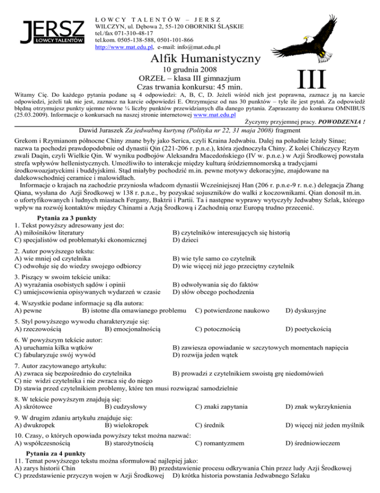 ŁOWCY TALENTÓW – JERSZ WILCZYN, ul. Dębowa 2, 55-120 OBORNIKI ŚLĄSKIE tel./fax 071-310-48-17 tel.kom. 0505-138-588, 0501-101-866 http://www.mat.edu.pl, e-mail: [email protected] Alfik Humanistyczny 10 grudnia 2008 ORZEŁ – klasa III gimnazjum Czas trwania konkursu: 45 min. III Witamy Cię. Do każdego pytania podane są 4 odpowiedzi: A, B, C, D. Jeżeli wśród nich jest poprawna, zaznacz ją na karcie odpowiedzi, jeżeli tak nie jest, zaznacz na karcie odpowiedzi E. Otrzymujesz od nas 30 punktów – tyle ile jest pytań. Za odpowiedź błędną otrzymujesz punkty ujemne równe ¼ liczby punktów przewidzianych dla danego pytania. Zapraszamy do konkursu OMNIBUS (25.03.2009). Informacje o konkursach na naszej stronie internetowej www.mat.edu.pl Życzymy przyjemnej pracy. POWODZENIA ! Dawid Juraszek Za jedwabną kurtyną (Polityka nr 22, 31 maja 2008) fragment Grekom i Rzymianom północne Chiny znane były jako Serica, czyli Kraina Jedwabiu. Dalej na południe leżały Sinae; nazwa ta pochodzi prawdopodobnie od dynastii Qin (221-206 r. p.n.e.), która zjednoczyła Chiny. Z kolei Chińczycy Rzym zwali Daqin, czyli Wielkie Qin. W wyniku podbojów Aleksandra Macedońskiego (IV w. p.n.e.) w Azji Środkowej powstała strefa wpływów hellenistycznych. Umożliwiło to interakcje między kulturą śródziemnomorską a tradycjami środkowoazjatyckimi i buddyjskimi. Stąd miałyby pochodzić m.in. pewne motywy dekoracyjne, znajdowane na dalekowschodniej ceramice i malowidłach. Informacje o krajach na zachodzie przyniosła władcom dynastii Wcześniejszej Han (206 r. p.n.e-9 r. n.e.) delegacja Zhang Qiana, wysłana do Azji Środkowej w 138 r. p.n.e., by pozyskać sojuszników do walki z koczownikami. Qian donosił m.in. o ufortyfikowanych i ludnych miastach Fergany, Baktrii i Partii. Ta i następne wyprawy wytyczyły Jedwabny Szlak, którego wpływ na rozwój kontaktów między Chinami a Azją Środkową i Zachodnią oraz Europą trudno przecenić. Pytania za 3 punkty 1. Tekst powyższy adresowany jest do: A) miłośników literatury C) specjalistów od problematyki ekonomicznej B) czytelników interesujących się historią D) dzieci 2. Autor powyższego tekstu: A) wie mniej od czytelnika C) odwołuje się do wiedzy swojego odbiorcy B) wie tyle samo co czytelnik D) wie więcej niż jego przeciętny czytelnik 3. Piszący w swoim tekście unika: A) wyrażania osobistych sądów i opinii C) umiejscowienia opisywanych wydarzeń w czasie B) odwoływania się do faktów D) słów obcego pochodzenia 4. Wszystkie podane informacje są dla autora: A) pewne B) istotne dla omawianego problemu C) potwierdzone naukowo D) dyskusyjne 5. Styl powyższego wywodu charakteryzuje się: A) rzeczowością B) emocjonalnością C) potocznością D) poetyckością 6. W powyższym tekście autor: A) uruchamia kilka wątków C) fabularyzuje swój wywód B) zawiesza opowiadanie w szczytowych momentach napięcia D) rozwija jeden wątek 7. Autor zacytowanego artykułu: A) zwraca się bezpośrednio do czytelnika B) prowadzi z czytelnikiem swoistą grę niedomówień C) nie widzi czytelnika i nie zwraca się do niego D) stawia przed czytelnikiem problemy, które ten musi rozwiązać samodzielnie 8. W tekście powyższym znajdują się: A) skrótowce B) cudzysłowy C) znaki zapytania D) znak wykrzyknienia 9. W drugim zdaniu artykułu znajduje się: A) dwukropek B) wielokropek C) średnik D) więcej niż jeden myślnik 10. Czasy, o których opowiada powyższy tekst można nazwać: A) współczesnością B) starożytnością C) romantyzmem D) średniowieczem Pytania za 4 punkty 11. Temat powyższego tekstu można sformułować najlepiej jako: A) zarys historii Chin B) przedstawienie procesu odkrywania Chin przez ludy Azji Środkowej C) przedstawienie przyczyn wojen w Azji Środkowej D) krótka historia powstania Jedwabnego Szlaku 12. Jedwab, od którego wzięła się nazwa szlaku handlowego, to: A) tkanina B) minerał C) przysmak D) roślina 13. Wspomniany w tekście Aleksander Macedoński to: A) postać legendarna B) wódz rzymski C) władca jednego z greckich państw D) odkrywca Chin 14. Z powyższego artykułu można wywnioskować, że: A) kultura śródziemnomorska i cywilizacja Dalekiego Wschodu rozwijały się w całkowitej izolacji B) Grecy i Rzymianie wiedzieli o istnieniu Chin C) władcy Chin nie zdawali sobie sprawy, że na zachód od granic ich państwa istnieją rozwinięte cywilizacje D) czynnikiem Chiny były państwem świadomie izolującym się od innych cywilizacji 15. Terminem kultury śródziemnomorskiej określona zostaje w tekście cywilizacja: A) Greków i Rzymian B) Chin C) Azji Środkowej i Zachodniej D) tylko Azji Środkowej 16. Użyte w tekście słowo interakcje można zrozumieć jako: A) sprzeczności B) tarcia C) zdobywanie wpływów D) wzajemne oddziaływanie 17. Krainą Jedwabiu Grecy i Rzymianie nazywali: A) Chiny C) krainę leżącą na północ od Sinae B) południową część Chin D) kraje, które podbił Aleksander Macedoński 18. Z tekstu można wywnioskować, że Jedwabny Szlak: A) został stworzony przez Greków C) wytyczyły wojska Aleksandra Macedońskiego B) powstawał stopniowo w ciągu wielu lat D) powstał za panowanie dynastii Qin 19. Prawą jest, że: A) wyprawa Zhang Qiana miała na celu nawiązanie stosunków gospodarczych z krajami Zachodu B) za panowania dynastii Wcześniejszej Han Chiny były już zjednoczone C) Chiny zostały zjednoczone dopiero w początkach naszej ery D) delegacja Hang Qiana dotarła do Europy 20. Zakończenie powyższego tekstu przynosi informację, że: A) trudno powiedzieć, jakie naprawdę było znaczenie Jedwabnego Szlaku B) Jedwabny Szlak nie miał większego znaczenia C) Jedwabny Szlak miał olbrzymie znaczenie D) ocena stosunków Chin z Europą sprawia mnóstwo trudności Pytania za 5 punktów 21. Pierwsze zdanie powyższego tekstu jest: A) zdaniem pojedynczym C) równoważnikiem zdania B) zdaniem podrzędnie złożonym D) zdaniem złożonym