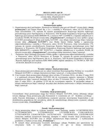 REGULAMIN AKCJI „Promocja na Monitory plus gra od Ubisoft” (zwany dalej „Regulaminem”) z dnia 23 kwietnia 2016 r. §1 Postanowienia ogólne 1. Organizatorem akcji pod hasłem „Promocja na Monitory plus gra od Ubisoft” (zwana dalej „Akcją promocyjną”) jest Saturn Planet Sp. z o.o. z siedzibą w Warszawie, adres: 02-222 Warszawa, Aleje Jerozolimskie 179, wpisana do rejestru przedsiębiorców Krajowego Rejestru Sądowego prowadzonego przez Sąd Rejonowy w Warszawie, XIII Wydział Gospodarczy Krajowego Rejestru Sądowego pod numerem KRS 0000206770, o numerze NIP 1132490674, o kapitale zakładowym w wysokości 50.000, 00 złotych (zwana dalej „Organizatorem”), działająca na rzecz spółek z grupy SATURN prowadzących sklepy pod marką SATURN oraz sklepu internetowego https://saturn.pl (zwane dalej „Sklepami SATURN”) oraz Media Saturn Online Spółka z ograniczoną odpowiedzialnością z siedzibą w Warszawie, adres: 02-222 Warszawa, Aleje Jerozolimskie 179, wpisana do rejestru przedsiębiorców Krajowego Rejestru Sądowego prowadzonego przez Sąd Rejonowy w Warszawie, XII Wydział Gospodarczy Krajowego Rejestru Sądowego pod numerem KRS 0000403979, o numerze NIP 7010327611, o kapitale zakładowym w wysokości 50.000, 00 złotych (zwana dalej „Organizatorem”), prowadząca sklep internetowy https://saturn.pl . 1. Partnerem Akcji Samsung Electronics Polska spółka z ograniczoną odpowiedzialnością z siedzibą w Warszawie, adres: 02-676 Warszawa, ul. Postępu 14, wpisana do rejestru przedsiębiorców prowadzonego przez Sąd Rejonowy dla m. st. Warszawy, XIII Wydział Gospodarczy Krajowego Rejestru Sądowego pod numerem KRS 0000128080, kapitał zakładowy 52.759.500 zł, NIP 52610-44-039, REGON 011612810. §2 Termin i miejsce Akcji promocyjnej 1. Akcja promocyjna prowadzona jest na całym terytorium Rzeczypospolitej Polskiej we wszystkich Sklepach SATURN i w sklepie internetowym https://saturn.pl , z wyłączeniem Outletu. 2. Czas trwania Akcji promocyjnej obejmuje okres od dnia 23 kwietnia 2016 r. do dnia 15 maja 2016 r. w godzinach otwarcia Sklepów SATURN lub do wyczerpania zapasów, natomiast w Sklepie internetowym https://saturn.pl obejmuje okres od dnia 23 kwietnia 2016 r. od godziny 00:01 do dnia 15 maja 2016 r. do godziny 23:59 lub do wyczerpania zapasów. W przypadku zakupu w sklepie internetowym https://saturn.pl decyduje data złożenia zamówienia w sklepie internetowym https://saturn.pl . §3 Uczestnicy Akcji promocyjnej Uczestnikami Akcji promocyjnej mogą być Klienci Sklepów SATURN, którzy dokonają zakupu towaru objętego Akcją promocyjną jako Konsument w rozumieniu art. 221 Kodeksu cywilnego – osoba fizyczna dokonująca z przedsiębiorcą czynności prawnej niezwiązanej bezpośrednio z jej działalnością gospodarczą lub zawodową, zdolni do samodzielnego dokonywania czynności zakupu towaru (zwani dalej „Uczestnikami”). §4 Zasady Akcji promocyjnej 1. Akcją promocyjną objęte są wybrane monitory marki Samsung, modele: LC24F390FHUXEN, LC27F390FHUXEN, LT27D390EW/EN, LT27D590CW/EN, LT28E310EW/EN, LT32E310EW/EN, LS24E510CS/EN, LS27E510CS/EN, LS27D590CS/EN, LS32E590CS/EN oznaczone znakiem towarowym Samsung, dostępne w trakcie trwania Akcji promocyjnej, w ofercie Sklepów SATURN oraz w sklepie internetowym https://saturn.pl z wykluczeniem produktów z Outletu (zwane dalej „Produktami”). 2. W ramach Akcji promocyjnej Uczestnik dokonujący zakupu Produktu jest uprawniony do otrzymania kodu w celu pobrania jednej (1) gry ze strony internetowej http://shop.ubi.com/samsungcurved (zwana dalej „Nagrodą”). Dostępne Nagrody to: Might & Magic® Heroes® VII , Anno 2205™, Assassin’s Creed® Syndicate oraz Tom Clancy’s Rainbow Six® Siege. 3. Kod należy pobrać na stronie htpps://saturn.pl/gra-sezonu-w-prezencie uzupełniając niezbędne dane w formularzu (numer paragonu/zamówienia, datę zakupu, kwotę zakupu oraz adres email) i kliknąć ‘wyślij’. Strona wygeneruje kod, który następnie należy użyć na http://shop.ubi.com/samsungcurved.Liczba Nagród w Akcji promocyjnej jest ograniczona i wynosi 280 Nagród (słownie: dwieście osiemdziesiąt). O pierwszeństwie do otrzymania Nagrody decyduje data dokonania zakupu Produktu i kolejność deklaracji wzięcia udziału w Akcji promocyjnej poprzez podanie adresu poczty elektronicznej przez Uczestnika. 4. Uczestnik ma możliwość pobrania kodu umożliwiającego pobranie Nagrody do dnia 31 maja 2016r. 5. Wartość rynkowa jednej gry wynosi PLN 130 brutto (słownie: sto trzydzieści złotych). 6. Uczestnikom Akcji promocyjnej nie przysługuje prawo do otrzymania ekwiwalentu pieniężnego w wysokości Nagrody ani zamiana Nagrody na inny towar. 7. Uczestnik może brać udział w Akcji promocyjnej wielokrotnie, pod warunkiem każdorazowego spełnienia warunków przewidzianych w Regulaminie. 8. Uczestnikom nie przysługuje prawo do zastrzeżenia szczególnych cech Produktów ani Nagród objętych Akcją promocyjną. 9. Akcja promocyjna nie może być łączona z innymi Akcjami promocyjnymi, rabatami i obniżkami cen w tym kodami rabatowymi otrzymanymi w ramach programu Konto Plus. 10. Dokument stanowiący dowód zakupu (paragon fiskalny lub faktura VAT) w celu oznaczenia Akcji promocyjnej będzie zawierał w treści hasło Akcji promocyjnej „Promocja na Monitory plus gra od Ubisoft”. 11. W przypadku Uczestników wartość Nagrody jest zwolniona z podatku dochodowego od osób fizycznych na podstawie art. 21 ust. 1 pkt 68 i pkt 68a ustawy z dnia 26 lipca 1991 r. o podatku dochodowym od osób fizycznych (t.j. Dz. U. z 2010 r., Nr 51, poz. 307). §5 Odpowiedzialność 1. Odpowiedzialność Organizatora wobec Uczestnika z tytułu roszczeń związanych z uprawnieniami przyznanymi Uczestnikowi w Regulaminie ograniczona jest do wysokości ceny Produktu w trakcie Akcji promocyjnej, którego to roszczenie dotyczy. Organizator nie ponosi odpowiedzialności z tytułu jakiejkolwiek szkod