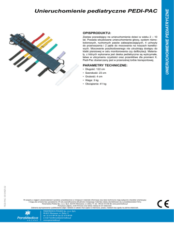 OPISPRODUKTU: Zestaw pozwalający na unieruchomienie dzieci w wieku 2 – 10 lat. Posiada wbudowane unieruchomienie głowy, system różnokolorowych, ruchomych pasów zabezpieczających, 4 uchwyty do przenoszenia i 2 pętle do mocowania na noszach karetkowych. Mocowanie poszkodowanego nie utrudniają dostępu do klatki piersiowej w celu monitorowania czy defibrylacji. Materiały, z których wykonana jest deska pediatryczna są wytrzymałe, łatwe w utrzymaniu czystości oraz przenikliwe dla promieni X. Pedi-Pac dostarczany jest w przenośnej torbie transportowej. PARAMETRY TECHNICZNE: • Długość: 122 cm • Szerokość: 23 cm • Grubość: 4 cm • Waga: 3 kg PEDI-PAC: 0513WER.02 • Obciążenie: 41 kg W związku z ciągłym udoskonalaniem wyrobów, przedstawione w niniejszym materiale informacje oraz dane techniczne mają wyłącznie charakter orientacyjny i mogą ulec zmianie bez uprzedzenia. W celu zweryfikowania aktualności niniejszego materiału należy skontaktować się z przedstawicielem firmy Paramedica Polska Sp. z o.o. Sp.k. 02-815 Warszawa; ul. Żołny 11; tel: +48 22 313 09 39; www.paramedica.pl Powyższe zdjęcia, znaki firmowe oraz teksty należą do ich właścicieli. Zabrania się kopiowania i publikowania zdjęć i tekstów w całości i/lub części w internecie, prasie, mediach bez zgody na piśmie właścicieli. PARAMEDICA POLSKA Sp. z o.o. Sp.k. 02-815 Warszawa, ul. Żołny 11 tel. 22 313 09 39, fax 22 313 09 59 e-mail: [email protected] www.paramedica.pl UNIERUCHOMIENIE PEDIATRYCZNE Unieruchomienie pediatryczne PEDI-PAC