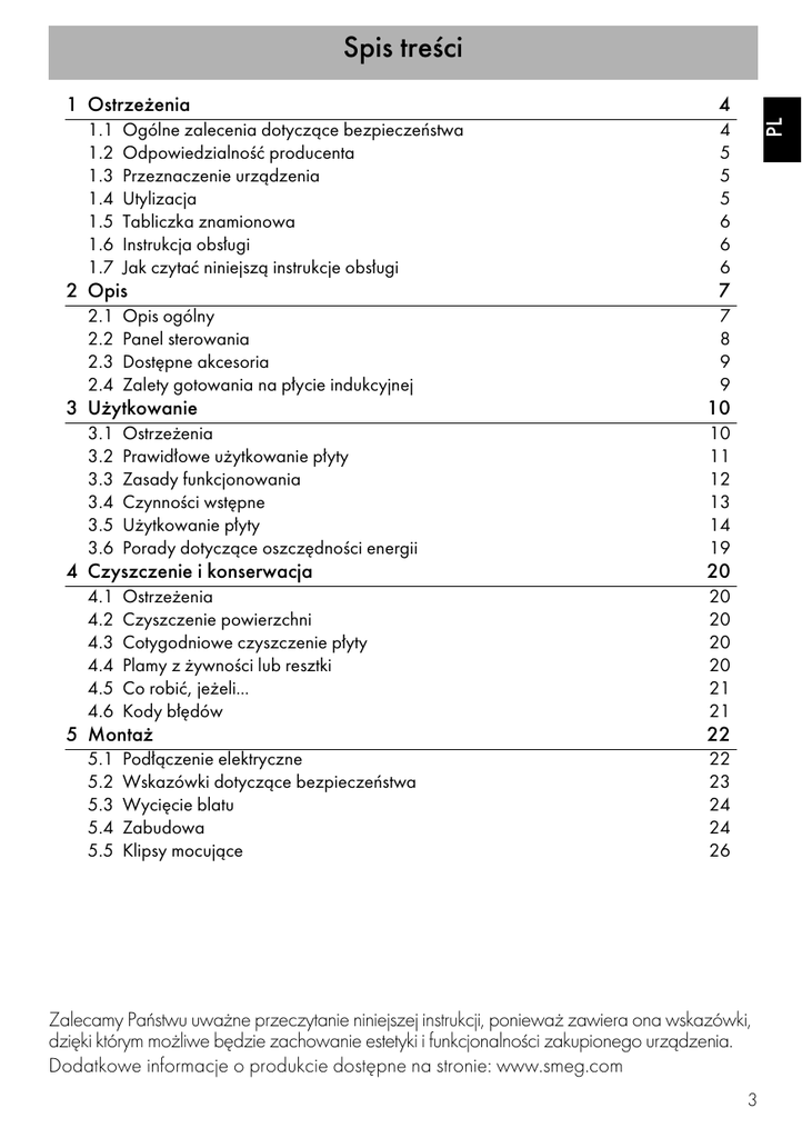 Spis treści 1.1 1.2 1.3 1.4 1.5 1.6 1.7 Ogólne zalecenia dotyczące bezpieczeństwa Odpowiedzialność producenta Przeznaczenie urządzenia Utylizacja Tabliczka znamionowa Instrukcja obsługi Jak czytać niniejszą instrukcje obsługi 4 4 5 5 5 6 6 6 2 Opis 7 2.1 2.2 2.3 2.4 7 8 9 9 Opis ogólny Panel sterowania Dostępne akcesoria Zalety gotowania na płycie indukcyjnej 3 Użytkowanie 3.1 3.2 3.3 3.4 3.5 3.6 Ostrzeżenia Prawidłowe użytkowanie płyty Zasady funkcjonowania Czynności wstępne Użytkowanie płyty Porady dotyczące oszczędności energii 4 Czyszczenie i konserwacja 4.1 4.2 4.3 4.4 4.5 4.6 Ostrzeżenia Czyszczenie powierzchni Cotygodniowe czyszczenie płyty Plamy z żywności lub resztki Co robić, jeżeli... Kody błędów 5 Montaż 5.1 5.2 5.3 5.4 5.5 Podłączenie elektryczne Wskazówki dotyczące bezpieczeństwa Wycięcie blatu Zabudowa Klipsy mocujące PL 1 Ostrzeżenia 10 10 11 12 13 14 19 20 20 20 20 20 21 21 22 22 23 24 24 26 Zalecamy Państwu uważne przeczytanie niniejszej instrukcji, ponieważ zawiera ona wskazówki, dzięki którym możliwe będzie zachowanie estetyki i funkcjonalności zakupionego urządzenia. Dodatkowe informacje o produkcie dostępne na stronie: www.smeg.com 3 Ostrzeżenia 1 Ostrzeżenia 1.1 Ogólne zalecenia dotyczące bezpieczeństwa Szkody powstałe na osobach • Urządzenie i jego elementy są bardzo gorące podczas użytkowania. • Podczas użytkowania nie należy dotykać elementów grzejnych. • Dzieci poniżej 8 roku życia nie powinny przebywać w pobliżu urządzenia bez opieki osoby dorosłej. • Urządzenie nie służy do zabawy. • Podczas użytkowania nie kłaść na urządzeniu metalowych przedmiotów takich, jak widelce, łyżki i pokrywki. • Po zakończeniu użytkowania wyłączyć urządzenie. • Nie należy nigdy próbować gasić płomienia lub pożaru wodą: wyłączyć urządzenie i nakryć płomień pokrywą lub ognioodporną narzutą. • Czynności związane z czyszczeniem i konserwacją nie powinny być wykonywane przez dzieci bez nadzoru. • Montaż i naprawy powinny być wykonywane przez wykwalifikowany personel zgodnie z obowiązującymi przepisami. 4 • Nie wprowadzać zmian na urządzeniu. • Nie wkładać ostro zakończonych metalowych przedmiotów (sztućce lub przyrządy) do szczelin. • Nigdy nie należy próbować naprawiać urządzenia samodzielnie lub bez pomocy wykwalifikowanego specjalisty. • Jeśli przewód zasilania elektrycznego jest uszkodzony, należy natychmiast skontaktować się z serwisem technicznym, który dokona jego wymiany. Uszkodzenie urządzenia • Nie stosować ściernych lub agresywnych detergentów (np. produktów z granulkami, odplamiaczy i gąbek metalowych) na częściach szklanych. • Ewentualnie używać drewnianych lub plastikowych narzędzi. • Nie siadać na urządzeniu. • Nie stosować pary do czyszczenia urządzenia. • Nie zatykać otworów, szczelin wentylacyjnych i odprowadzających ciepło. • Nie zostawiać urządzenia bez nadzoru podczas gotowania potraw, które mogą wydzielać tłuszcz lub olej. • Nie zostawiać przedmiotów na powierzchniach gotowania. • W żadnym razie nie używać urządzenia do ogrzewania pomieszczeń. Informacje na temat omawianego urządzenia • Nie polegać wyłącznie na ewentualnym czujniku obecności garnka. • Jeżeli obecny, przed otwarciem usunąć z pokrywy ewentualny płyn, który się wylał. • Przed zamknięciem pokrywy, poczekać na całkowite ostudzenie płyty kuchennej. • Jeżeli pojawią się rysy, pęknięcia lub powierzchnia płyty witroceramicznej całkowicie pęknie, należy natychmiast wyłączyć urządzenie. Odłączyć zasilanie elektryczne i skontaktować się z Serwisem Technicznym. • Osoby posiadające rozrusznik serca lub inne podobne urządzenia powinny się upewnić, czy ich funkcjonowanie nie zostanie zakłócone przez pole indukcyjne, którego częstotliwość zawiera się w przedziale od 20 do 50 kHz. • Zgodnie z przepisami dotyczącymi kompatybilności elektromagnetycznej, płyta indukcyjna należy do grupy 2 i klasy b (en 55011). 1.2 Odpowiedzialność producenta Producent nie ponosi żadnej odpowiedzialności za szkody osobowe lub rzeczowe powstałe w wyniku: • użycia urządzenia w sposób niezgodny z przeznaczeniem; • nieprzestrzegania zaleceń zawartych w instrukcji użytkowania; • naruszenia chociaż jednej części urządzenia; • używania nieoryginalnych części zamiennych. 1.3 Przeznaczenie urządzenia • Urządzenie jest przeznaczone do przyrządzania potraw w warunkach domowych. Każde inne użycie jest nieprawidłowe. • Urządzenie może być używane przez dzieci powyżej 8 roku życia oraz osoby o ograniczonych zdolnościach psychofizycznych lub nieposiadające odpowiedniego doświadczenia lub wiedzy pozostające pod kontrolą osób dorosłych odpowiedzialnych za ich bezpieczeństwo. • Urządzenie nie zostało zaprojektowane do działania w zmiennej temperaturze zewnętrznej lub w połączeniu z systemami zdalnego sterowania. 1.4 Utylizacja Urządzenie należy poddać utylizacji oddzielnie od innych odpadów (dyrektywy 2002/95/ WE, 2002/96/WE, 2003/108/WE). Urządzenie nie zawiera substancji w ilości niebezpiecznej dla zdrowia i środowiska, zgodnie z obowiązującymi dyrektywami europejskimi. Aby dokonać utylizacji urządzenia należy: • Odłączyć przewód zasilania elektrycznego i usunąć go razem z wtyczką. Napięcie elektryczne Niebezpieczeństwo porażenia prądem • Odłączyć główne zasilanie elektryczne. • Odłączyć przewód zasilający od instalacji elektrycznej. 5 PL Ostrzeżenia Ostrzeżenia • Powierzyć urządzenie odpowiednim centrom selektywnej zbiórki odpadów elektrycznych i elektronicznych lub oddać sprzedawcy w momencie zakupu podobnego urządzenia. Opakowanie urządzenia zostało wykonane z materiałów, które nie mają wpływu na środowisko i nadają się do recyklingu. • Materiały z opakowania należy