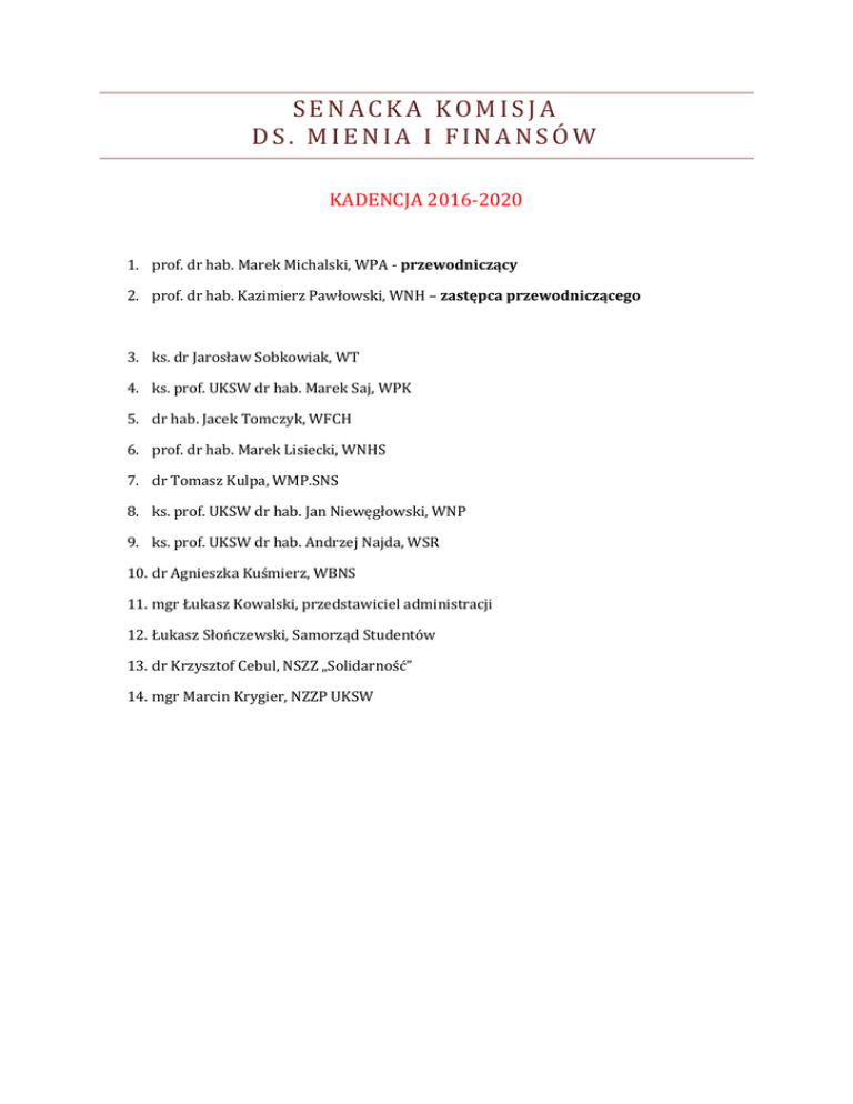 SENACKA KOMISJA DS. MIENIA I FINANSÓW KADENCJA 2016-2020 1. prof. dr hab. Marek Michalski, WPA - przewodniczący 2. prof. dr hab. Kazimierz Pawłowski, WNH – zastępca przewodniczącego 3. ks. dr Jarosław Sobkowiak, WT 4. ks. prof. UKSW dr hab. Marek Saj, WPK 5. dr hab. Jacek Tomczyk, WFCH 6. prof. dr hab. Marek Lisiecki, WNHS 7. dr Tomasz Kulpa, WMP.SNS 8. ks. prof. UKSW dr hab. Jan Niewęgłowski, WNP 9. ks. prof. UKSW dr hab. Andrzej Najda, WSR 10. dr Agnieszka Kuśmierz, WBNS 11. mgr Łukasz Kowalski, przedstawiciel administracji 12. Łukasz Słończewski, Samorząd Studentów 13. dr Krzysztof Cebul, NSZZ „Solidarność” 14. mgr Marcin Krygier, NZZP UKSW