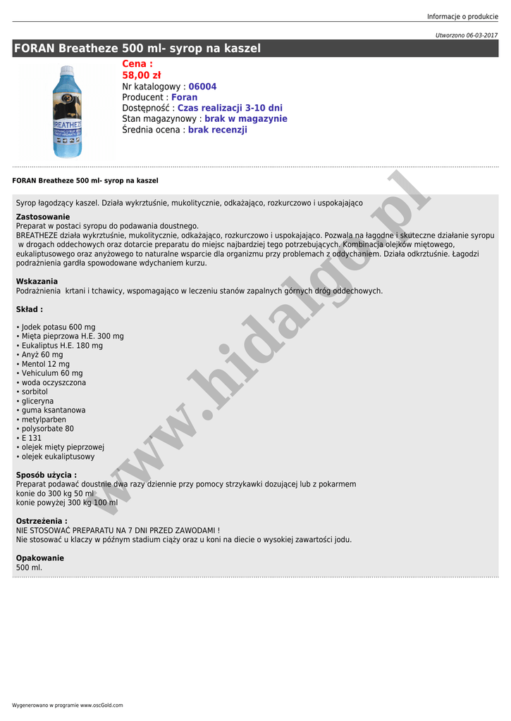 Informacje o produkcie Utworzono 06-03-2017 FORAN Breatheze 500 ml- syrop na kaszel Cena : 58,00 zł Nr katalogowy : 06004 Producent : Foran Dostępność : Czas realizacji 3-10 dni Stan magazynowy : brak w magazynie Średnia ocena : brak recenzji l FORAN Breatheze 500 ml- syrop na kaszel .p Syrop łagodzący kaszel. Działa wykrztuśnie, mukolitycznie, odkażająco, rozkurczowo i uspokajająco al go Zastosowanie Preparat w postaci syropu do podawania doustnego. BREATHEZE działa wykrztuśnie, mukolitycznie, odkażająco, rozkurczowo i uspokajająco. Pozwala na łagodne i skuteczne działanie syropu w drogach oddechowych oraz dotarcie preparatu do miejsc najbardziej tego potrzebujących. Kombinacja olejków miętowego, eukaliptusowego oraz anyżowego to naturalne wsparcie dla organizmu przy problemach z oddychaniem. Działa odkrztuśnie. Łagodzi podrażnienia gardła spowodowane wdychaniem kurzu. Skład : w w .h • Jodek potasu 600 mg • Mięta pieprzowa H.E. 300 mg • Eukaliptus H.E. 180 mg • Anyż 60 mg • Mentol 12 mg • Vehiculum 60 mg • woda oczyszczona • sorbitol • gliceryna • guma ksantanowa • metylparben • polysorbate 80 • E 131 • olejek mięty pieprzowej • olejek eukaliptusowy id Wskazania Podrażnienia krtani i tchawicy, wspomagająco w leczeniu stanów zapalnych górnych dróg oddechowych. w Sposób użycia : Preparat podawać doustnie dwa razy dziennie przy pomocy strzykawki dozującej lub z pokarmem konie do 300 kg 50 ml konie powyżej 300 kg 100 ml Ostrzeżenia : NIE STOSOWAĆ PREPARATU NA 7 DNI PRZED ZAWODAMI ! Nie stosować u klaczy w późnym stadium ciąży oraz u koni na diecie o wysokiej zawartości jodu. Opakowanie 500 ml. Wygenerowano w programie www.oscGold.com