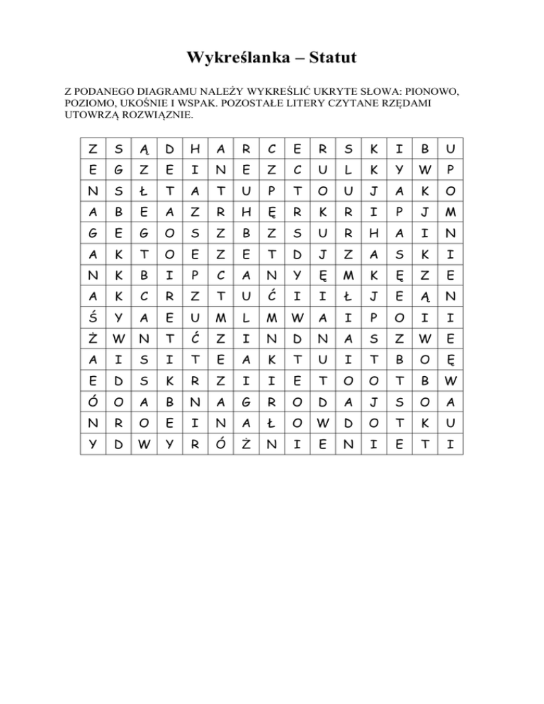 Wykreślanka – Statut Z PODANEGO DIAGRAMU NALEŻY WYKREŚLIĆ UKRYTE SŁOWA: PIONOWO, POZIOMO, UKOŚNIE I WSPAK. POZOSTAŁE LITERY CZYTANE RZĘDAMI UTOWRZĄ ROZWIĄZNIE. Z S Ą D H A R C E R S K I B U E G Z E I N E Z C U L K Y W P N S Ł T A T U P T O U J A K O A B E A Z R H Ę R K R I P J M G E G O S Z B Z S U R H A I N A K T O E Z E T D J Z A S K I N K B I P C A N Y Ę M K Ę Z E A K C R Z T U Ć I I Ł J E Ą N Ś Y A E U M L M W A I P O I I Ż W N T Ć Z I N D N A S Z W E A I S I T E A K T U I T B O Ę E D S K R Z I I E T O O T B W Ó O A B N A G R O D A J S O A N R O E I N A Ł O W D O T K U Y D W Y R Ó Ż N I E N I E T I SŁOWA DO WYKREŚLENIA: Zgłaszać wnioski, dobre imię ZHP, nosić mundur, życie ZHP, składki, nagana, wykluczenie, upomnienie, prawa, obowiązki, kary, odwołanie, nagroda, wyróżnienie, sąd harcerski, statut, orzeczenie. pwd. Katarzyna Ambrożkiewicz