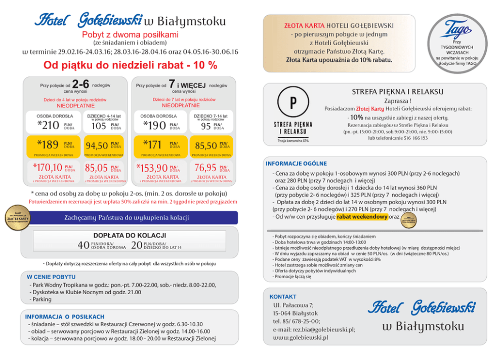 w Białymstoku Pobyt z dwoma posiłkami (ze śniadaniem i obiadem) w terminie 29.02.16-24.03.16; 28.03.16-28.04.16 oraz 04.05.16-30.06.16 Od piątku do niedzieli rabat - 10 % 2-6 noclegów Przy pobycie od cena wynosi Przy pobycie od *210 *189 PLN/ DOBA DZIECKO 4-14 lat w pokoju rodziców 105 94,50 PLN/ DOBA PLN/ DOBA PROMOCJA WEEKENDOWA *170,10 85,05 ZŁOTA KARTA i PROMOCJA WEEKENDOWA Zaprasza ! NIEODPŁATNIE PROMOCJA WEEKENDOWA PLN PLN/ DOBA STREFA PIĘKNA I RELAKSU Dzieci do 7 lat w pokoju rodziców NIEODPŁATNIE PLN/ DOBA noclegów cena wynosi Dzieci do 4 lat w pokoju rodziców OSOBA DOROSŁA 7 i WIĘCEJ PLN PLN/ DOBA OSOBA DOROSŁA w pokoju rodziców *190 95 *171 PLN/ DOBA 85,50 *153,90 - 10% na wszystkie zabiegi z naszej oferty. DZIECKO 7-14 lat PLN/ DOBA PROMOCJA WEEKENDOWA PLN PLN/ DOBA ZŁOTA KARTA ZŁOTA KARTA i PROMOCJA WEEKENDOWA Posiadaczom Złotej Karty Hoteli Gołębiewski oferujemy rabat: i PROMOCJA WEEKENDOWA PLN/ DOBA Rezerwacja zabiegów w Strefie Piękna i Relaksu (pn.-pt. 15:00-21:00, sob.9:00-21:00, nie. 9:00-15:00) lub telefonicznie 516 166 193 PLN/ DOBA PROMOCJA WEEKENDOWA 76,95 PLN PLN/ DOBA ZŁOTA KARTA i PROMOCJA WEEKENDOWA * cena od osoby za dobę w pokoju 2-os. (min. 2 os. dorosłe w pokoju) Potwierdzeniem rezerwacji jest wpłata 50% zaliczki na min. 2 tygodnie przed przyjazdem HOTELI GOŁĘBIEWSKI ZŁOTA KARTA HOTELI GOŁĘBIEWSKI - po pierwszym pobycie w jednym z Hoteli Gołębiewski otrzymacie Państwo Złotą Kartę. Złota Karta upoważnia do 10% rabatu. Zachęcamy Państwa do wykupienia kolacji - Cena za dobę w pokoju 1-osobowym wynosi 300 PLN (przy 2-6 noclegach) oraz 280 PLN (przy 7 noclegach i więcej) - Cena za dobę osoby dorosłej i 1 dziecka do 14 lat wynosi 360 PLN (przy pobycie 2- 6 noclegów) i 325 PLN (przy 7 noclegach i więcej) - Opłata za dobę 2 dzieci do lat 14 w osobnym pokoju wynosi 300 PLN (przy pobycie 2- 6 noclegów) i 270 PLN (przy 7 noclegach i więcej) - Od w/w cen przysługuje rabat weekendowy oraz HOTELI GOŁĘBIEWSKI DOPŁATA DO KOLACJI 40 20 14 W CENIE POBYTU - Park Wodny Tropikana w godz.: pon.-pt. 7.00-22.00, sob.- niedz. 8.00-22.00, - Dyskoteka w Klubie Nocnym od godz. 21.00 - Parking - śniadanie – stół szwedzki w Restauracji Czerwonej w godz. 6.30-10.30 - obiad – serwowany porcjowo w Restauracji Zielonej w godz. 14.00-16.00 - kolacja – serwowana porcjowo w godz. 18.00 - 20.00 w Restauracji Zielonej - Pobyt rozpoczyna się obiadem, kończy śniadaniem - Doba hotelowa trwa w godzinach 14:00-13:00 - Istnieje możliwość nieodpłatnego przedłużenia doby hotelowej (w miarę dostępności miejsc) - W dniu wyjazdu zapraszamy na obiad w cenie 50 PLN/os. (w dni świąteczne 80 PLN/os.) - Podane ceny zawierają podatek VAT w wysokości 8% - Hotel zastrzega sobie możliwość zmiany cen - Oferta dotyczy pobytów indywidualnych - Promocje łączą się KONTAKT Ul. Pałacowa 7; 15-064 Białystok tel. 85/ 678-25-00; e-mail: [email protected]; www.golebiewski.pl w Białymstoku