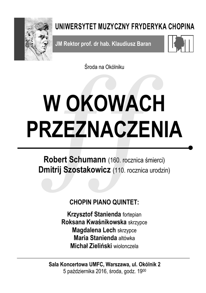 UNIWERSYTET MUZYCZNY FRYDERYKA CHOPINA JM Rektor prof. dr hab. Klaudiusz Baran ff Środa na Okólniku W OKOWACH PRZEZNACZENIA Robert Schumann (160. rocznica śmierci) Dmitrij Szostakowicz (110. rocznica urodzin) CHOPIN PIANO QUINTET: Krzysztof Stanienda fortepian Roksana Kwaśnikowska skrzypce Magdalena Lech skrzypce Maria Stanienda altówka Michał Zieliński wiolonczela Sala Koncertowa UMFC, Warszawa, ul. Okólnik 2 5 października 2016, środa, godz. 1900 Koncertowi towarzyszy promocja płyty zespołu Program ROBERT SCHUMANN (1810–1856) Kwintet fortepianowy Es-dur op. 44 (1842) I. II. III. IV. Allegro brillante Un modo d’una Marcia. Un poco largamente – Agitato Scherzo. Molto vivace – Trio I – Trio II. L’istesso tempo – Coda Allegro ma non troppo Przerwa DMITRIJ SZOSTAKOWICZ (1906–1975) Kwintet fortepianowy g-moll op. 57 (1940) I. II. III. IV. V. Prelude. Lento Fugue. Adagio Scherzo. Allegretto Intermezzo. Lento Finale. Allegretto Chopin Piano Quintet: KRZYSZTOF STANIENDA fortepian ROKSANA KWAŚNIKOWSKA skrzypce MAGDALENA LECH skrzypce MARIA STANIENDA altówka MICHAŁ ZIELIŃSKI wiolonczela fot. Associazione Scorribande Flash Chopin Piano Quintet Krzysztof Stanienda fortepian Roksana Kwaśnikowska skrzypce Magdalena Lech skrzypce Maria Stanienda altówka Michał Zieliński wiolonczela Chopin Piano Quintet tworzą muzycy związani z Uniwersytetem Muzycznym Fryderyka Chopina w Warszawie, którzy postanowili wspólnie zgłębiać kunszt muzycznego dialogu. Obecny skład zespołu rozpoczął współpracę jesienią 2013 roku i po krótkiej współpracy, bo już w kwietniu 2014 roku, został laureatem Międzynarodowego Konkursu Muzyki Kameralnej im. Stasysa Vainiūnasa na Litwie. Kolejne laury otrzymane podczas konkursowego tournée po Włoszech w czerwcu 2014 roku (I miejsce na Międzynarodowym Konkursie Muzyki Kameralnej „Contessa Tina Orsi Anguissola Scotti” w Pianello Val Tidone oraz I miejsce w kategorii: muzyka kameralna i I miejsce na 12. Międzynarodowym Konkursie „Premio Citta di Padova” w Padwie) otworzyły im drogę do sal koncertowych w Polsce i Europie. Chopin Piano Quintet jest zapraszany na międzynarodowe festiwale, m.in. Quartetto di Bergamo, XX International Chamber Music Festival Lago di Garda 2015, Val Tidone Festival we Włoszech, Festiwal „Emanacje” w Lusławicach, Wieczory w Arsenale we Wrocławiu, Filharmonia Konesera w Filharmonii Śląskiej. Muzycy wchodzący w skład kwintetu są laureatami wielu solistycznych i kameralnych konkursów ogólnopolskich i międzynarodowych. Kunszt pracy w zespole doskonalą pod kierunkiem takich pedagogów, jak Maja Nosowska, Corina Belcea, Jan Stanienda, Andrzej Bauer czy Krystyna Makowska-Ławrynowicz. Historia zespołu sięga 2005 roku, kiedy to z inicjatywy Krzysztofa Staniendy i grupy studentów ówczesnej Akademii Muzycznej im. Fryderyka Chopina w Warszawie powstał Chopin Quintet. Przez kolejne lata zespół ten występował na wielu festiwalach i konkursach, zdobył m.in. nagrodę specjalną za utwór kompozytora polskiego na Międzynarodowym Konkursie Kameralnym im. Kiejstuta Bacewicza w Łodzi (2007), a także był finalistą Gianni Bergamo Classic Music Award w Lugano (Szwajcaria 2009). W 2007 roku, wspólnie z kompozytorem Marcinem Błażewiczem kwintet został zaproszony na plener muzyczny do Hiszpanii, gdzie dzięki finansowemu wsparciu Krzysztofa Musiała, mecenasa kultury i właściciela galerii „ATak” w Warszawie, mógł pracować nad swoim repertuarem, m.in. kwintetem fortepianowym Marcina Błażewicza. Wyjazd ten dał impuls do dalszej pracy i rozwoju zespołu, który trwa do dnia dzisiejszego. Chopin Piano Quintet posiada w swoim repertuarze zarówno polskie kwintety fortepianowe Juliusza Zarębskiego, Grażyny Bacewicz, Marcina Błażewicza, Tadeusza Paciorkiewicza, jak i arcydzieła muzyki kameralnej Roberta Schumanna, Dmitrija Szostakowicza, Johannesa Brahmsa, Césara Francka, Edvarda Elgara, Antonína Dvořáka i innych, a także transkrypcje utworów Fryderyka Chopina. fot. Associazione Scorribande Flash Chopin Piano Quintet jest tegorocznym laureatem programu stypendialnego Ministra Kultury i Dziedzictwa Narodowego „Młoda Polska”. realizacja nagrania Przemysław Kunda Ewa Majcherczyk opieka dydaktyczna ad dr hab. Ewa Lasocka Zapraszamy na następne koncerty ff PAŹDZIERNIK Piątek, godz. 1200, wstęp wolny Ł u k Część artystyczna: Łukasz Dyczko Agnieszka Kopacka-Aleksandrowicz a Niedziela, godz. 17 , bezpłatne karty wstępu s NASI LAUREACI z Paweł Trojak Adam Maksymienko INAUGURACJA ROKU AKADEMICKIEGO 2016/2017 7 Wykład inauguracyjny: prof. dr hab. Jerzy Miziołek (UW) Warszawskie Miejsca Chopina– od Szkoły Głównej Muzyki do Uniwersytetu Muzycznego saksofon, 9 fortepian, Adam Woch gitara 00 baryton, akordeon Poniedziałek, godz. 1900, bezpłatne karty wstępu 10 C na przestrzeni dwóch stuleci h Pedagodzy Moskiewskiego Konserwatorium Państwowego im. Piotra Czajkowskiego: r Diaczenko Mirosława Florczak Stanisław Środa, godz. 19 , bilety – 15 zł z MUZYKA BEZ GRANICę GRUPPO DI TEMPERA: Agata Igras Sebastian Aleksandrowicz Adrian Janda Artur Kaspereks Tomasz Bińkowski Agnieszka Kopacka-Aleksandrowicz z Niedziela, godz. 17 , bezpłatne karty wstępu c KONCERT PAPIESKI Ad honorem Sanctae Joannis z Pauli II Zespół Wokalny Kół Naukowych UMFC, y Monika Targosz, Paulina Synoradzka Aleksander Słojewski, Marta Dziubińska, Zespół Wokalny Kierunku Muzyka Kościelna UMFC, Kinga Witczak k Wyszyńskiego, Michał Sławecki Chór Uniwersytetu Kardynała Stefana ZAGRANICZNI GOŚCIE POETYKA ROMANSU ROSYJSKIEGO sopran, fortepian 00 12 flet, fagot, fortepian klarnet, obój, waltornia, 00 16 dyrygenci, dyrygent, dyrygent Środa na Okólniku → bilety po 15 zł (także przez Internet: www.umfc.bilety24.pl) Koncerty niedzielne i poniedziałkowe → bezpłatne karty wstępu Dystrybucja: Pianista, najwcześniej z wyprzedzeniem tygodniowym w Chopin University Press w h