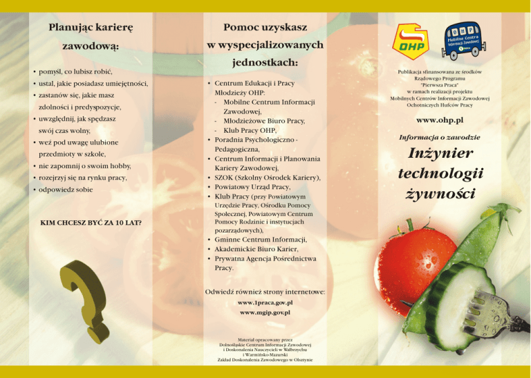 Planuj¹c karierê Pomoc uzyskasz zawodow¹: w wyspecjalizowanych jednostkach: • pomyœl, co lubisz robiæ, • ustal, jakie posiadasz umiejêtnoœci, • zastanów siê, jakie masz zdolnoœci i predyspozycje, • uwzglêdnij, jak spêdzasz swój czas wolny, • weŸ pod uwagê ulubione przedmioty w szkole, • nie zapomnij o swoim hobby, • rozejrzyj siê na rynku pracy, • odpowiedz sobie KIM CHCESZ BYÆ ZA 10 LAT? • Centrum Edukacji i Pracy M³odzie¿y OHP: - Mobilne Centrum Informacji Zawodowej, - M³odzie¿owe Biuro Pracy, - Klub Pracy OHP, • Poradnia Psychologiczno Pedagogiczna, • Centrum Informacji i Planowania Kariery Zawodowej, • SZOK (Szkolny Oœrodek Kariery), • Powiatowy Urz¹d Pracy, • Klub Pracy (przy Powiatowym Urzêdzie Pracy, Oœrodku Pomocy Spo³ecznej, Powiatowym Centrum Pomocy Rodzinie i instytucjach pozarz¹dowych), • Gminne Centrum Informacji, • Akademickie Biuro Karier, • Prywatna Agencja Poœrednictwa Pracy. OdwiedŸ równie¿ strony internetowe: www.1praca.gov.pl www.mgip.gov.pl Materia³ opracowany przez Dolnoœl¹skie Centrum Informacji Zawodowej i Doskonalenia Nauczycieli w Wa³brzychu i Warmiñsko-Mazurski Zak³ad Doskonalenia Zawodowego w Olsztynie Publikacja sfinansowana ze œrodków Rz¹dowego Programu "Pierwsza Praca" w ramach realizacji projektu Mobilnych Centrów Informacji Zawodowej Ochotniczych Hufców Pracy www.ohp.pl Informacja o zawodzie In¿ynier technologii ¿ywnoœci Funkcje i zadania: • in¿ynier technologii ¿ywnoœci prowadzi badania, opracowuje technologie, doradza i kieruje przemys³owymi procesami przetwarzania i utrwalania surowców roœlinnych (zbo¿a, surowce oleiste, owoce, warzywa, ziemniaki, buraki cukrowe, tytoñ) i surowców pochodzenia zwierzêcego (miêso, ryby, mleko, jaja); • zajmuje siê technologi¹ ¿ywienia cz³owieka; • prowadzi badania i doradztwo w zakresie nowoczesnych technik podnoszenia jakoœci produktów ¿ywnoœciowych; • opracowuje instrukcje technologiczne, receptury, wymagania jakoœciowe produktów, standardy kontroli, normy ¿ywieniowe dla ró¿nych grup ludnoœci (w zale¿noœci od wieku i rodzaju pracy); Predyspozycje do zawodu: • in¿ynieria technologii ¿ywnoœci jest dziedzin¹ interdyscyplinarn¹, wymaga wiedzy z zakresu chemii, biologii, techniki czy fizyki; • bardzo wa¿na jest sprawnoœæ zmys³ów: powonienia, smaku, dotyku, a tak¿e zdolnoœæ do rozró¿niania barw; • po¿¹dane w tym zawodzie cechy charakteru to: zdolnoœci organizacyjne, umiejêtnoœæ porozumiewania siê z ludŸmi oraz podejmowania szybkich i trafnych decyzji; • atutem s¹ uzdolnienia techniczne, rozumienie zasad dzia³ania maszyn i przebiegaj¹cych w nich procesów; • praca ta wymaga zdolnoœci do koncentracji i dok³adnoœci, które maj¹ wp³yw na poprawnoœæ przeprowadzanych badañ. Mo¿liwoœci zdobycia zawodu: • in¿ynier technologii ¿ywnoœci musi mieæ wykszta³cenie wy¿sze. Mo¿na je uzyskaæ w wiêkszoœci uczelni rolniczych oraz (w zakresie poszczególnych specjalnoœci) w niektórych uczelniach technicznych; • w zale¿noœci od szko³y oraz specjalizacji w wymienionych placówkach mo¿na uzyskaæ wykszta³cenie wy¿sze zawodowe, magisterskie lub magisterskie uzupe³niaj¹ce w trybie studiów dziennych, wieczorowych oraz eksternistycznych; • dla przysz³ego pracodawcy bardzo wa¿ne jest doœwiadczenie zawodowe kandydata, poszukiwani s¹ przede wszystkim specjaliœci o d³ugim sta¿u, zarówno kobiety jak i mê¿czyŸni; • du¿ym atutem jest umiejêtnoœæ pos³ugiwania siê komputerem oraz znajomoœæ jêzyków obcych. • wprowadza nowe receptury do produkcji na skalê przemys³ow¹. Wiêcej szczegó³ów znajdziesz w teczce informacji o zawodzie