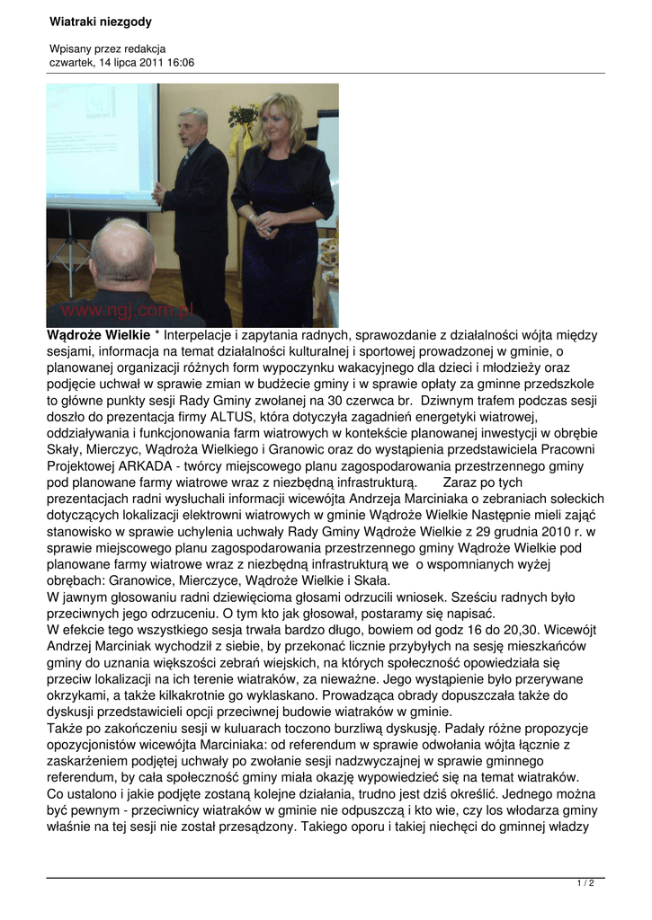 Wiatraki niezgody Wpisany przez redakcja czwartek, 14 lipca 2011 16:06 Wądroże Wielkie * Interpelacje i zapytania radnych, sprawozdanie z działalności wójta między sesjami, informacja na temat działalności kulturalnej i sportowej prowadzonej w gminie, o planowanej organizacji różnych form wypoczynku wakacyjnego dla dzieci i młodzieży oraz podjęcie uchwał w sprawie zmian w budżecie gminy i w sprawie opłaty za gminne przedszkole to główne punkty sesji Rady Gminy zwołanej na 30 czerwca br. Dziwnym trafem podczas sesji doszło do prezentacja firmy ALTUS, która dotyczyła zagadnień energetyki wiatrowej, oddziaływania i funkcjonowania farm wiatrowych w kontekście planowanej inwestycji w obrębie Skały, Mierczyc, Wądroża Wielkiego i Granowic oraz do wystąpienia przedstawiciela Pracowni Projektowej ARKADA - twórcy miejscowego planu zagospodarowania przestrzennego gminy pod planowane farmy wiatrowe wraz z niezbędną infrastrukturą. Zaraz po tych prezentacjach radni wysłuchali informacji wicewójta Andrzeja Marciniaka o zebraniach sołeckich dotyczących lokalizacji elektrowni wiatrowych w gminie Wądroże Wielkie Następnie mieli zająć stanowisko w sprawie uchylenia uchwały Rady Gminy Wądroże Wielkie z 29 grudnia 2010 r. w sprawie miejscowego planu zagospodarowania przestrzennego gminy Wądroże Wielkie pod planowane farmy wiatrowe wraz z niezbędną infrastrukturą we o wspomnianych wyżej obrębach: Granowice, Mierczyce, Wądroże Wielkie i Skała. W jawnym głosowaniu radni dziewięcioma głosami odrzucili wniosek. Sześciu radnych było przeciwnych jego odrzuceniu. O tym kto jak głosował, postaramy się napisać. W efekcie tego wszystkiego sesja trwała bardzo długo, bowiem od godz 16 do 20,30. Wicewójt Andrzej Marciniak wychodził z siebie, by przekonać licznie przybyłych na sesję mieszkańców gminy do uznania większości zebrań wiejskich, na których społeczność opowiedziała się przeciw lokalizacji na ich terenie wiatraków, za nieważne. Jego wystąpienie było przerywane okrzykami, a także kilkakrotnie go wyklaskano. Prowadząca obrady dopuszczała także do dyskusji przedstawicieli opcji przeciwnej budowie wiatraków w gminie. Także po zakończeniu sesji w kuluarach toczono burzliwą dyskusję. Padały różne propozycje opozycjonistów wicewójta Marciniaka: od referendum w sprawie odwołania wójta łącznie z zaskarżeniem podjętej uchwały po zwołanie sesji nadzwyczajnej w sprawie gminnego referendum, by cała społeczność gminy miała okazję wypowiedzieć się na temat wiatraków. Co ustalono i jakie podjęte zostaną kolejne działania, trudno jest dziś określić. Jednego można być pewnym - przeciwnicy wiatraków w gminie nie odpuszczą i kto wie, czy los włodarza gminy właśnie na tej sesji nie został przesądzony. Takiego oporu i takiej niechęci do gminnej władzy 1/2 Wiatraki niezgody Wpisany przez redakcja czwartek, 14 lipca 2011 16:06 już dawno na sesjach nie zaobserwowaliśmy. Sala aż kipiała z gniewu. Józef Noworól Na zdjęciu: Czy optowanie za budową farm wiatrowych na terenie gminy nie zaważy na losach gminnych włodarzy, wójta Seweryna Sterca i jego zastępcy, Andrzeja Marciniaka (na zdjęciu z przewodniczącą Rady Gminy Elżbietą Jedlecką)? 2/2