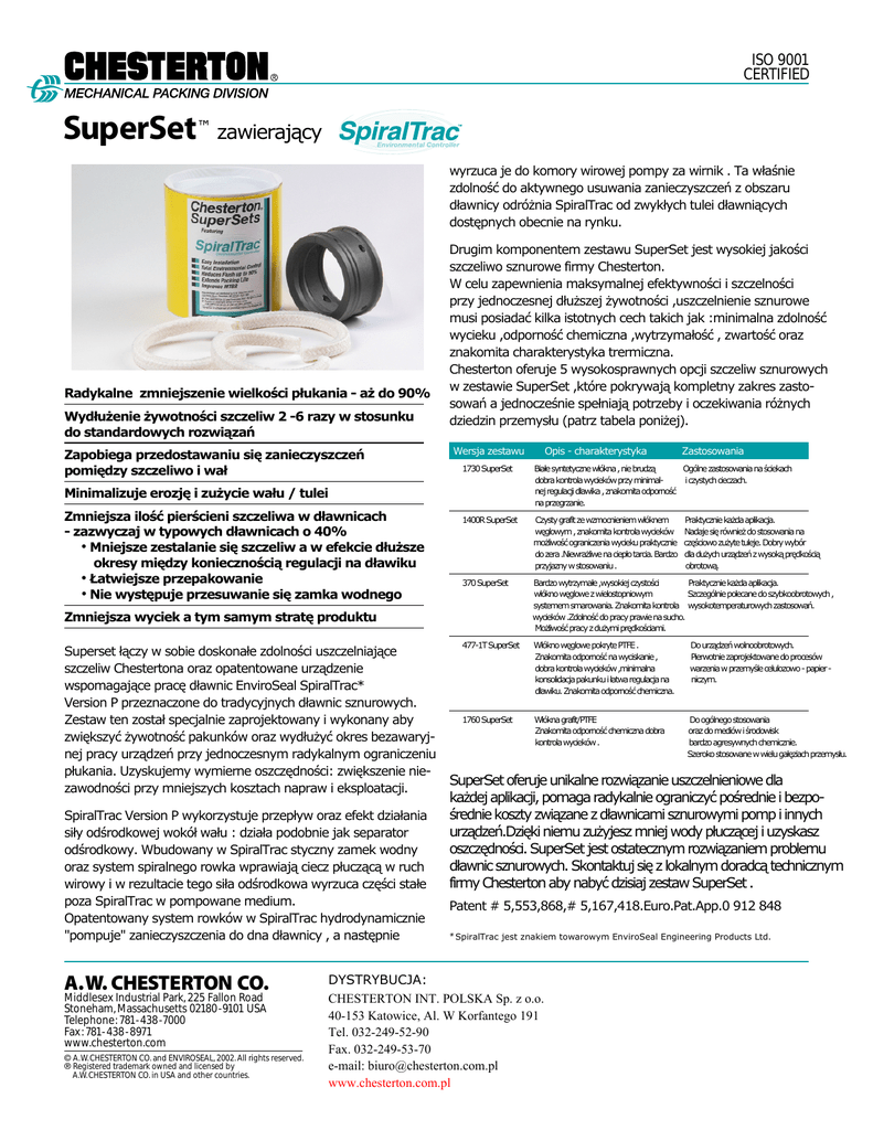 ISO 9001 CERTIFIED SuperSet™ zawierający wyrzuca je do komory wirowej pompy za wirnik . Ta właśnie zdolność do aktywnego usuwania zanieczyszczeń z obszaru dławnicy odróżnia SpiralTrac od zwykłych tulei dławniących dostępnych obecnie na rynku. Radykalne zmniejszenie wielkości płukania - aż GR90% Wydłużenie żywotności szczeliw 2 -6 razy w stosunku do standardowych rozwiązań Zapobiega przedostawaniu się zanieczyszczeń pomiędzy szczeliwo i wał Drugim komponentem zestawu SuperSet jest wysokiej jakości szczeliwo sznurowe firmy Chesterton. W celu zapewnienia maksymalnej efektywności i szczelności przy jednoczesnej dłuższej żywotności ,uszczelnienie sznurowe musi posiadać kilka istotnych cech takich jak :minimalna zdolność wycieku ,odporność chemiczna ,wytrzymałość , zwartość oraz znakomita charakterystyka trermiczna. Chesterton oferuje 5 wysokosprawnych opcji szczeliw sznurowych w zestawie SuperSet ,które pokrywają kompletny zakres zastosowań a jednocześnie spełniają potrzeby i oczekiwania różnych dziedzin przemysłu (patrz tabela poniżej). Wersja zestawu 1400R SuperSet Czysty grafit ze wzmocnieniem włóknem węglowym , znakomita kontrola wycieków możliwość ograniczenia wycieku praktycznie do zera .Niewrażliwe na ciepło tarcia. Bardzo przyjazny w stosowaniu . 370 SuperSet Bardzo wytrzymałe ,wysokiej czystości Praktycznie każda aplikacja. włókno węglowe z wielostopniowym Szczególnie polecane do szybkoobrotowych , systemem smarowania. Znakomita kontrola wysokotemperaturowych zastosowań. wycieków .Zdolność do pracy prawie na sucho. Możliwość pracy z dużymi prędkościami. 477-1T SuperSet Włókno węglowe pokryte PTFE . Znakomita odporność na wyciskanie , dobra kontrola wycieków ,minimalna konsolidacja pakunku i łatwa regulacja na dławiku. Znakomita odporność chemiczna. 1760 SuperSet Włókna grafit/PTFE Znakomita odporność chemiczna dobra kontrola wycieków . Zmniejsza wyciek a tym samym stratę produktu Superset łączy w sobie doskonałe zdolności uszczelniające szczeliw Chestertona oraz opatentowane urządzenie wspomagające pracę dławnic EnviroSeal SpiralTrac* Version P przeznaczone do tUDGyF\MQ\FK dławnic sznurowych. =estaw ten został specjalnie zaprojektowany i wykonany aby zwiększyüĪywotnośü pakunków oraz wydłuĪyü okres bezawaryj nej pracy urządzeĔ przy jednoczesnym radykalnym ograniczeniu płukania. 8zyskujemy wymierne oszczędności zwiększenie nie zawodności przy mniejszych kosztach napraw i eksploatacji. SpiralTrac Version P Z\NRU]\VWXMHSU]HSá\ZRUD]HIHNWG]LDáDQLD VLá\RGĞURGNRZHMZRNyáZDáXG]LDáDSRGREQLHMDNVHSDUDWRU odśrodkowy. Wbudowany w SpiralTrac styczny zamek wodny oraz system spiralnego rowka wprawiają ciecz płuczącą w ruch wirowy i w rezultacie tego siła odśrodkowa wyrzuca części stałe poza SpiralTrac w pompowane medium. Opatentowany system rowków w SpiralTrac hydrodynamicznie "pompuje" zanieczyszczenia do dna dławnicy , a następnie A.W. CHESTERTON CO. Middlesex Industrial Park, 225 Fallon Road Stoneham, Massachusetts 02180 -9101 USA Telephone: 781- 438 -7000 Fax : 781- 438 - 8971 www.chesterton.com © A.W. CHESTERTON CO. and ENVIROSEAL, 2002. All rights reserved. ® Registered trademark owned and licensed by A.W. CHESTERTON CO. in USA and other countries. Zastosowania Białe syntetyczne włókna , nie brudzą Ogólne zastosowania na ściekach dobra kontrola wycieków przy minimali czystych cieczach. nej regulacji dławika , znakomita odporność na przegrzanie. Minimalizuje erozję i zużycie wału / tulei Zmniejsza ilość pierścieni szczeliwa w dławnicach - zazwyczaj w typowych dławnicach o 40% • Mniejsze zestalanie się szczeliw a w efekcie dłuższe okresy między koniecznością regulacji na dławiku • Łatwiejsze przepakowanie • Nie występuje przesuwanie się zamka wodnego Opis - charakterystyka 1730 SuperSet Praktycznie każda aplikacja. Nadaje się również do stosowania na częściowo zużyte tuleje. Dobry wybór dla dużych urządzeń z wysoką prędkością obrotową. Do urządzeń wolnoobrotowych. Pierwotnie zaprojektowane do procesów warzenia w przemyśle celulozowo - papier niczym. Do ogólnego stosowania oraz do mediów i środowisk bardzo agresywnych chemicznie. Szeroko stosowane w wielu gałęziach przemysłu. SuperSet oferuje unikalne rozwiązanie uszczelnieniowe dla każdej aplikacji, pomaga radykalnie ograniczyć pośrednie i bezpośrednie koszty związane z dławnicami sznurowymi pomp i innych urządzeń.Dzięki niemu zużyjesz mniej wody płuczącej i uzyskasz oszczędności. SuperSet jest ostatecznym rozwiązaniem problemu dławnic sznurowych. Skontaktuj się z lokalnym doradcą technicznym firmy Chesterton aby nabyć dzisiaj zestaw SuperSet . Patent # 5,553,868,# 5,167,418.Euro.Pat.App.0 912 848 * SpiralTrac jest znakiem towarowym EnviroSeal Engineering Products Ltd. DYSTRYBUCJA: Chesterton Polska z o.o. Sp. z o.o. CHESTERTON INT.Sp. POLSKA ul. Kościuszki 63 , 41-503 Chorzów 40-153 Katowice, Al. W Korfantego 191 tel. 2495-290 , tel/fax 2495-650 Tel. 032-249-52-90 Fax. 032-249-53-70 e-mail: [email protected] FORM NO. 071021 www.chesterton.com.pl PRINTED IN USA 1/02