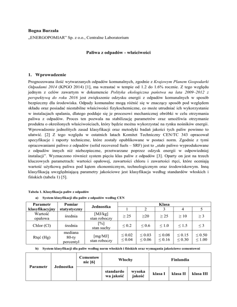 Bogna Burzała „ENERGOPOMIAR” Sp. z o.o., Centralne Laboratorium Paliwa z odpadów - właściwości 1. Wprowadzenie Prognozowana ilość wytwarzanych odpadów komunalnych, zgodnie z Krajowym Planem Gospodarki Odpadami 2014 (KPGO 2014) [1], ma wzrastać w tempie od 1.2 do 1.6% rocznie. Z tego względu jednym z celów zawartym w dokumencie Polityka ekologiczna państwa na lata 2009–2012 z perspektywą do roku 2016 jest zwiększenie odzysku energii z odpadów komunalnych w sposób bezpieczny dla środowiska. Odpady komunalne mogą różnić się w znaczący sposób pod względem składu oraz posiadać niestabilne właściwości fizykochemiczne, co może utrudniać ich wykorzystanie w instalacjach spalania, dlatego poddaje się je procesowi mechanicznej obróbki w celu otrzymania paliwa z odpadów. Proces ten pozwala na stabilizację parametrów oraz umożliwia otrzymanie produktu o określonych właściwościach, który będzie można wykorzystać na rynku nośników energii. Wprowadzenie jednolitych zasad klasyfikacji oraz metodyki badań jakości tych paliw powinno to ułatwić. [2] Z tego względu w ostatnich latach Komitet Techniczny CEN/TC 343 opracował specyfikacje i raporty techniczne, które zostały opublikowane w postaci norm. Zgodnie z tymi opracowaniami paliwo z odpadów (solid recovered fuels – SRF) jest to „stałe paliwo wyprodukowane z odpadów innych niż niebezpieczne, przetwarzane poprzez odzysk energii w odpowiedniej instalacji”. Wyznaczono również system pięciu klas paliw z odpadów [3]. Oparty on jest na trzech kluczowych parametrach: wartości opałowej, zawartości chloru i zawartości rtęci, które oceniają wartość użytkową paliwa pod kątem ekonomicznym, technologicznym oraz środowiskowym. Inną klasyfikacją uwzględniającą parametry jakościowe jest klasyfikacja według standardów włoskich i fińskich (tabela 1) [5]. Tabela 1. Klasyfikacja paliw z odpadów a) System klasyfikacji dla paliw z odpadów według CEN Parametr Pomiar klasyfikacyjny statystyczny Wartość średnia opałowa Chlor (Cl) średnia Rtęć (Hg) mediana 80-ty percentyl b) 1 2 Klasa 3 4 5 ≥ 25 ≥20 ≥ 25 ≥ 10 ≥3 ≤ 0.2 ≤ 0.6 ≤ 1.0 ≤ 1.5 ≤3 ≤ 0.02 ≤ 0.04 ≤ 0.03 ≤ 0.06 ≤ 0.08 ≤ 0.16 ≤ 0.15 ≤ 0.30 ≤ 0.50 ≤ 1.00 Jednostka [MJ/kg] stan roboczy [%] stan suchy [mg/MJ] stan roboczy System klasyfikacji dla paliw według norm włoskich i fińskich oraz wymagania jakościowe cementowni Cementow nie [6] Parametr Włochy Finlandia Jednostka standardo wa jakość wysoka jakość klasa I klasa II klasa III Wartość opałowa Zawartość wilgoci Zawartość popiołu Zawartość Cl Zawartość S Zawartość Hg Zawartość Cd+Tl Suma metali ciężkich MJ/kg >20 > 15 > 19 % < 20 < 25 < 15 < 20 < 13 0.9 < 0.7 < 0.15 < 0.5 < 1.5 mg/kg s.m. <7 <1 < 0.1 < 0.2 < 0.5 mg/kg s.m. - <4 < 1.0 < 4.0 < 5.0 < 1040 < 350 % % <0.7 % < 1.0 mg/kg s.m. <2000 Oprócz tych klasyfikacji wartości tych parametrów są uzależnione od rodzaju instalacji, w jakich mają być wykorzystane. Najczęściej muszą one spełnić wymagania, które są indywidualnie ustalane pomiędzy producentem a odbiorcą paliwa. W Polsce głównym odbiorcą paliw z odpadów jest przemysł cementowy. 2. Parametry paliwowe Paliwa z odpadów, aby mogły być w pełni wykorzystane jako nośnik energii, należy poddać analizie technicznej w celu poznania ich składu fizykochemicznego. Podstawowym parametrem określającym właściwości kaloryczne paliwa jest wartość opałowa, która w pierwszej kolejności decyduje, do jakiej klasy należy dane paliwo zakwalifikować. Skład surowych odpadów można określić na podstawie składników morfologicznych, do których zaliczamy substancje o zerowej wartości opałowej, takie jak: szkło, metale, ceramika (balast); substancje palne: drewno, tworzywa sztuczne, substancje organiczne, papier, tektura tekstylia oraz substancje o ujemnej wartości opałowej – wilgoć [7]. W trakcie wytwarzania paliw z odpadów producenci starają się otrzymać produkt o jak najwyższej wartości kalorycznej, wydzielając z odpadów palne składniki. Składniki te oprócz kalorii mogą zawierać wodę lub też ze względu na swoje właściwości higroskopijne (np. papier) pochłaniać ją podczas nieodpowiedniego przechowywania. Szkło, metale czy ceramika mogą zostać usunięte w większości w pierwszym etapie segregacji odpadów, ale frakcję mineralną zawierają również substancje organiczne. Wyznacza się ją w trakcie oznaczania popiołu. W celu poznania pełnej analizy technicznej należy wyznaczyć takie parametry jak: węgiel, wodór, siarkę czy części lotne. Tabela 2. Parametry paliwowe (wartości średnie) wybranych paliw z odpadów Parametr Parametry paliwowe (wartości średnie) jednostka stan Wilgoć całkowita % r 29.46 22.67 15.88 19.15 12.62 6.35 2.80 1.70 Popiół 550°C % d 17.94 19.47 18.62 15.09 22.29 18.40 7.94 3.98 Ciepło kJ/kg r 17686 17990 19130 21972 21962 23336 25640 36669 spalania Ciepło spalania kJ/kg d 24823 23332 22611 27162 25127 24904 26380 37303 Wartość opałowa kJ/kg r 15943 16336 17628 20232 20888 21808 24190 35159 Węgiel % d 50.72 52.82 47.52 61.49 54.14 60.01 Wodór % d 7.27 7.10 6.88 4.38 7.15 7.15 7.26 Azot % d 1.15 1.15 0.60 0.75 0.88 1.01 0.31 Siarka % d 0.21 0.35 0.35 0.20 0.95 0.30 0.10 1.36 Chlor % d 0.32 1.04 0.59 1.06 1.43 Rtęć mg/kg 0.25 0.12 0.45 0.03 3. Właściwości związane z aspektem technologiczny Drugim parametrem decydującym o klasie paliw jest chlor. Wpływa on na aspekt technologiczny procesu. Parametr ten wyznacza również temperaturę, w jakiej należy prowadzić proces termiczny. (Rozporządzenie Ministra Gospodarki z dnia 21 marca 2002 r. [8]). Zawartość chloru może powodować korozję instalacji poprzez tworzenie kwaśnych związków. Podobne niekorzystne właściwości wykazują również takie pierwiastki jak siarka czy fluor. Innym ważnym parametrem związanym z zagadnieniami technologi