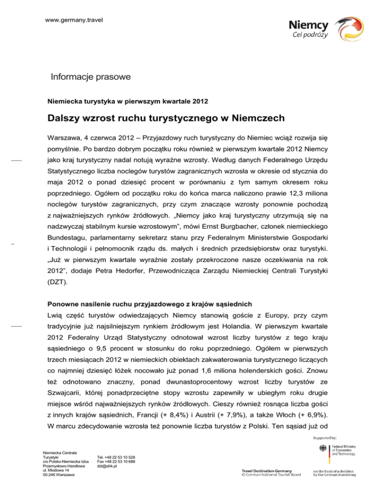 www.germany.travel Informacje prasowe Niemiecka turystyka w pierwszym kwartale 2012 Dalszy wzrost ruchu turystycznego w Niemczech Warszawa, 4 czerwca 2012 – Przyjazdowy ruch turystyczny do Niemiec wciąż rozwija się pomyślnie. Po bardzo dobrym początku roku również w pierwszym kwartale 2012 Niemcy jako kraj turystyczny nadal notują wyraźne wzrosty. Według danych Federalnego Urzędu Statystycznego liczba noclegów turystów zagranicznych wzrosła w okresie od stycznia do maja 2012 o ponad dziesięć procent w porównaniu z tym samym okresem roku poprzedniego. Ogółem od początku roku do końca marca naliczono prawie 12,3 miliona noclegów turystów zagranicznych, przy czym znaczące wzrosty ponownie pochodzą z najważniejszych rynków źródłowych. „Niemcy jako kraj turystyczny utrzymują się na nadzwyczaj stabilnym kursie wzrostowym”, mówi Ernst Burgbacher, członek niemieckiego Bundestagu, parlamentarny sekretarz stanu przy Federalnym Ministerstwie Gospodarki i Technologii i pełnomocnik rządu ds. małych i średnich przedsiębiorstw oraz turystyki. „Już w pierwszym kwartale wyraźnie zostały przekroczone nasze oczekiwania na rok 2012”, dodaje Petra Hedorfer, Przewodnicząca Zarządu Niemieckiej Centrali Turystyki (DZT). Ponowne nasilenie ruchu przyjazdowego z krajów sąsiednich Lwią część turystów odwiedzających Niemcy stanowią goście z Europy, przy czym tradycyjnie już najsilniejszym rynkiem źródłowym jest Holandia. W pierwszym kwartale 2012 Federalny Urząd Statystyczny odnotował wzrost liczby turystów z tego kraju sąsiedniego o 9,5 procent w stosunku do roku poprzedniego. Ogółem w pierwszych trzech miesiącach 2012 w niemieckich obiektach zakwaterowania turystycznego liczących co najmniej dziesięć łóżek nocowało już ponad 1,6 miliona holenderskich gości. Znowu też odnotowano znaczny, ponad dwunastoprocentowy wzrost liczby turystów ze Szwajcarii, której ponadprzeciętne stopy wzrostu zapewniły w ubiegłym roku drugie miejsce wśród najważniejszych rynków źródłowych. Cieszy również rosnąca liczba gości z innych krajów sąsiednich, Francji (+ 8,4%) i Austrii (+ 7,9%), a także Włoch (+ 6,9%). W marcu zdecydowanie wzrosła też ponownie liczba turystów z Polski. Ten sąsiad już od Niemiecka Centrala Turystyki c/o Polsko-Niemiecka Izba Przemysłowo-Handlowa ul. Miodowa 14 00-246 Warszawa Tel. +48 22 53 10 528 Fax +48 22 53 10 688 [email protected] www.germany.travel czerwca 2010 notuje ponadprzeciętny wzrost, a od początku tego roku wzrost ten przybiera na sile. W okresie od stycznia do marca w Niemczech nocowało o ponad 31 procent więcej polskich turystów. Państwa BRIC wciąż na silnym kursie wzrostowym W dużej mierze do wzrostu liczby turystów zagranicznych przyczyniły się także państwa BRIC. Rosja wykazała najsilniejszy, ponad 24-procentowy wzrost. Tuż za nią plasuje się Brazylia, która uzyskała również znaczny, 23-procentowy wzrost. Nadal bardzo pomyślnie rozwijają się w tym kierunku także Indie (20 procent) i Chiny (20,8 procent). Zagraniczni goście wygenerowali prawie jedną trzecią wydatków konsumenckich w 2011 roku Zagraniczni goście nie tylko zapewniają stały wzrost liczby noclegów turystycznych w Niemczech, ale mają także istotny wkład w całkowity obrót z ruchu turystycznego. Fakt ten uwydatnia najnowsze studium Niemieckiego Instytutu Badań Gospodarczych (DIW). „Goście z zagranicy wydają podczas swoich podróży 34,1 miliardów euro rocznie w Niemczech - to prawie jedna trzecia wszystkich wydatków konsumenckich związanych z turystyką”, podkreśla Petra Hedorfer. Ta tendencja utrzymuje się również w tym roku. Według najnowszych danych doradcy finansowego Global Blue w pierwszym kwartale 2012 już zarejestrowano 364 miliony euro wydanych na zakupy zwolnione z podatku (Tax Free): to plus o ponad 50 procent w porównaniu z tym samym okresem w roku 2011. Najaktywniejsi są w tym obszarze goście rosyjscy: ich zakupy stanowiły w pierwszym kwartale 30 procent obrotów z zakupów zwolnionych z podatku ogółem. Zaraz za Rosjanami znaleźli się turyści chińscy z 27 procentami. Szczególną popularnością pod względem turystyki zakupowej cieszą się Monachium, Frankfurt i Berlin. Na te metropolie przypadło odpowiednio około 22, 21 i 15 procent obrotów z zakupów zwolnionych z podatku ogółem w pierwszym kwartale 2012. O DZT Niemiecka Centrala Turystyki (DZT) to narodowa „izba turystyki” Niemiec z siedzibą główną we Frankfurcie nad Menem. Centrala zajmuje się promowaniem Niemiec jako kraju turystycznego na zlecenie Federalnego Ministerstwa Gospodarki i Technologii (BMWi), które wspiera ją na mocy uchwały niemieckiego Bundestagu. DZT zajmuje się tworzeniem strategii i produktów oraz działaniami marketingowymi w celu dalszego umocnienia pozytywnego wizerunku Niemiec za granicą jako celu podróży oraz wspierania turystyki niemieckiej. DZT posiada 30 przedstawicielstw zagranicznych na całym świecie. Bliższe informacje można znaleźć w naszym internetowym centrum prasowym na stronie www.germany.travel/presse. Niemiecka Centrala Turystyki c/o Polsko-Niemiecka Izba Przemysłowo-Handlowa ul. Miodowa 14 00-246 Warszawa Tel. +48 22 53 10 528 Fax +48 22 53 10 688 [email protected]
