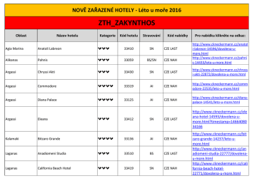 NOVĚ ZAŘAZENÉ HOTELY - Léto u moře 2016 ZTH_ZAKYNTHOS Oblast Název hotelu Kategorie Kód hotelu Stravování Kód nabídky Pro nabídku klikněte na odkaz: http://www.ckneckermann.cz/anatol i-labreon-14596/dovolena-umore.html http://www.ckneckermann.cz/pahni s-14433/leto-u-more.html Agia Marina Anatoli Labreon d 33410 SN CZE LAST Alikanas Pahnis d 33059 BS/SN CZE NAH Argassi Chryssi Akti d 33430 SN CZE LAST http://www.ckneckermann.cz/chryss i-akti-22872/dovolena-u-more.html Argassi Commodore f 33319 AI CZE NAH http://www.ckneckermann.cz/comm odore-22535/leto-u-more.html Argassi Diana Palace f 33125 AI CZE NAH http://www.ckneckermann.cz/dianapalace-14541/leto-u-more.html CZE LAST http://www.ckneckermann.cz/ele ana-hotel-14593/dovolena-umore.html?timestamp=14664080 34166 Eleana d Kalamaki Bitzaro Grande f 33136 AI CZE NAH Laganas Anadiomeni Studia d 33510 BS CZE LAST Laganas California Beach Hotel d 33419 SN CZE NAH Argassi 33412 SN http://www.ckneckermann.cz/bit zaro-grande-14237/leto-umore.html http://www.ckneckermann.cz/an adiomeni-studia-22777/dovolenau-more.html http://www.ckneckermann.cz/cali fornia-beach-hotel22771/dovolena-u-more.html NOVĚ ZAŘAZENÉ HOTELY - Léto u moře 2016 ZTH_ZAKYNTHOS Oblast Název hotelu Kategorie Kód hotelu Stravování Kód nabídky Pro nabídku klikněte na odkaz: http://www.ckneckermann.cz/ma jestic-hotel-spa-19209/dovolenau-more.html http://www.ckneckermann.cz/tas sia-studia-23184/dovolena-umore.html http://www.ckneckermann.cz/vill age-inn-23185/dovolena-umore.html Laganas Majestic Hotel & Spa f 33309 AI CZE LAST Laganas Tassia Studia s 33152 BS/SS/PP CZE LAST Laganas Village Inn d 331G0 PP CZE LAST Planos Filoxenia f 33263 AI CZE NAH Planos Planos apartmány f 33027 AI CZE NAH Porto Koukla Porto Koukla Beach d 33146 PP CZE LAST Tsilivi Tsilivi Admirals d 33028 AI CZE NAH http://www.ckneckermann.cz/tsiviliadmirals-22534/leto-u-more.html Tsilivi Park hotel & Spa d 33334 PP CZE NAH http://www.ckneckermann.cz/parkhotel-spa-15353/leto-u-more.html CZE LAST http://www.ckneckermann.cz/zan te-royal-resort-14605/dovolena-umore.html Vasilikos Zante Royal f 33337 AI http://www.ckneckermann.cz/filoxe nia-14513/leto-u-more.html http://www.ckneckermann.cz/plano s-apartmany-22533/leto-umore.html http://www.ckneckermann.cz/portokoukla-beach-14300/dovolena-umore.html