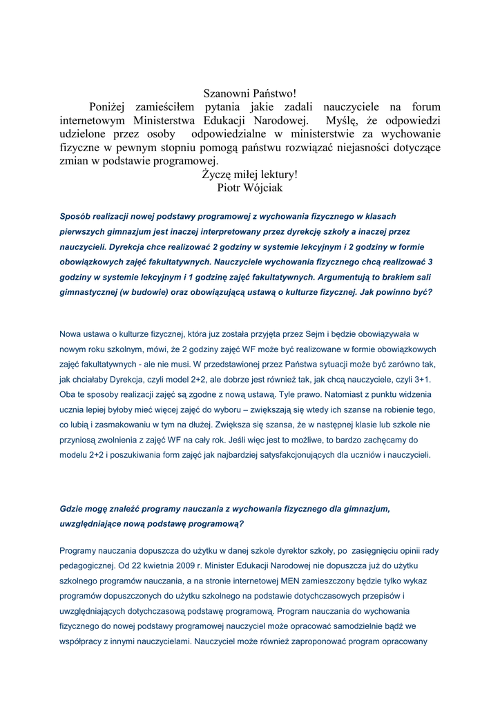 Szanowni Państwo! PoniŜej zamieściłem pytania jakie zadali nauczyciele na forum internetowym Ministerstwa Edukacji Narodowej. Myślę, Ŝe odpowiedzi udzielone przez osoby odpowiedzialne w ministerstwie za wychowanie fizyczne w pewnym stopniu pomogą państwu rozwiązać niejasności dotyczące zmian w podstawie programowej. śyczę miłej lektury! Piotr Wójciak Sposób realizacji nowej podstawy programowej z wychowania fizycznego w klasach pierwszych gimnazjum jest inaczej interpretowany przez dyrekcję szkoły a inaczej przez nauczycieli. Dyrekcja chce realizować 2 godziny w systemie lekcyjnym i 2 godziny w formie obowiązkowych zajęć fakultatywnych. Nauczyciele wychowania fizycznego chcą realizować 3 godziny w systemie lekcyjnym i 1 godzinę zajęć fakultatywnych. Argumentują to brakiem sali gimnastycznej (w budowie) oraz obowiązującą ustawą o kulturze fizycznej. Jak powinno być? Nowa ustawa o kulturze fizycznej, która juz została przyjęta przez Sejm i będzie obowiązywała w nowym roku szkolnym, mówi, Ŝe 2 godziny zajęć WF moŜe być realizowane w formie obowiązkowych zajęć fakultatywnych - ale nie musi. W przedstawionej przez Państwa sytuacji moŜe być zarówno tak, jak chciałaby Dyrekcja, czyli model 2+2, ale dobrze jest równieŜ tak, jak chcą nauczyciele, czyli 3+1. Oba te sposoby realizacji zajęć są zgodne z nową ustawą. Tyle prawo. Natomiast z punktu widzenia ucznia lepiej byłoby mieć więcej zajęć do wyboru – zwiększają się wtedy ich szanse na robienie tego, co lubią i zasmakowaniu w tym na dłuŜej. Zwiększa się szansa, Ŝe w następnej klasie lub szkole nie przyniosą zwolnienia z zajęć WF na cały rok. Jeśli więc jest to moŜliwe, to bardzo zachęcamy do modelu 2+2 i poszukiwania form zajęć jak najbardziej satysfakcjonujących dla uczniów i nauczycieli. Gdzie mogę znaleźć programy nauczania z wychowania fizycznego dla gimnazjum, uwzględniające nową podstawę programową? Programy nauczania dopuszcza do uŜytku w danej szkole dyrektor szkoły, po zasięgnięciu opinii rady pedagogicznej. Od 22 kwietnia 2009 r. Minister Edukacji Narodowej nie dopuszcza juŜ do uŜytku szkolnego programów nauczania, a na stronie internetowej MEN zamieszczony będzie tylko wykaz programów dopuszczonych do uŜytku szkolnego na podstawie dotychczasowych przepisów i uwzględniających dotychczasową podstawę programową. Program nauczania do wychowania fizycznego do nowej podstawy programowej nauczyciel moŜe opracować samodzielnie bądź we współpracy z innymi nauczycielami. Nauczyciel moŜe równieŜ zaproponować program opracowany przez innego autora (autorów), np. moŜe wybrać program nauczania spośród programów dostępnych na rynku. Wybrany przez nauczyciela program nauczania, przed dopuszczeniem do uŜytku w danej szkole przez dyrektora szkoły, będzie wymagał pozytywnego zaopiniowania przez nauczyciela mianowanego lub dyplomowanego lub doradcę metodycznego. Minister Edukacji Narodowej podpisał 10 sierpnia 2009 r. rozporządzenie w sprawie dopuszczalnych form realizacji dwóch godzin obowiązkowych zajęć wychowania fizycznego, nowelizację rozporządzenia w sprawie organizacji zajęć i nauczania wychowania do Ŝycia w rodzinie oraz rozporządzenie w sprawie kryteriów i trybu przyznawania nagród dla nauczycieli. Dwa pierwsze rozporządzenia wchodzą w Ŝycie z dniem 1 września 2009 r., ostatnie – z dniem ogłoszenia. Rozporządzenie o dopuszczalnych formach realizacji obowiązkowych dwóch godzin wychowania fizycznego dotyczy klas IV-VI szkół podstawowych, gimnazjów oraz szkół ponadgimnazjalnych. Określa ono dopuszczalne formy realizacji dwóch godzin obowiązkowych zajęć wychowania fizycznego, uwzględniając potrzeby zdrowotne uczniów, specyfikę ich zainteresowań sportowych, warunki realizacji zajęć oraz tradycje sportowe danego środowiska lub szkoły. Szkoła przygotowuje własną ofertę edukacyjną zajęć, które mogą być prowadzone jako zajęcia lekcyjne, pozalekcyjne lub pozaszkolne. Szkolna oferta powinna wykorzystywać uwarunkowania lokalne oraz tradycje środowiskowe, włączać do współpracy związane ze sportem instytucje samorządowe i stowarzyszenia. Dwie godziny obowiązkowych zajęć wychowania fizycznego w ramach tygodniowego wymiaru godzin mogą być prowadzone w formie zajęć: • sportowych - szkoła moŜe zaproponować od jednej do kilku dyscyplin sportowych do wyboru, uwzględniając uzdolnienia i zainteresowania uczniów oraz tradycje sportowe szkoły i środowiska • rekreacyjno-zdrowotnych - zawierających jedną lub kilka form aktywności fizycznej słuŜących zdrowiu, wypoczynkowi lub zabawie i przygotowujących uczniów do systematycznej aktywności fizycznej w czasie wolnym • tanecznych - obejmujących jedną lub kilka form tańca i pogłębiających wiedzę i umiejętności w tej dziedzinie • aktywnych form turystyki - zawierających jedną lub kilka form turystyki do wyboru, w zaleŜności od zainteresowań uczniów oraz warunków terenowych w środowisku. Mogą to być np. turystyka piesza, rowerowa, górska. Swoboda w decydowaniu o formie realizacji dwóch obowiązkowych godzin zajęć wychowania fizycznego pozwoli na efektywniejszą i bliŜszą potrzebom uczniów realizację zajęć w szkołach. Będzie słuŜyła poszerzaniu i pogłębianiu umiejętności i wiadomości związanych z aktywnością fizyczną na miarę moŜliwości i oczekiwań uczniów. W jaki sposób jest moŜliwa realizacja godzin wychowania fizycznego w systemie 2+2 , gdzie spora część młodzieŜy dojeŜdŜa do szkoły np. z drugiego końca miasta. Spora grupa uczniów popołudniami jeździ na zajęcia dodatkowe (języki obce, szkoła muzyczna). Ministerstwo Edukacji Narodowej opracowało nową podstawę programową (rozporządzenie Ministra Edukacji Narodowej z dnia 23 grudnia 2008 r. w sprawie podstawy programowej wychowania przedszkolnego oraz kształcenia ogólnego w poszc