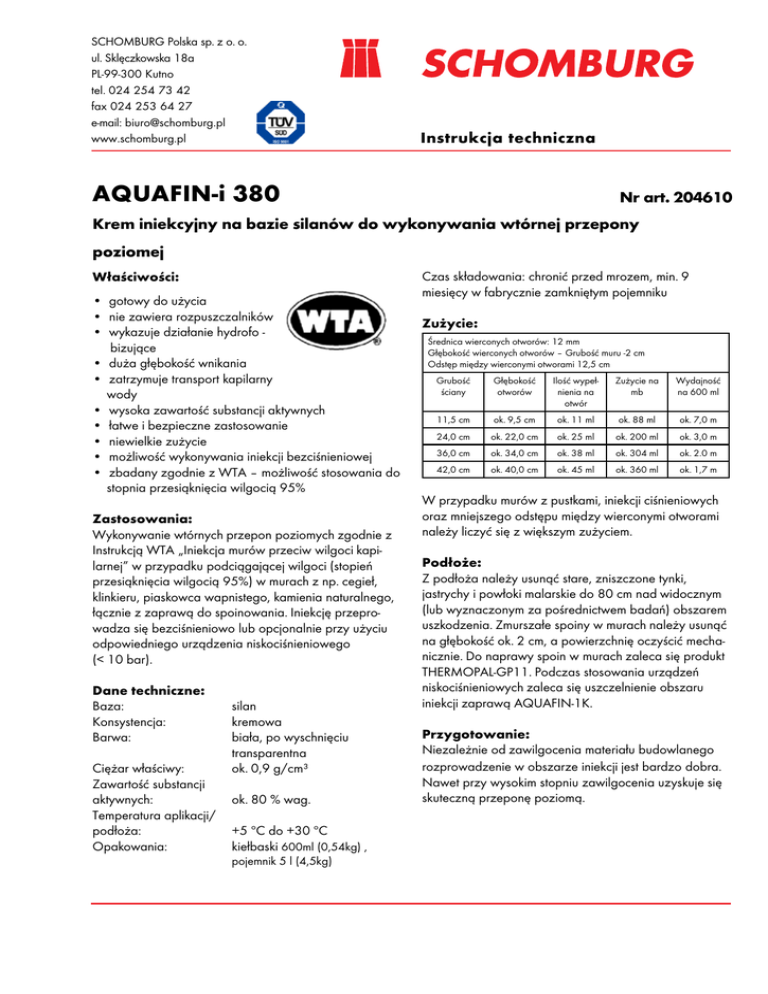 SCHOMBURG Polska sp. z o. o. ul. Sklęczkowska 18a PL-99-300 Kutno tel. 024 254 73 42 fax 024 253 64 27 e-mail: [email protected] www.schomburg.pl Instrukcja techniczna AQUAFIN-i 380 Nr art. 204610 Nr art. Krem iniekcyjny na bazie silanów do wykonywania wtórnej przepony poziomej Właściwości: • gotowy do użycia • nie zawiera rozpuszczalników • wykazuje działanie hydrofo bizujące • duża głębokość wnikania • zatrzymuje transport kapilarny wody • wysoka zawartość substancji aktywnych • łatwe i bezpieczne zastosowanie • niewielkie zużycie • możliwość wykonywania iniekcji bezciśnieniowej • zbadany zgodnie z WTA – możliwość stosowania do stopnia przesiąknięcia wilgocią 95% Zastosowania: Wykonywanie wtórnych przepon poziomych zgodnie z Instrukcją WTA „Iniekcja murów przeciw wilgoci kapilarnej” w przypadku podciągającej wilgoci (stopień przesiąknięcia wilgocią 95%) w murach z np. cegieł, klinkieru, piaskowca wapnistego, kamienia naturalnego, łącznie z zaprawą do spoinowania. Iniekcję przeprowadza się bezciśnieniowo lub opcjonalnie przy użyciu odpowiedniego urządzenia niskociśnieniowego (< 10 bar). Dane techniczne: Baza: silan Konsystencja: kremowa Barwa: biała, po wyschnięciu transparentna Ciężar właściwy: ok. 0,9 g/cm³ Zawartość substancji aktywnych: ok. 80 % wag. Temperatura aplikacji/ podłoża: +5 ºC do +30 ºC Opakowania: kiełbaski 600ml (0,54kg) , pojemnik 5 l (4,5kg) Czas składowania: chronić przed mrozem, min. 9 miesięcy w fabrycznie zamkniętym pojemniku Zużycie: Średnica wierconych otworów: 12 mm Głębokość wierconych otworów – Grubość muru -2 cm Odstęp między wierconymi otworami 12,5 cm Grubość ściany Głębokość otworów Ilość wypełnienia na otwór Zużycie na mb Wydajność na 600 ml 11,5 cm ok. 9,5 cm ok. 11 ml ok. 88 ml ok. 7,0 m 24,0 cm ok. 22,0 cm ok. 25 ml ok. 200 ml ok. 3,0 m 36,0 cm ok. 34,0 cm ok. 38 ml ok. 304 ml ok. 2.0 m 42,0 cm ok. 40,0 cm ok. 45 ml ok. 360 ml ok. 1,7 m W przypadku murów z pustkami, iniekcji ciśnieniowych oraz mniejszego odstępu między wierconymi otworami należy liczyć się z większym zużyciem. Podłoże: Z podłoża należy usunąć stare, zniszczone tynki, jastrychy i powłoki malarskie do 80 cm nad widocznym (lub wyznaczonym za pośrednictwem badań) obszarem uszkodzenia. Zmurszałe spoiny w murach należy usunąć na głębokość ok. 2 cm, a powierzchnię oczyścić mechanicznie. Do naprawy spoin w murach zaleca się produkt THERMOPAL-GP11. Podczas stosowania urządzeń niskociśnieniowych zaleca się uszczelnienie obszaru iniekcji zaprawą AQUAFIN-1K. Przygotowanie: Niezależnie od zawilgocenia materiału budowlanego rozprowadzenie w obszarze iniekcji jest bardzo dobra. Nawet przy wysokim stopniu zawilgocenia uzyskuje się skuteczną przeponę poziomą. AQUAFINi380 ASODUR®-EMB Iniekcja bezciśnieniowa: Usunąć stare tynki i powłoki do 80 cm poza określoną wizualnie lub przy pomocy odpowiednich badań, strefę skażoną solami lub zawilgoconą. Odstęp między wierconymi otworami oraz rozmieszczenie otworów (w jednym lub dwóch rzędach) zależy od chłonności muru. Im mniejszy jest odstęp między otworami, tym większa skuteczność zastosowanego środka. Do wiercenia otworów zaleca się stosowanie elektropneumatycznych narzędzi wiertniczych (np. Hilti) z odpowiednim wiertłem, które pracują niemal bezwibracyjnie. Otwory o średnicy min. 12 mm rozmieszcza się z reguły w odstępach ok. 10 –12,5 cm pod kątem 0°-45°. Głębokość otworów wynosi ok. 2 cm mniej niż grubość muru. Przy ustalaniu kąta nachylenia otworów należy pamiętać, aby otwory przechodziły przez co najmniej jedną spoinę wsporną, a w przypadku grubych murów – przez co najmniej dwie. W przypadku podłoży o niskiej chłonności lub niechłonnych zaleca się rozmieszczenie otworów w dwóch rzędach w obszarze spoiny. Różnica wysokości powinna wówczas wynosić < 8 cm. W murach o grubości powyżej 60 cm zaleca się iniekcję ciśnieniową dwustronną. Przed iniekcją należy starannie usunąć pył wiertniczy, aby zapewnić jak najwyższe wchłanianie substancji aktywnych przez mur. Iniekcję wykonuje się przy użyciu ręcznego pistoletu iniekcyjnego z dołączoną do zestawu końcówką. AQUAFIN- i380 W przypadku murów z dużą ilością pustek, wykonanych z pustaków, w których znajdują się rysy lub otwarte spoiny do 5 mm przed właściwą iniekcją do otworów należy wtłoczyć zaprawę ASOCRET-BM. Po wyschnięciu zaprawy wypełniającej otwór ponownie nawiercić i wykonać iniekcję kremu AQUAFIN-i380 pod ciśnieniem < 10 bar. Iniekcję prowadzić do momentu aż przyległa spoina wypełniona zostanie preparatem AQUAFIN-i380, osiągając efekt matowo-błyszczący. Po iniekcji należy usunąć pakery iniekcyjne, otwory można zamknąć zaprawą tynkarską THERMOPAL. Przez powolne wyciskanie kremu AQUAFIN-i380 przy jednoczesnym wysuwaniu lancy iniekcyjnej należy osiągnąć całkowite wypełnienie otworów. Następnie wywiercone otwory można zamknąć zaprawą tynkarską THERMOPAL. Zabiegi uzupełniające: Po wykonaniu wtórnej przepony poziomej przeciwko kapilarnemu podciąganiu wilgoci w murze dodatkowo wymagane są odpowiednie zabiegi uzupełniające. Należą do nich przede wszystkim naprawa tynku zaprawą THERMOPAL, uszczelnienie powierzchni zewnętrznych w obrębie gruntu przy użyciu AQUAFIN-2K/M, AQUAFIN-RS300 lub COMBIFLEX-AB2, a także wykonanie drenażu wg DIN 4095 oraz usunięcie ewentualnych usterek techniczno-budowlanych. Wskazówki: • Powierzchnie niepodlegające obróbce należy chronić przed działaniem AQUAFIN- i 380. • Niniejszy materiał nie jest przeznaczony do hydrofobizacji powierzchni alkalicznych, jak np. beton, tynk, mur, itp. Iniekcja ciśnieniowa: Głębokość otworów przy iniekcji ciśnieniowej wynosi ok. 5 cm mniej niż grubość muru. Otwory wiertnicze należy rozmieścić analogicznie do 