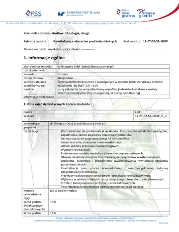Uniwersytet Śląski w Katowicach, ul. Bankowa 12, 40 -007 Katowice, http://www.us.edu.pl www.ecoetno.us.edu.pl Kierunek i poziom studiów: Etnologia, drugi Sylabus modułu: Rewitalizacja obszarów postindustrialnych Kod modułu: 12-ET-02-S2-1ROP Nazwa wariantu modułu (opcjonalnie): ------------ 1. Informacje ogólne koordynator modułu rok akademicki semestr forma studiów sposób ustalania oceny końcowej modułu dr Grzegorz Odoj ([email protected]) zimowy stacjonarne Średnia arytmetyczna ocen z wymaganych w module form weryfikacji efektów kształcenia (w skali 2.0 – 5.0) -przy założeniu, że wszystkie formy weryfikacji efektów kształcenia zostały zaliczone pozytywnie (tzn. co najmniej na ocenę dostateczną) ------------- informacje dodatkowe 2. Opis zajęć dydaktycznych i pracy studenta nazwa Wykład kod 12-ET-02-S2-1ROP_fs_1 prowadzący grupa(-y) treści zajęć metody prowadzenia zajęć liczba godzin dydaktycznych (kontaktowych) liczba godzin dr Grzegorz Odoj ([email protected]) - Wprowadzenie do problematyki wykładów. Podstawowe ustalenia teoretyczne, zagadnienia, zakres pojęciowy kluczowych terminów. - Geneza obszarów poprzemysłowych i ich specyfika. - Zasadnicze cele, znaczenie i sens rewitalizacji. - Główni aktorzy procesów rewitalizacyjnych. - Wymiary rewitalizacji. - Podstawowe modele rewitalizacji terenów poprzemysłowych. - Obszary działania i korzyści transformacyjne programów rewitalizacyjnych. - Społeczne, kulturowe i ekonomiczne uwarunkowania rewitalizacji obszarów postindustrialnych. - Rewitalizacja jako proces kompleksowej i interdyscyplinarnej odnowy zdegradowanych obszarów. - Przykłady realizowanych programów i projektów rewitalizacyjnych. - Wybrane przykłady miejskich i poprzemysłowych terenów zrewitalizowanych. - Problem funkcjonalności przestrzeni zrewitalizowanych. - Postindustrialne dziedzictwo kultury materialnej jako wartość. jak w opisie modułu 15 h 15 h Projekt „Ekologia kulturowa- specjalność na kierunku etnologia, studia II stopnia” Projekt finansowany ze środków funduszy norweskich i funduszy EOG, pochodzących z Islandii, Lichtensteinu i Norwegii oraz środków krajowych. Strona 1/5 Uniwersytet Śląski w Katowicach, ul. Bankowa 12, 40-007 Katowice, http://www.us.edu.pl pracy własnej studenta opis pracy własnej studenta organizacja zajęć literatura obowiązkowa Poza zajęciami kontaktowymi student jest zobligowany do pracy własnej o charakterze indywidualnym, polegającej na ugruntowaniu i poszerzeniu treści przedstawionych na wykładach (uzupełnionych o problematykę poruszaną na ćwiczeniach). Praca własna przebiega w oparciu o systematyczną analizę zaleconej literatury przedmiotu. Polega na rzetelnym zapoznaniu się z tekstami obowiązkowymi i wskazanymi przez wykładowcę fragmentami literatury uzupełniającej, co stanowi realną podstawę do przygotowania opracowania pisemnego. 1 godzina dydaktyczna tygodniowo (wg harmonogramu: www. weinoe.us.edu.pl) Przestrzenne aspekty rewitalizacji - śródmieścia, blokowiska, tereny poprzemysłowe, pokolejowe i powojskowe. Red. W. Jarczewski. Kraków 2009. Rewitalizacja historycznych dzielnic mieszkalno-przemysłowych: realizacje. Red. N. Juzwa, K. Wódz. Katowice 1996. idee, projekty, Ślęzak-Tazbir W., Tyrybon M. Krajobraz śląski. Społeczne aspekty rewitalizacji miast poprzemysłowych. W: 20 lat transformacji w aspekcie regionalnym. Śląsk. Refleksje socjologów. Red. U. Swadźba. Katowice 2011. Kłosowski Wojciech: Wymogi wobec Lokalnych Programów Rewitalizacji pod kątem ich zgodności z wymogami ZPORR. Tekst dostępny w Internecie: http://www.funduszestrukturalne.gov.pl/NR/rdonlyres/41BFAC21-9B53-45A6-948D80C56997A103/14344/zporr_wymogi_rewitalizacja_woj_mazow.pdf Rewitalizacja, rehabilitacja i restrukturyzacja – odnowa miast. Red. Z. Ziobrowski, D. Ptaszycka-Jackowska, A. Rębowska, A. Geissler. Kraków 2000. literatura uzupełniająca Chmielewska M.: Rewaloryzacja przestrzeni przemysłowej w miastach konurbacji katowickiej. [w:] M. Madurowicz (red.), Wartościowanie współczesnej przestrzeni miejskiej. Warszawa 2010. Gnieciak M: Przekształcenia przestrzeni starej zabudowy mieszkalnej robotniczego osiedla Nikiszowiec. W: Współczesne miasta – szkice socjologiczne. Red. M. Dymnicka, A. Majer. Łódź 2009. Kulas P., Wódz K.: Rewitalizacja, przestrzeń publiczna. W: Zapomniane miejsca, zapomniani ludzie. Restrukturyzacja ekonomiczna a zmiana kulturowa. Red. K. Wódz. Katowice 2013. Odoj G.: Między degradacją a rewitalizacją – górnośląskie osiedla robotnicze w obliczu deindustrializacji. W: Kształtowanie współczesnej przestrzeni miejskiej. Red. M. Madurowicz. Warszawa 2014. Rożałowska B.: Tradycja i współczesność – przemiany obszarów kulturowych dawnych osiedli patronackich w postindustrialnym mieście. W: Obszary kulturowe współczesnego miasta – funkcje i pogranicza. „Studia Etnologiczne i Antropologiczne”. T. 13. Red. G. Odoj, M. Szalbot. Katowice 2013. Skalski K.: Problemy rewitalizacji. W: Gospodarka przestrzenna gmin. Poradnik. T. 3. Kraków 1998. Żmudzińska-Nowak M.: Miejsce – tożsamość i zmiana. Gliwice 2010. Żmudzińska-Nowak M.: Opis projektu, cel, zakres i metodologia badań. W: Innowacyjność a tożsamość miejsca w rewitalizacji obszarów miejskich. Red. M. Żmudzińska-Nowak. Gliwice 2012. Projekt „Ekologia kulturowa- specjalność na kierunku etnologia, studia II stopnia” Projekt finansowany ze środków funduszy norweskich i funduszy EOG, pochodzących z Islandii, Lichtensteinu i Norwegii oraz środków krajowych. Strona 2 z 5 Uniwersytet Śląski w Katowicach, ul. Bankowa 12, 40-007 Katowice, http://www.us.edu.pl adres strony www zajęć informacje dodatkowe ---------------- ------------ kod nazwa 12-ET-02-S21ROP_fs_2 ćwiczenia prowadzący grupa(-y) treści zajęć metody prowadzenia zajęć liczba godzin dydaktycznych (kontaktowych) liczba godzin pracy własnej studenta opis pr