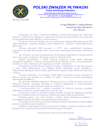 POLSKI ZWIĄZEK PŁYWACKI Polish Swimming Federation 01-813 Warszawa ul. Marymoncka 34 Skr. Poczt. 37 +48 22 8353589,+48 22 8342556, fax +48 22 8353983 [email protected] NIP:118-01-72-707 REGON 000866389 Konto: PKO BP II O/M Warszawa 90 1020 1026 0000 1502 0015 2132 Warszawa 11.08.2009r Urząd Miejski w Andrychowie Szanowny Pan Burmistrz Jan Pietras Nawiązując do wizyty wiceprezesa Polskiego Związku Pływackiego kol. Wojciecha Nazarko w Andrychowie dziękuję za zaproszenie naszego przedstawiciela przed otwarciem nowego obiektu pływalni odkrytej w waszym mieście. Wiceprezes Wojciech Nazarko jest przewodniczącym Komisji Szkół Sportowych PZP odpowiedzialnym z ramienia Zarządu za sport młodzieŜowy – juniorów i Szkoły Mistrzostwa Sportowego. Pierwsza pływacka SMS powstała w 1977r. przy współudziale mieszkańca Andrychowa śp. Jana Jaworskiego, który w tym czasie pełnił funkcję kierownika wyszkolenia w PZP. Jan Jaworski z pewnością pamiętał stare przedwojenne kąpielisko na, którym powstał nowy, nowoczesny, atrakcyjny rekreacyjno-sportowy obiekt pływacki. Dlatego przyjmujemy z wielką radością propozycję władz gminy dotyczącą nawiązania współpracy w zakresie rozwoju pływania na Waszym terenie, oraz udostępnienia obiektów do celów szkoleniowych i organizacji zawodów centralnych. Gratulujemy odwaŜnej decyzji budowy tej jednej z najładniejszych tego typu pływalni w Polsce Panu Burmistrzowi, oraz Radnym Gminy Andrychów Ŝycząc satysfakcji z wykorzystania obiektu po otwarciu przez społeczeństwo regionu a takŜe środowisko pływackie w Polsce. Jesteśmy przekonani, Ŝe ten piękny obiekt będzie początkiem rozwoju pływania na Waszym terenie tym bardziej Ŝe w pobliŜu są szkoły i nauczyciele-trenerzy posiadający odpowiednie kwalifikacje. Po uzyskaniu dokładnej informacji złoŜonej po wizycie w Waszym mieście przez kol. Wojciecha Nazarko, uprzejmie informuję Ŝe wszystkie uzgodnienia (w załączeniu),które zapadły podczas tej wizyty będziemy starali się zrealizować. Z niedowierzaniem ale z wielkim szacunkiem do Waszych poczynań przyjąłem informację Ŝe obiekt ten został wybudowany w niecały rok. Z informacji wynika Ŝe pływalnia spełnia wszystkie wymogi do organizacji zawodów krajowych i międzynarodowych a takŜe Ŝe w pobliŜu jest odpowiednia baza hotelowa. PołoŜenie gminy, oraz wiele atrakcji w okolicy będzie dodatkowym bodźcem w przyciąganiu polskich pływaków na zgrupowania do Andrychowa. Na najbliŜszym posiedzeniu Zarządu Polskiego Związku Pływackiego zostaną podjęte decyzje co do dalszej naszej współpracy. Dziękuję za zaproszenie na uroczyste otwarcie obiektu w miesiącu wrześniu na które przyjadę wraz z uzgodnionymi przedstawicielami naszego środowiska. Z powaŜaniem i sportowym pozdrowieniem Prezes Polskiego Związku Pływackiego Krzysztof Usielski Andrychów 07.08.09r. Wstępne uzgodnienia. Podczas pobytu wiceprezesa Polskiego Związku Pływackiego kol. Wojciecha Nazarko zwiedzono obiekty sportowe i rekreacyjne, oraz bazę hotelową gminy Andrychów, a takŜe przygotowywaną do otwarcia nową 50 m. pływalnię odkrytą. W spotkaniu uczestniczyli oprócz Burmistrza Andrychowa Pana Jana Pietrasa, Przewodniczący Rady Miasta, sekretarz, skarbnik, miasta, oraz kierownik budowy, dyrektorzy szkół i właściciele odwiedzanych obiektów hotelowych i turystycznych. Podczas wizyty poruszono następujące kwestie: Uroczyste otwarcie: 1/ Przewidywany termin otwarcia obiektu 4-6 września 2009r. 2/ Polski Związek Pływacki włączy się do organizacji otwarcia poprzez: - zasygnalizowanie na stronie PZP o otwarciu nowego atrakcyjnego obiektu przystosowanego do organizacji zgrupowań i zawodów pływackich. - uczestnictwa przedstawicieli środowiska pływackiego uzgodnionych z Prezesem Polskiego Związku Pływackiego panem Krzysztofem Usielskim. - zwołania wyjazdowego posiedzenia Komisji Szkół Sportowych PZP poszerzonej o dyrektorów Szkół Mistrzostwa Sportowego pod przewodnictwem wiceprezesa Wojciecha Nazarko. - pomocy w uczestnictwie wybitnych pływaków i olimpijczyków PZP w uroczystości otwarcia. /wstępne propozycje – Otylia Jędrzejczak, Paweł Korzeniowski, Zuzanna Mazurek, Agnieszka Czopek, Katarzyna Wilk i Marcin Cielak. / Wybrani pływacy startując z obu stron pływalni spotkali by się przy powieszonej wstędze na środku dokonując jej przecięcia/. Władze gminy chciały by Ŝeby aktu tego dokonali Otylia Jędrzejczak i Paweł Korzeniowski. - pozostali uczestnicy włączyli by się do scenariusza otwarcia przygotowanego przez organizatorów / wciągnięcie na maszt flagi PKOL, odczytanie apelu olimpijskiego itp./. Akcenty te są zaproponowane z racji w bieŜącym roku obchodów 90-lecia Polskiego Komitetu Olimpijskiego. - władze gminy deklarują się do zabezpieczenia wyŜywienia i noclegów dla osób przyjezdnych. Strona sportowa: 1/ Wojciech Nazarko stwierdził, Ŝe obiekt jest bardzo atrakcyjny zarówno pod względem sportowym jak i rekreacyjnym. Lokalizacja jego w ciekawym regionie dodaje mu dodatkowych walorów. Poinformował gospodarzy, Ŝe pływalnia będzie spełniała wszystkie wymogi do organizacji zawodów pływackich krajowych i międzynarodowych po otrzymaniu homologacji, oraz do organizacji zgrupowań pływackich ze szczególnym uwzględnieniem kadry Polski Juniorów przed zawodami na otwartych pływalniach, oraz grup młodzieŜowych. 2/ Po telefonicznym uzgodnieniu z Prezesem Polskiego Związku Pływackiego skontaktowano się z Panem inź. Czesławem Sokołowskim w celu przyjazdu do Andrychowa aby dokonać ostatecznego przeglądu obiektu przed wydaniem certyfikatu homologacji obiektu. Uzgodniono Ŝe przyjazd przedstawiciela PZP nastąpi przed otwarciem obiektu / do 20 sierpnia / w terminie uzgodnionym z Burmistrzem Andrychowa Panem Janem Pietrasem. 3/ Uzgodniono Ŝe w najbliŜszym czasie przyjedzie osoba kompetentna w celu sprawdzenia podłączeń do elektronicznego po