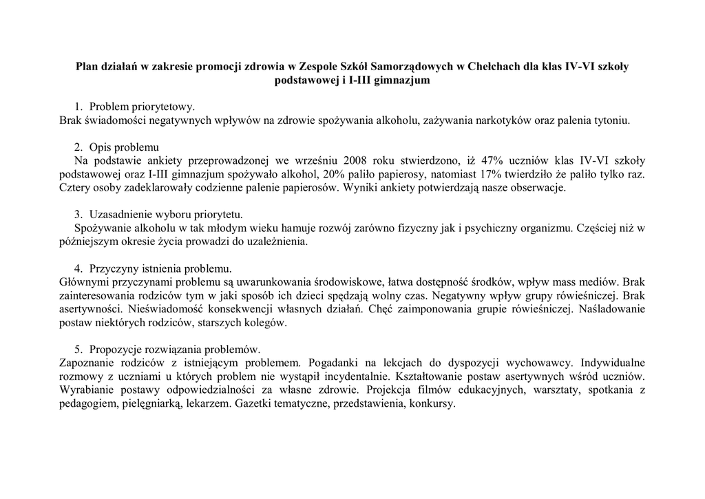 Plan działań w zakresie promocji zdrowia w Zespole Szkół Samorządowych w Chełchach dla klas IV-VI szkoły podstawowej i I-III gimnazjum 1. Problem priorytetowy. Brak świadomości negatywnych wpływów na zdrowie spożywania alkoholu, zażywania narkotyków oraz palenia tytoniu. 2. Opis problemu Na podstawie ankiety przeprowadzonej we wrześniu 2008 roku stwierdzono, iż 47% uczniów klas IV-VI szkoły podstawowej oraz I-III gimnazjum spożywało alkohol, 20% paliło papierosy, natomiast 17% twierdziło że paliło tylko raz. Cztery osoby zadeklarowały codzienne palenie papierosów. Wyniki ankiety potwierdzają nasze obserwacje. 3. Uzasadnienie wyboru priorytetu. Spożywanie alkoholu w tak młodym wieku hamuje rozwój zarówno fizyczny jak i psychiczny organizmu. Częściej niż w późniejszym okresie życia prowadzi do uzależnienia. 4. Przyczyny istnienia problemu. Głównymi przyczynami problemu są uwarunkowania środowiskowe, łatwa dostępność środków, wpływ mass mediów. Brak zainteresowania rodziców tym w jaki sposób ich dzieci spędzają wolny czas. Negatywny wpływ grupy rówieśniczej. Brak asertywności. Nieświadomość konsekwencji własnych działań. Chęć zaimponowania grupie rówieśniczej. Naśladowanie postaw niektórych rodziców, starszych kolegów. 5. Propozycje rozwiązania problemów. Zapoznanie rodziców z istniejącym problemem. Pogadanki na lekcjach do dyspozycji wychowawcy. Indywidualne rozmowy z uczniami u których problem nie wystąpił incydentalnie. Kształtowanie postaw asertywnych wśród uczniów. Wyrabianie postawy odpowiedzialności za własne zdrowie. Projekcja filmów edukacyjnych, warsztaty, spotkania z pedagogiem, pielęgniarką, lekarzem. Gazetki tematyczne, przedstawienia, konkursy. Zadania Spotkanie z rodzicami Spotkanie klas z pracownikami ośrodka uzależnień w Ełku Kryterium sukcesu 70 % rodziców bierze udział w spotkaniu na temat szkodliwości spożywania alkoholu i palenia tytoniu 70 % rodziców wypełni ankietę dotyczącą świadomości na temat szkodliwości spożywania alkoholu i palenia tytoniu przez ich dzieci 65 % uczniów weźmie udział w spotkaniu 40 % uczniów zastosowało się do wskazań pracowników ośrodka Wykonawca Środki Monitorowanie, termin, osoba Wychowawcy pielęgniarka Plansze, dane statystyczne, film Wychowawcy klas Październik 2008 Wychowawcy Broszury Wychowawcy klas Ankiety Analiza ankiety Wicedyrektor Wykład na temat zagrożeń uzależnieniem wynikających ze spożywania alkoholu i palenia tytoniu Listopad 2008 maj 2008 Wychowawcy, pracownicy poradni uzależnień Ulotki, plakaty, infolinia Wychowawcy Lista obecności, Sprawozdanie Wicedyrektor Cały rok Uczniowie ankiety Wychowawcy Analiza ankiety Wnioski Wicedyrektor Metody realizacjiterminy Pogadanka na temat szkodliwości spożywania alkoholu i palenia tytoniu Zapoznanie z elementami projektu edukacyjnego: „Na zdrowie” Sposób sprawdzenia wykonania zadania Co Jak sprawdzić Kto i kiedy sprawdzi wskazane Wicedyrektor Harmonogram Lista spotkań w obecności poszczególnych klasach Opracowanie i przeprowadzenie szkolnego etapu konkursu na temat HIV i uzależnień Organizacja i przeprowadzenie konkursu plastycznego na temat szkodliwości spożywania alkoholu (szkoła podstawowa) i palenia tytoniu (gimnazjum) Wykonanie tematycznych gazetek ściennych w każdej klasie „Życie bez nałogów” Przygotowanie i wystawienie przedstawień profilaktycznych „Sąd nad Papierosem” oraz „Sąd nad alkoholem” 60 % uczniów weźmie udział w konkursie Przeprow. konkursu Listopad 2008 p. Anna Iwaszko p. Ewa Szymbor Test Prezentacja Prace plastyczne 40% uczniów weźmie udział w konkursie plastycznym „Antyreklama papierosów” oraz „Negatywne skutki picia alkoholu” Przeprow. konkursu Styczeń 2009 p. Alicja Podlaska Prace plastyczne Wszystkie klasy wykonają gazetki Październik listopad 2008 Uczniowie Wychowawcy Dowolne 100% uczniów bierze udział w pokazie przedstawień Przedstawienia Styczeń 2009 Maj 2009 Uczniowie klasy V i III gimnazjum p. Anna Iwaszko Sprzęt nagłaśniający, Stroje, Dekoracje, Wyniki konkursu Zestawienie wyników Organizatorzy Galeria wyróżniony ch Ocena wg kryteriów Powołana komisja Wychowawcy Wykonanie gazetki Punkty za wykonanie Komisja konkursowa p. Anna Iwaszko Wyciągnięc ie pozytywnyc h wniosków Dyskusja, analiza Wychowawcy p. Ewa Szymbor p. Anna Żołnieżewicz p. Mariola Szulimowska p. Marcin Święciński p. Grzegorz Kacperski Turnieje sportowe jako forma właściwego wykorzystania czasu wolnego Kampania antynikotynowa z okazji Światowego dnia bez papierosa Wykazanie wysokości nakładów finansowych ponoszonych przez rodzinę związanych z paleniem tytoniu. 50 % uczniów bierze udział w turniejach sportowych: piłki nożnej, unihokeja, tenisa stołowego, lekkoatletyczne, wycieczki rowerowe, wyjazdy na basen 70% uczniów bierze udział w kampanii 100% uczniów wykona kalkulację Cały rok p. Marcin Święciński P. Grzegorz Kacperski p. Anna Iwaszko Sprzęt sportowy, rower p. Marcin Święciński Wyniki turniejów Sprawozdania Wicedyrektor Przekazanie przez uczniów rodzicom informacjo negatywnym wpływie nikotyny na zdrowie rodzice – uczniowie Wyliczenie na lekcji matematyki Luty 2009 Uczniowie, Wychowawcy Broszura Plakat Wszyscy nauczyciele Maj 2009 Opracowani e broszur Ocena, przegląd, konkurs broszur Wychowawcy p. Anna Żołnieżewicz Kalkulator p. Anna Żołnieżewicz Kalkulacje Wyniki Zapisy p. Anna Żołnieżewicz