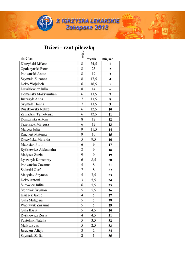 do 9 lat Dłużyński Miłosz Opałczyński Piotr Podkański Antoni Szymala Zuzanna Deko Wojciech Duszkiewicz Julia Domański Maksymilian Juszczyk Anna Szymala Hanna Ruszkowski Jędrzej Zawadzki Tymoteusz Domżalski Antoni Trzensiok Mateusz Marosz Julia Rajchert Mateusz Dłużyńska Matylda Matysiak Piotr Ryśkiewicz Aleksandra Małysza Zuzia Lyszczyk Konstanty Podkańska Zuzanna Solarski Olaf Matysiak Szymon Deko Antoni Surowiec Julita Stępniak Szymon Ksiązek Jakub Gula Małgosia Wacławik Zuzanna Gula Kasia Ryśkiewicz Zosia Pustelnik Natalia Małysza Jaś Jaszczur Alicja Szymala Zofia wiek Dzieci - rzut piłeczką 8 8 8 8 6 8 6 7 7 6 6 8 6 9 9 5 6 8 9 6 5 7 5 3 6 5 4 5 5 5 4 5 5 3 2 wynik 24,5 23 19 17,5 16,5 14 13,5 13,5 13,5 12,5 12,5 12 12 11,5 10 9,5 9 9 9 8,5 8 8 7,5 5,5 5,5 5,5 5 5 5 4,5 4,5 3,5 2,5 2 1 miejsce 1 2 3 4 5 6 7 8 9 10 11 12 13 14 15 16 17 18 19 20 21 22 23 24 25 26 27 28 29 30 31 32 33 34 35 9-12 lat Marosz Karol Sidorowicz Roch Sazon Roman Lesman Jakub Duszkiewicz Filip Duszkiewicz Jakub Wilczek Julia Domżalska Hanna 11 10 11 10 10 10 11 11 33 31 28 27,5 20 20 19,5 15 1 2 12 - 15 lat Kacała Artur Lesman Juliusz Ruszkowski Marcin Marosz Szymon Gawda Zuzanna Nowak Filip Cyganowicz Julia 14 13 13 13 13 13 14 53,5 48,5 45 37 33 33 21 1 2 3 4 5 6 7 3 4 5 6 7 8