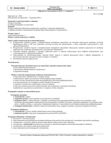 6.2 – Zasoby ludzkie Procedura SZJ Nabór pracowników Załącznik nr 2 do procedury P-SZJ/1.1.1, wydanie 5 P - SZJ/1.1.1 P-1.1.1/ F-02/ Ogłoszenie nr: 6864 Data ukazania się ogłoszenia: 28 grudnia 2016 r. Pomorski Urząd Wojewódzki w Gdańsku Dyrektor Generalny poszukuje kandydatów na stanowisko: inspektor do spraw udzielania informacji, przyjmowania wniosków i wydawania dokumentów w Oddziale do Spraw Cudzoziemców Wydziału Spraw Obywatelskich i Cudzoziemców Wymiar etatu: 1 Liczba stanowisk pracy: 3 Miejsce wykonywania pracy: Gdańsk Zakres zadań wykonywanych na stanowisku pracy: Przyjmowanie wniosków łącznie z kompletowaniem niezbędnych załączników do wniosków dotyczących udzielania zezwoleń legalizujących pobyt w RP oraz wydawanie zezwoleń na pracę dla cudzoziemców, a także wydawanie wytworzonych w tych sprawach dokumentów; Przyjmowanie wniosków łącznie z kompletowaniem niezbędnych załączników dotyczących wpisania zaproszenia do ewidencji zaproszeń oraz wydawanie sporządzonych w tych sprawach dokumentów; Udzielanie klientom informacji o sposobie załatwiania spraw w zakresie realizowanym przez Oddział Cudzoziemców oraz o obowiązujących w Oddziale procedurach; Wprowadzanie do teleinformatycznego „Systemu Pobyt” danych w zakresie dotyczących treści i odbioru dokumentów w powyższych sprawach i przygotowywanie wyciągów z wniosków; Prowadzenie rejestrów papierowych. Warunki pracy: Warunki dotyczące charakteru pracy na stanowisku i sposobu wykonywanie zadań: praca administracyjno-biurowa, permanentna obsługa klientów zewnętrznych, zagrożenie korupcją. Miejsce i otoczenie organizacyjno-techniczne stanowiska pracy: stanowisko pracy zlokalizowane w siedzibie urzędu, pokój biurowy mieści się na parterze wielokondygnacyjnego budynku, wejście od ulicy Rzeźnickiej posiada dźwig platformowy dla osób niepełnosprawnych, na stanowisku pracy nie występują czynniki szkodliwe dla zdrowia, większość czynności jest wykonywana w pozycji siedzącej, praca przy monitorze powyżej 4 godzin dziennie, przy naturalnym i sztucznym oświetleniu, podstawowe wyposażenie na stanowisku to: komputer, telefon, drukarka. Wymagania związane ze stanowiskiem pracy Wymagania niezbędne: wykształcenie: średnie znajomość języków: język angielski na poziomie B2 (wg ESOKJ), znajomość ustaw: o cudzoziemcach, o wjeździe na terytorium Rzeczypospolitej Polskiej, pobycie oraz wyjeździe z tego terytorium obywateli państw członkowskich Unii Europejskiej i członków ich rodzin, o promocji zatrudnienia i instytucjach rynku pracy, o służbie cywilnej, o wojewodzie i administracji rządowej w województwie oraz Kodeks postępowania administracyjnego; wymagane kompetencje: rzetelność, skuteczna komunikacja ustna, osiąganie rezultatów, pozytywne podejście do klienta Wymagania dodatkowe: wykształcenie: wyższe o profilu: administracja, prawo lub psychologia znajomość języków: inny język europejskiego na poziomie B2 (wg ESOKJ) Wymagane dokumenty i oświadczenia: życiorys/CV i list motywacyjny, kopia dokumentu potwierdzającego posiadanie polskiego obywatelstwa lub oświadczenie o posiadaniu obywatelstwa polskiego, oświadczenie o wyrażeniu zgody na przetwarzanie danych osobowych do celów rekrutacji, oświadczenie o nieskazaniu prawomocnym wyrokiem za umyślne przestępstwo lub umyślne przestępstwo skarbowe, oświadczenie o korzystaniu z pełni praw publicznych, kopie dokumentów potwierdzających wykształcenie, Dokument Systemu Zarządzania Jakością wg PN-EN ISO 9001: 2009 w Pomorskim Urzędzie Wojewódzkim w Gdańsku. 6.2 – Zasoby ludzkie Procedura SZJ Nabór pracowników Załącznik nr 2 do procedury P-SZJ/1.1.1, wydanie 5 P - SZJ/1.1.1 P-1.1.1/ F-02/ Dokumenty i oświadczenia dodatkowe: kopie dokumentów potwierdzających spełnienie wymagania dodatkowego w zakresie wykształcenia kopie dokumentów potwierdzających spełnienie wymagania dodatkowego w zakresie znajomości innego języka europejskiego na poziomie B2 (wg ESOKJ) Termin i miejsce składania dokumentów: Dokumenty należy złożyć do dnia: 7 stycznia 2017 r. (decyduje data stempla pocztowego/osobistego dostarczenia oferty do urzędu) Miejsce składania dokumentów: Pomorski Urząd Wojewódzki w Gdańsku Punkt przyjęć korespondencji w holu budynku Urzędu przy wejściu „B” ul. Okopowa 21/27 80-810 Gdańsk Na kopercie i liście motywacyjnym należy umieścić dopisek: 117/16 Inne informacje: W miesiącu poprzedzającym datę upublicznienia ogłoszenia wskaźnik zatrudnienia osób niepełnosprawnych w urzędzie, w rozumieniu przepisów o rehabilitacji zawodowej i społecznej oraz zatrudnianiu osób niepełnosprawnych, wynosi co najmniej 6%. O przebiegu naboru kandydaci będą informowani za pośrednictwem poczty elektronicznej, ponadto informacje dotyczące terminów testów i rozmów publikowane będą w Biuletynie Informacji Publicznej pod adresem http://uwgdansk.ssdip.bip.gov.pl/ bezpośrednio pod treścią ogłoszenia. W ofercie należy podać swoje dane kontaktowe: adres do korespondencji, adres e-mail, numer telefonu. Każde wymagane oświadczenie powinno być zgodne z treścią ujętą w ogłoszeniu oraz opatrzone odręcznym podpisem oraz datą. Oferty odrzucone i nieodebrane zostaną komisyjnie zniszczone. Techniki i metody naboru: • weryfikacja formalna nadesłanych ofert, • test wiedzy (opcjonalnie - zgodnie z obowiązującym regulaminem naboru), • test z języka angielskiego, • sprawdzian praktyczny (opcjonalnie - zgodnie z obowiązującym regulaminem naboru), • rozmowa kwalifikacyjna. Zachęcamy do zapoznania się z informacjami dotyczącymi zasad organizacji naboru w Pomorskim Urzędzie Wojewódzkim w Gdańsku oraz skorzystania z wzorów oświadczeń, dostępnych na stronie BIP Urzędu w zakładce Praca w PUW/Zasady rekrutacji (http://uwgdansk.ssdip.bip.gov.pl/zasady-rekrutacji/dokumenty-i-oswiadczenia.html). Do składania dokumentów zach
