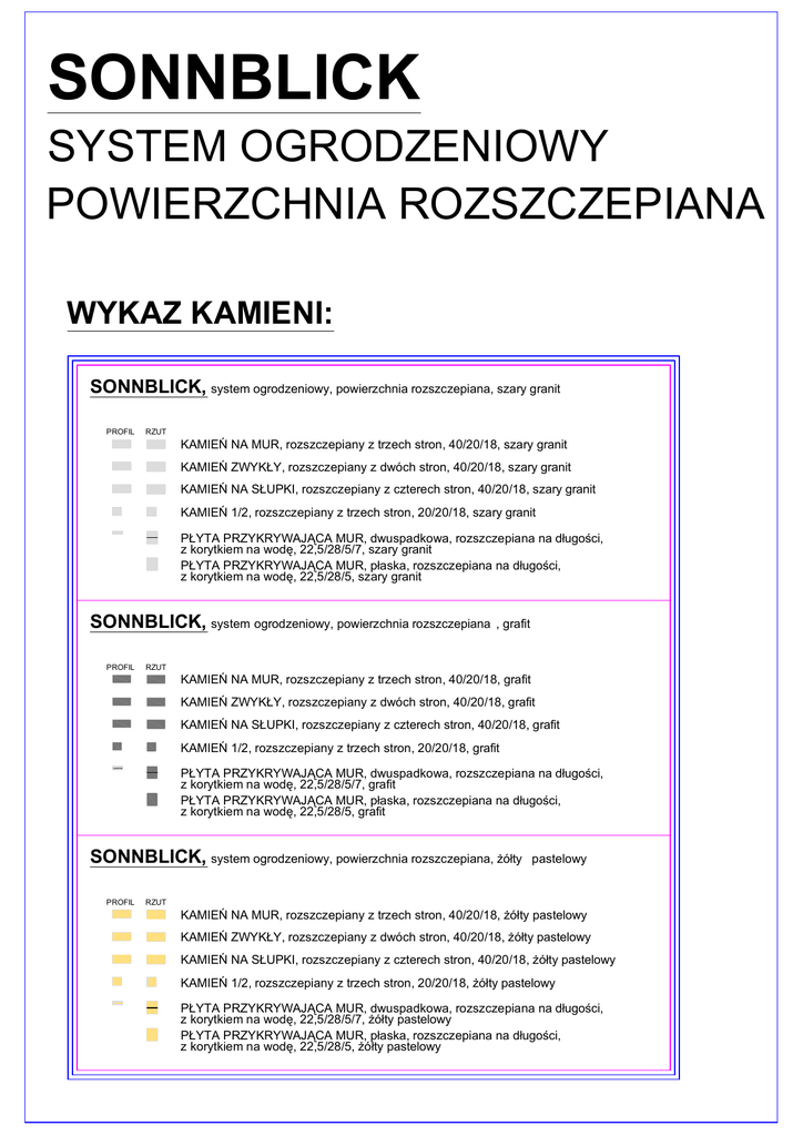 SONNBLICK SYSTEM OGRODZENIOWY POWIERZCHNIA ROZSZCZEPIANA WYKAZ KAMIENI: SONNBLICK, system ogrodzeniowy, powierzchnia rozszczepiana, szary granit PROFIL RZUT KAMIEŃ NA MUR, rozszczepiany z trzech stron, 40/20/18, szary granit KAMIEŃ ZWYKŁY, rozszczepiany z dwóch stron, 40/20/18, szary granit KAMIEŃ NA SŁUPKI, rozszczepiany z czterech stron, 40/20/18, szary granit KAMIEŃ 1/2, rozszczepiany z trzech stron, 20/20/18, szary granit PŁYTA PRZYKRYWAJĄCA MUR, dwuspadkowa, rozszczepiana na długości, z korytkiem na wodę, 22,5/28/5/7, szary granit PŁYTA PRZYKRYWAJĄCA MUR, płaska, rozszczepiana na długości, z korytkiem na wodę, 22,5/28/5, szary granit SONNBLICK, system ogrodzeniowy, powierzchnia rozszczepiana , grafit PROFIL RZUT KAMIEŃ NA MUR, rozszczepiany z trzech stron, 40/20/18, grafit KAMIEŃ ZWYKŁY, rozszczepiany z dwóch stron, 40/20/18, grafit KAMIEŃ NA SŁUPKI, rozszczepiany z czterech stron, 40/20/18, grafit KAMIEŃ 1/2, rozszczepiany z trzech stron, 20/20/18, grafit PŁYTA PRZYKRYWAJĄCA MUR, dwuspadkowa, rozszczepiana na długości, z korytkiem na wodę, 22,5/28/5/7, grafit PŁYTA PRZYKRYWAJĄCA MUR, płaska, rozszczepiana na długości, z korytkiem na wodę, 22,5/28/5, grafit SONNBLICK, system ogrodzeniowy, powierzchnia rozszczepiana, żółty PROFIL pastelowy RZUT KAMIEŃ NA MUR, rozszczepiany z trzech stron, 40/20/18, żółty pastelowy KAMIEŃ ZWYKŁY, rozszczepiany z dwóch stron, 40/20/18, żółty pastelowy KAMIEŃ NA SŁUPKI, rozszczepiany z czterech stron, 40/20/18, żółty pastelowy KAMIEŃ 1/2, rozszczepiany z trzech stron, 20/20/18, żółty pastelowy PŁYTA PRZYKRYWAJĄCA MUR, dwuspadkowa, rozszczepiana na długości, z korytkiem na wodę, 22,5/28/5/7, żółty pastelowy PŁYTA PRZYKRYWAJĄCA MUR, płaska, rozszczepiana na długości, z korytkiem na wodę, 22,5/28/5, żółty pastelowy WZÓR: SONNBLICK 28 cm 20 cm 280 cm 200 cm 48 cm 18 cm 280 cm 200 cm 90 cm 40 cm SONNBLICK, system ogrodzeniowy SZTUKI 21 4 12 9 2 NAZWA PRODUKTU SONNBLICK, kamień zwykły, rozszczepiany z dwóch stron, 40/20/18 SONNBLICK, kamień na słupki, rozszczepiany z czterech stron, 40/20/18 SONNBLICK, kamień 1/2, rozszczepiany z trzech stron, 20/20/18 SONNBLICK, płyta przykrywająca płaska, 22,5/28/5 SONNBLICK, płyta przykrywająca dwuspadkowa, 22,5/28/5/7