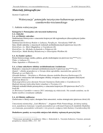 Turystyka Kulturowa, www.turystykakulturowa.org Nr 4/2011 (kwiecień 2011) Materiały faktograficzne Szymon Czajkowski Waloryzacja1 potencjału turystyczno-kulturowego powiatu czarnkowsko-trzcianeckiego 1. Ankieta waloryzacyjna Kategoria I: Potencjalne cele turystyki kulturowej I.A: Zabytki: I.A. a) Obiekty sakralne: Sanktuarium historyczne o znaczeniu krajowym lub regionalnym (diecezjalnym) (jedno pierwsze) (6) Sanktuarium Królowej Rodzin w Lubaszu, Parafia pw. Narodzenia NMP (6) Inny obiekt sakralny o znacznych walorach architektonicznych (pierwsze trzy) (4) – Kościół pw. św. Marii Magdaleny w Czarnkowie (4) Kościół pw. św. Michała Archanioła w Połajewie (4) Kościół pw. Matki Boskiej Różańcowej w Dzierżążnie Wielkim (4) I.A. b) Zamki i pałace: Ruina historycznego zamku, pałacu, grodu niedostępna (za pierwsze trzy****) (1) – Pałac w Lubaszu (1) Pałac Sapiehów w Wieleniu (1) I.A. c) Inne zabytkowe obiekty architektoniczne i techniczne: Budynek o znacznych walorach architektonicznych Z (pierwsze trzy****) (3) – Zamek + obiekty gospodarcze w Goraju (dom ogrodnika, masztalernia, garaż) (3) Wiatrak we wsi Dębe (3) Ośrodek Kultury – Strzelnica w Wieleniu (dawna siedziba Bractwa Kurkowego) (3) Częściowo zniszczone lub niedostępne obiekty związane z innymi grupami etnicznymi (pierwsze dwa) (1) – Dom pogrzebowy przy dawnym Nowym Cmentarzu Żydowskim w Czarnkowie (1) Budynek dawnej żydowskiej łaźni rytualnej w Trzciance (1) Zabytek techniki/obiekt przemysłowy o znaczeniu krajowym ZD (pierwsze dwa*) (7) – brak (0) (w Browarze Czarnków w marcu 2011 zmieniają się właściciele. Nie zostało ustalone, na ile będzie możliwe zwiedzanie zakładu) I.A. d) Obiekty militarne: Zachowana w dużej części, dostępna linia umocnień, ważna strategicznie (pierwsze dwie) (4) Umocnienia niemieckiej „Linii Blüchera” - fragment Wału Pomorskiego, do której należą m.in. pojedyncza transzeja i zespoły pozostałości po schronach bojowych niedaleko Radolina czy transzeja, pozostałości schronów i rów przeciw czołgowy koło Kuźnicy Czarnkowskiej (4) Dodatkowe punkty za wszystkie miejsca lub obiekty wpisanych powyżej klas: 1 Waloryzacja sporządzona na podstawie: Mikos v. Rohrscheidt A., Turystyka Kulturowa. Fenomen, potencjał, perspektywy, Gniezno 2008, s. 413 - 467 47 Turystyka Kulturowa, www.turystykakulturowa.org Nr 4/2011 (kwiecień 2011) Za stałych przewodników miejskich oprowadzających po obiektach lub przewodników obiektowych w j. polskim (za pierwsze pięć) (po 2 pkt) Funkcje przewodników miejskich po Czarnkowie wykonują na zamówienie pracownicy muzeum (2) Za minimum dwa języki obce w ofercie przewodników (w pierwszych pięciu obiektach) (1 pkt) w Czarnkowie dodatkowo tylko j. niemiecki (0) Za bardzo dobry (2) lub dobry (1) stan konserwacji i estetyki najważniejszych trzech obiektów (element uznaniowy) można doliczyć w sumie od 1 do 2 punktów dla całego regionu). Zamek + obiekty gospodarcze w Goraju, Kościół pw. św. Marii Magdaleny w Czarnkowie, Sanktuarium w Lubaszu - stan ogólny dobry (1) I.B. Miejsca historyczne lub znaczące: I.B. a) Budowle historyczne i monumenty: Pomniki lub obiekty małej architektury o znaczeniu lokalnym (do trzech****) (1) – pomnik Janka z Czarnkowa w Czarnkowie (1) pomnik Sarenki w Trzciance (1) XIX – wieczna kapliczka św. Floriana w Kawczynie (1) Miejsca związane z biografią osób o krajowym znaczeniu niedostępne lub częściowo zachowane (za pierwsze dwa*) (1) – Czarnków – miejsce pochodzenia Janka z Czarnkowa (1) I.B. b) Cmentarze historyczne Nekropolia zbiorowa znanych osobistości w skali regionu (do trzech) (2) – Renesansowe nagrobki Czarnkowskich w kościele pw. św. Marii Magdaleny w Czarnkowie (2) I.C) Pojedyncze dzieła sztuki: Pojedyncze obiekty sztuki o znaczeniu regionalnym (do trzech*) (3) – Obraz Matki Boskiej Śnieżnej Lubaszu (3) Renesansowy tryptyk w kościele w Połajewie (3) Trumna + portret trumienny Adama Sędziwoja Czarnkowskiego w kościele pw. św. Marii Magdaleny w Czarnkowie (3) I.D. Muzea i wystawy (w tym skanseny, galerie, muzea techniki) Muzea o znaczeniu lokalnym (do trzech***) (2) – Muzeum Ziemi Czarnkowskiej w Czarnkowie (2) Muzeum Ziemi Nadnoteckiej w Trzciance (2) Zorganizowane w ostatnim roku wystawy czasowe o zasięgu regionalnym* (w sumie za pierwsze trzy) (2) – brak (jedynie zasięg lokalny) (0) Przy wszystkich uwzględnionych powyżej muzeach i ekspozycjach dodatkowe punkty za: Ekspozycje i prezentacje albo samodzielne placówki muzealne związane tematycznie z innymi grupami narodowymi lub etnicznymi, dziejami innych państw lub narodów (za pierwsze dwie z objaśnieniami w innym języku) (3) – brak ekspozycji z objaśnieniami (0) Przewodnicy obiektowi stali (2) – Muzeum w Czarnkowie (2) Muzeum w Trzciance (2) Przewodnicy obcojęzyczni obiektowi stali za każdy język do trzech (1) - 48 Turystyka Kulturowa, www.turystykakulturowa.org Nr 4/2011 (kwiecień 2011) j. niemiecki w Muzeum w Czarnkowie (1) j. angielski w Muzeum w Trzciance (1) Przy muzeach regionalnych i lokalnych punkty dodatkowe za: Stałe godziny otwarcia (1) – Muzeum w Czarnkowie (1) Muzeum w Trzciance (1) I.E. Eventy kulturowe: Regularne eventy kultury masowej o znaczeniu krajowym (do trzech) (6) – Dzień spieczonego bliźniaka w Czarnkowie (6) Ogólnopolski Konkurs Fotograficzny Portret – Trzcianka (6) Regularne eventy kultury masowej o znaczeniu regionalnym (do trzech) (4) – Masowy bieg im. Józefa Nojiego (4) Powiatowy Festiwal Piosenki Żołnierskiej i Harcerskiej – Kuźnica Czarnkowska (4) I.F. Funkcjonujące zakłady przemysłowe z ofertą turystyczną: Z ofertą turystyczną (do dwóch) (2) – brak (w Browarze Czarnków w marcu 2011 zmieniają się właściciele. Nie zostało ustalone, na ile będzie możliwe zwiedzanie zakładu) (0) I.G. Kulturowo znacząca oferta przyrodnicza: Rezerwat przyrody na terenie regionu (Poza Parkami Narodowymi i Kr