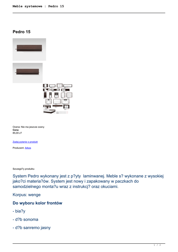 Meble systemowe : Pedro 15 Pedro 15 Ocena: Nie ma jeszcze oceny Cena 85,00 z? Zadaj pytanie o produkt Producent: Arkos Szczegó?y produktu System Pedro wykonany jest z p?yty laminwanej. Meble s? wykonane z wysokiej jako?ci materia?ów. System jest nowy i zapakowany w paczkach do samodzielnego monta?u wraz z instrukcj? oraz okuciami. Korpus: wenge Do wyboru kolor frontów - bia?y - d?b sonoma - d?b sanremo jasny 1 / 2 Meble systemowe : Pedro 15 Szeroko?? (cm) 100 WYMIARY Wysoko?? (cm) 25 G??boko?? (cm) 17 Opinie Nikt jeszcze nie ocenia? tego produktu. 2 / 2 Powered by TCPDF (www.tcpdf.org)