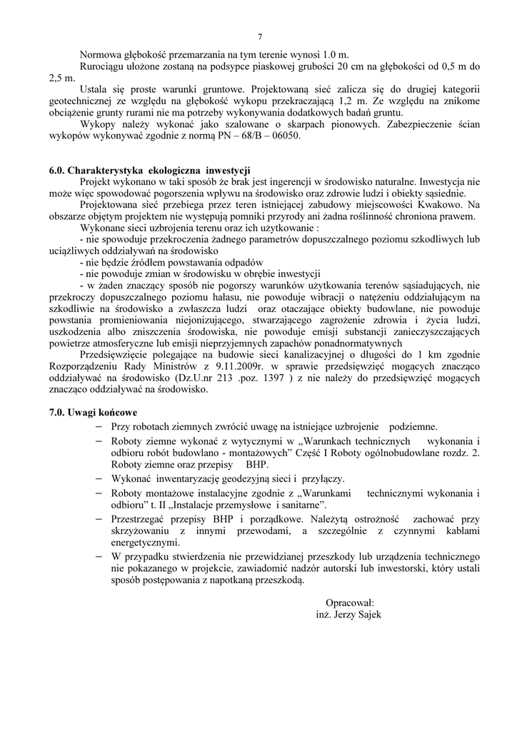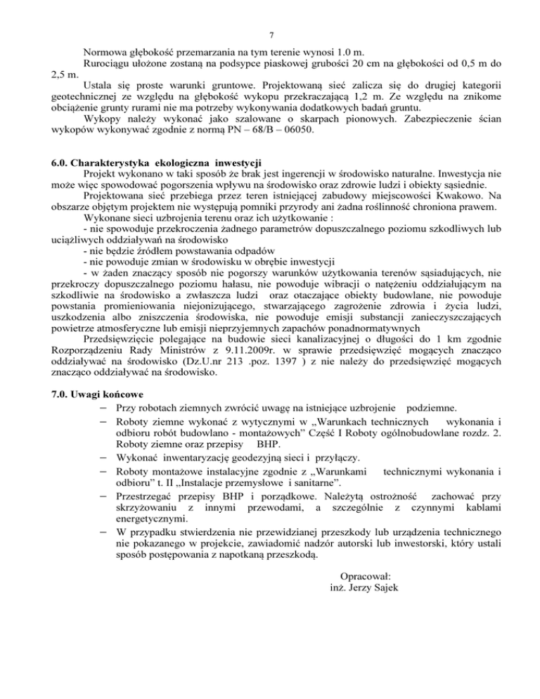 7 Normowa głębokość przemarzania na tym terenie wynosi 1.0 m. Rurociągu ułożone zostaną na podsypce piaskowej grubości 20 cm na głębokości od 0,5 m do 2,5 m. Ustala się proste warunki gruntowe. Projektowaną sieć zalicza się do drugiej kategorii geotechnicznej ze względu na głębokość wykopu przekraczającą 1,2 m. Ze względu na znikome obciążenie grunty rurami nie ma potrzeby wykonywania dodatkowych badań gruntu. Wykopy należy wykonać jako szalowane o skarpach pionowych. Zabezpieczenie ścian wykopów wykonywać zgodnie z normą PN – 68/B – 06050. 6.0. Charakterystyka ekologiczna inwestycji Projekt wykonano w taki sposób że brak jest ingerencji w środowisko naturalne. Inwestycja nie może więc spowodować pogorszenia wpływu na środowisko oraz zdrowie ludzi i obiekty sąsiednie. Projektowana sieć przebiega przez teren istniejącej zabudowy miejscowości Kwakowo. Na obszarze objętym projektem nie występują pomniki przyrody ani żadna roślinność chroniona prawem. Wykonane sieci uzbrojenia terenu oraz ich użytkowanie : - nie spowoduje przekroczenia żadnego parametrów dopuszczalnego poziomu szkodliwych lub uciążliwych oddziaływań na środowisko - nie będzie źródłem powstawania odpadów - nie powoduje zmian w środowisku w obrębie inwestycji - w żaden znaczący sposób nie pogorszy warunków użytkowania terenów sąsiadujących, nie przekroczy dopuszczalnego poziomu hałasu, nie powoduje wibracji o natężeniu oddziałującym na szkodliwie na środowisko a zwłaszcza ludzi oraz otaczające obiekty budowlane, nie powoduje powstania promieniowania niejonizującego, stwarzającego zagrożenie zdrowia i życia ludzi, uszkodzenia albo zniszczenia środowiska, nie powoduje emisji substancji zanieczyszczających powietrze atmosferyczne lub emisji nieprzyjemnych zapachów ponadnormatywnych Przedsięwzięcie polegające na budowie sieci kanalizacyjnej o długości do 1 km zgodnie Rozporządzeniu Rady Ministrów z 9.11.2009r. w sprawie przedsięwzięć mogących znacząco oddziaływać na środowisko (Dz.U.nr 213 .poz. 1397 ) z nie należy do przedsięwzięć mogących znacząco oddziaływać na środowisko. 7.0. Uwagi końcowe − Przy robotach ziemnych zwrócić uwagę na istniejące uzbrojenie podziemne. − Roboty ziemne wykonać z wytycznymi w „Warunkach technicznych wykonania i odbioru robót budowlano - montażowych” Część I Roboty ogólnobudowlane rozdz. 2. Roboty ziemne oraz przepisy BHP. − Wykonać inwentaryzację geodezyjną sieci i przyłączy. − Roboty montażowe instalacyjne zgodnie z „Warunkami technicznymi wykonania i odbioru” t. II „Instalacje przemysłowe i sanitarne”. − Przestrzegać przepisy BHP i porządkowe. Należytą ostrożność zachować przy skrzyżowaniu z innymi przewodami, a szczególnie z czynnymi kablami energetycznymi. − W przypadku stwierdzenia nie przewidzianej przeszkody lub urządzenia technicznego nie pokazanego w projekcie, zawiadomić nadzór autorski lub inwestorski, który ustali sposób postępowania z napotkaną przeszkodą. Opracował: inż. Jerzy Sajek