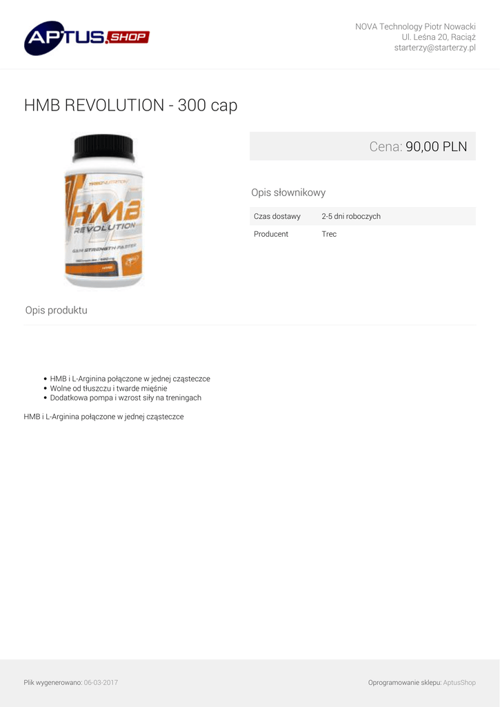 NOVA Technology Piotr Nowacki Ul. Leśna 20, Raciąż [email protected] HMB REVOLUTION - 300 cap Cena: 90,00 PLN Opis słownikowy Czas dostawy 2-5 dni roboczych Producent Trec Opis produktu HMB i L-Arginina połączone w jednej cząsteczce Wolne od tłuszczu i twarde mięśnie Dodatkowa pompa i wzrost siły na treningach HMB i L-Arginina połączone w jednej cząsteczce Plik wygenerowano: 06-03-2017 Powered by TCPDF (www.tcpdf.org) Oprogramowanie sklepu: AptusShop
