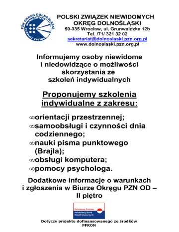 POLSKI ZWIĄZEK NIEWIDOMYCH OKRĘG DOLNOŚLĄSKI 50-335 Wrocław, ul. Grunwaldzka 12b Tel. /71/ 321 32 02 [email protected] www.dolnoslaski.pzn.org.pl Informujemy osoby niewidome i niedowidzące o możliwości skorzystania ze szkoleń indywidualnych Proponujemy szkolenia indywidualne z zakresu: • orientacji przestrzennej; • samoobsługi i czynności dnia codziennego; • nauki pisma punktowego (Brajla); • obsługi komputera; • pomocy psychologa. Dodatkowe informacje o warunkach i zgłoszenia w Biurze Okręgu PZN OD – II piętro