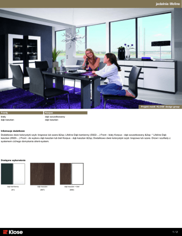 jadalnia lifeline Projekt mebli: KLOSE design group Fronty Korpus biały dąb kasztan dąb szczotkowany dąb kasztan Informacje dodatkowe Dodatkowo dwie kolorystyki szyb: brązowa lub szara &2sp; Lifeline Dąb kamienny (5922-...) Front - biały Korpus - dąb szczotkowany &2sp; * Lifeline Dąb kasztan (5920-...) Front - do wyboru dąb kasztan lub biel Korpus - dąb kasztan &2sp; Dodatkowo dwie kolorystyki szyb: brązowa lub szara. Drzwi i szuflady z systemem cichego domykania silent-system. Dostępne wybarwienia dąb kamienny dąb kasztan dąb kasztan + biel (81) (667) (668) 1/2 jadalnia lifeline Elementy zestawu witryna witryna witryna lewa witryna prawa witryna lewa witryna prawa 5922-19 5920-19* 5922-30 5920-30* 5922-17 5920-17* 5922-18 5920-18* 5922-31 5920-31* 5922-32 5920-32* 120/211/41 120/211/41 60/211/41 60/211/41 60/211/41 60/211/41 witryna wisząca witryna wisząca witryna wisząca lewa witryna wisząca prawa kredens wysoki kredens wysoki 5922-16 5920-16* 5922-15 5920-15* 5922-33 5920-33* 5922-34 5920-34* 5922-14 5920-14* 5922-12 5920-12* 121/46/41 121/46/41 80/135/41 80/135/41 181/141/41 121/141/41 kredens wysoki kredens wysoki kredens kredens kredens kredens 5922-13 5920-13* 5922-27 5920-27* 5922-03 5920-03* 5922-02 5920-02* 5922-08 5920-08* 5922-01 5920-01* 121/141/41 121/141/41 221/93/41 181/83/41 161/45/57 241/45/57 słupek A słupek B słupek A słupek B stół stół 5922-35 5920-35* 5922-36 5920-36* 5922-25 5920-25* 5922-26 5920-26* 1894-11 1894-12 80/141/41 80/141/41 80/141/41 80/141/41 100x160/200, wys. 75 100x180/220, wys. 75 stół stół z płytą szklaną stół z płytą szklaną krzesło krzesło półka wisząca 1894-13 2441-31 2441-32 6291-26 6551-37 5922-20 5920-20* 100x200/240, wys. 75 95x160, wys. 77 cm 95x180, wys. 77 cm 102/46/51/47 96/46/57/48 120/13/20 półka szklana pod TV 5920-21 105/15/40 Wymiary podawane w kolejności szer./wys./głębokość 2/2