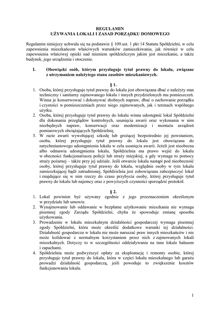 REGULAMIN UŻYWANIA LOKALI I ZASAD PORZĄDKU DOMOWEGO Regulamin niniejszy uchwala się na podstawie § 109.ust. 1 pkt 14 Statutu Spółdzielni, w celu zapewnienia mieszkańcom właściwych warunków zamieszkiwania, jak również w celu zapewnienia właściwej opieki nad mieniem spółdzielczym jakim jest mieszkanie, a także budynek, jego urządzenia i otoczenie. I. Obowiązki osób, którym przysługuje tytuł prawny do lokalu, związane z utrzymaniem należytego stanu zasobów mieszkaniowych. § 1. 1. Osoba, której przysługuje tytuł prawny do lokalu jest obowiązana dbać o należyty stan techniczny i sanitarny zajmowanego lokalu i innych przydzielonych mu pomieszczeń. Winna je konserwować i dokonywać drobnych napraw, dbać o zachowanie porządku i czystości w pomieszczeniach przez niego zajmowanych, jak i terenach wspólnego użytku. 2. Osoba, której przysługuje tytuł prawny do lokalu winna udostępnić lokal Spółdzielni dla dokonania przeglądów kontrolnych, usunięcia awarii oraz wykonania w nim niezbędnych napraw, konserwacji oraz modernizacji i montażu urządzeń pomiarowych obciążających Spółdzielnię. 3. W razie awarii wywołującej szkodę lub grożącej bezpośrednio jej powstaniem, osoba, której przysługuje tytuł prawny do lokalu jest obowiązana do natychmiastowego udostępnienia lokalu w celu usunięcia awarii. Jeżeli jest nieobecna albo odmawia udostępnienia lokalu, Spółdzielnia ma prawo wejść do lokalu w obecności funkcjonariusza policji lub straży miejskiej, a gdy wymaga to pomocy straży pożarnej – także przy jej udziale. Jeśli otwarcie lokalu nastąpi pod nieobecność osoby, której przysługuje tytuł prawny do lokalu, względnie osoby w tym lokalu zamieszkującej bądź zatrudnionej, Spółdzielnia jest zobowiązana zabezpieczyć lokal i znajdujące się w nim rzeczy do czasu przybycia osoby, której przysługuje tytuł prawny do lokalu lub najemcy oraz z powyższych czynności sporządzić protokół. 1. 2. 3. 4. § 2. Lokal powinien być używany zgodnie z jego przeznaczeniem określonym w przydziale lub umowie. Wynajmowanie lub oddawanie w bezpłatne użytkowanie mieszkania nie wymaga pisemnej zgody Zarządu Spółdzielni, chyba że spowoduje zmianę sposobu użytkowania. Prowadzenie w lokalu mieszkalnym działalności gospodarczej wymaga pisemnej zgody Spółdzielni, która może określić dodatkowe warunki tej działalności. Działalność gospodarcza w lokalu nie może naruszać praw innych mieszkańców i nie może kolidować z normalnym korzystaniem przez nich z zajmowanych lokali mieszkalnych. Dotyczy to w szczególności oddziaływania na inne lokale hałasem i zapachami. Spółdzielnia może podwyższyć opłaty za eksploatację i remonty osobie, której przysługuje tytuł prawny do lokalu, która w części lokalu mieszkalnego lub garażu prowadzi działalność gospodarczą, jeśli powoduje to zwiększenie kosztów funkcjonowania lokalu. 1 § 3. 1. Wszelkie przeróbki wnętrza, a zwłaszcza stawianie i rozbieranie ścianek działowych, przebudowa balkonów i loggii, zakładanie krat w oknach itp. mogą być dokonywane po uprzednim uzyskaniu pisemnej zgody Zarządu Spółdzielni, wyjednaniu zezwoleń przewidzianych przepisami prawa budowlanego i powinny być wykonywane zgodnie z wymogami tego prawa. Spółdzielnia może usunąć dokonane samowolnie przeróbki na koszt osoby, której przysługuje tytuł prawny do lokalu oraz zastosować dalsze konsekwencje (względem członka – charakteru organizacyjnego, a względem najemcy – rozwiązanie umowy, względem właściciela – przymusowa sprzedaż lokalu). § 4. 1. Zabrania się naprawiania we własnym zakresie bezpieczników instalacji elektrycznej poza obrębem lokalu (na klatkach schodowych, w piwnicach itp.), ze względu na grożące niebezpieczeństwo porażenia prądem, spowodowania pożaru i możliwość uszkodzenia instalacji. W przypadku stwierdzenia tego rodzaju uszkodzeń należy niezwłocznie zawiadomić Spółdzielnię lub gospodarza domu. 2. Zabrania się używania urządzeń powodujących zakłócenia w odbiorze programu radiowego i telewizyjnego. 3. Instalowanie dodatkowego oświetlenia elektrycznego w pomieszczeniach niemieszkalnych (jak schowki, boksy, garaże itp.) wymaga zgody Spółdzielni. § 5. 1. Wchodzenie na dachy budynków bez zgody Spółdzielni jest niedozwolone. 2. Zakładanie anten radiowych i telewizyjnych oraz przyłączanie się do zbiorczych anten telewizyjnych jest dozwolone tylko za zgodą Zarządu Spółdzielni i przez osoby zawodowo przygotowane. W przypadku naruszenia tego postanowienia, Spółdzielnia po uprzednim wezwaniu – usunie ww. urządzenia na koszt osoby, której przysługuje tytuł prawny do lokalu. 3. Zabrania się likwidacji przyłączeń i gniazd anten zbiorczych. § 6. 1. Z uwagi na możliwość wystąpienia awarii w lokalach pod nieobecność ich użytkowników i konieczność usunięcia awarii, mieszkańcy zobowiązani są podać w Spółdzielni numery telefonów kontaktowych, a w przypadku dłuższej nieobecności – adres kontaktowy. 2. Koszty naprawy szkód wyrządzonych w sąsiadujących lokalach z winy użytkownika lokalu obciążają osobę, której przysługuje tytuł prawny do lokalu lub mieszkańca, który spowodował szkodę. § 7. 1. Postanowienia regulaminu określające obowiązki osoby, której przysługuje tytuł prawny do lokalu odnoszą się odpowiednio do innych osób korzystających z lokali, a w szczególności do członków rodzin i osób zajmujących mieszkania bez tytułu prawnego (osoby pozbawione członkostwa, spadkobiercy, którzy nie załatwili formalności z przejęciem prawa do lokali). 2 II. Obowiązki mieszkańców. § 8. 1. Do obowiązków osób, którym przysługuje tytuł prawny do lokalu i mieszkańców należy utrzymanie lokalu oraz balkonów i loggii w należytym stanie czystości i higieny. 2. Wszystkie osoby, którym przysługują tytuły prawne do lokali i mieszkańcy 