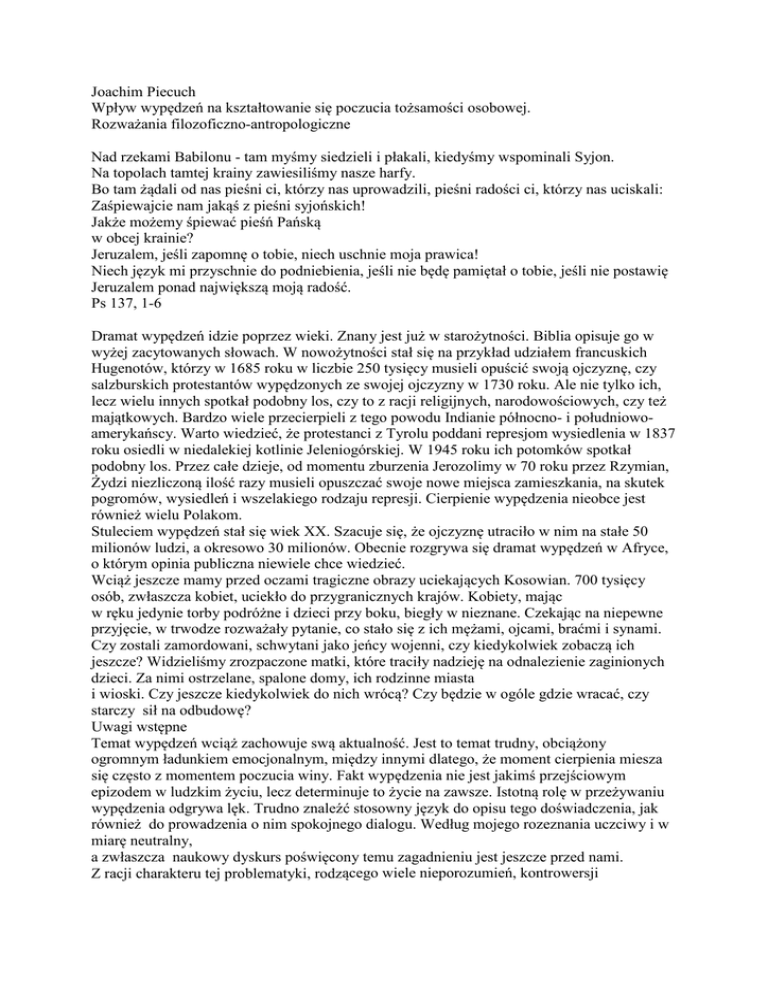 Joachim Piecuch Wpływ wypędzeń na kształtowanie się poczucia tożsamości osobowej. Rozważania filozoficzno-antropologiczne Nad rzekami Babilonu - tam myśmy siedzieli i płakali, kiedyśmy wspominali Syjon. Na topolach tamtej krainy zawiesiliśmy nasze harfy. Bo tam żądali od nas pieśni ci, którzy nas uprowadzili, pieśni radości ci, którzy nas uciskali: Zaśpiewajcie nam jakąś z pieśni syjońskich! Jakże możemy śpiewać pieśń Pańską w obcej krainie? Jeruzalem, jeśli zapomnę o tobie, niech uschnie moja prawica! Niech język mi przyschnie do podniebienia, jeśli nie będę pamiętał o tobie, jeśli nie postawię Jeruzalem ponad największą moją radość. Ps 137, 1-6 Dramat wypędzeń idzie poprzez wieki. Znany jest już w starożytności. Biblia opisuje go w wyżej zacytowanych słowach. W nowożytności stał się na przykład udziałem francuskich Hugenotów, którzy w 1685 roku w liczbie 250 tysięcy musieli opuścić swoją ojczyznę, czy salzburskich protestantów wypędzonych ze swojej ojczyzny w 1730 roku. Ale nie tylko ich, lecz wielu innych spotkał podobny los, czy to z racji religijnych, narodowościowych, czy też majątkowych. Bardzo wiele przecierpieli z tego powodu Indianie północno- i południowoamerykańscy. Warto wiedzieć, że protestanci z Tyrolu poddani represjom wysiedlenia w 1837 roku osiedli w niedalekiej kotlinie Jeleniogórskiej. W 1945 roku ich potomków spotkał podobny los. Przez całe dzieje, od momentu zburzenia Jerozolimy w 70 roku przez Rzymian, Żydzi niezliczoną ilość razy musieli opuszczać swoje nowe miejsca zamieszkania, na skutek pogromów, wysiedleń i wszelakiego rodzaju represji. Cierpienie wypędzenia nieobce jest również wielu Polakom. Stuleciem wypędzeń stał się wiek XX. Szacuje się, że ojczyznę utraciło w nim na stałe 50 milionów ludzi, a okresowo 30 milionów. Obecnie rozgrywa się dramat wypędzeń w Afryce, o którym opinia publiczna niewiele chce wiedzieć. Wciąż jeszcze mamy przed oczami tragiczne obrazy uciekających Kosowian. 700 tysięcy osób, zwłaszcza kobiet, uciekło do przygranicznych krajów. Kobiety, mając w ręku jedynie torby podróżne i dzieci przy boku, biegły w nieznane. Czekając na niepewne przyjęcie, w trwodze rozważały pytanie, co stało się z ich mężami, ojcami, braćmi i synami. Czy zostali zamordowani, schwytani jako jeńcy wojenni, czy kiedykolwiek zobaczą ich jeszcze? Widzieliśmy zrozpaczone matki, które traciły nadzieję na odnalezienie zaginionych dzieci. Za nimi ostrzelane, spalone domy, ich rodzinne miasta i wioski. Czy jeszcze kiedykolwiek do nich wrócą? Czy będzie w ogóle gdzie wracać, czy starczy sił na odbudowę? Uwagi wstępne Temat wypędzeń wciąż zachowuje swą aktualność. Jest to temat trudny, obciążony ogromnym ładunkiem emocjonalnym, między innymi dlatego, że moment cierpienia miesza się często z momentem poczucia winy. Fakt wypędzenia nie jest jakimś przejściowym epizodem w ludzkim życiu, lecz determinuje to życie na zawsze. Istotną rolę w przeżywaniu wypędzenia odgrywa lęk. Trudno znaleźć stosowny język do opisu tego doświadczenia, jak również do prowadzenia o nim spokojnego dialogu. Według mojego rozeznania uczciwy i w miarę neutralny, a zwłaszcza naukowy dyskurs poświęcony temu zagadnieniu jest jeszcze przed nami. Z racji charakteru tej problematyki, rodzącego wiele nieporozumień, kontrowersji i sprzeciwów, oraz ze względu na niejasność samego terminu "poczucie tożsamości osobowej", którego użyłem w tytule niniejszego referatu, uważam za konieczne, by moje analizy poprzedzić szerszymi uwagami wstępnymi. Pierwszy krąg uwag dotyczy pojęcia wypędzenia i kojarzonych z nim treści. W moim wystąpieniu pragnę, o ile to możliwe, nie wdawać się w żadną dyskusję natury politycznej, chociaż zdaję sobie sprawę z tego, że kontekst historyczny, a więc i polityczny nie jest w pełni możliwy do uniknięcia. Wypędzenia dokonywały się bowiem w konkretnej sytuacji i moment świadomości politycznej czy to indywidualnej, czy kolektywnej wpływał na kształtowanie się poczucia własnej tożsamości. Nie chcę też wdawać się w spory terminologiczne, czy mamy do czynienia z wypędzeniami, wysiedleniami, repatriacją, czy też z "transferem ludności". Są to spory, które pozostawiam historykom. W ich gronie powinno dojść do jasnego odgraniczenia treści jednego terminu od drugiego i klarownego ich zdefiniowania. Każdy z tych terminów posiada pewne zabarwienie emocjonalne i kryje się za nimi chęć wyrażenia tego, że jednych spotkał okrutniejszy los od drugich. Z tej racji podlegają one często rozmaitym formom ideologizacji, skutkiem czego dla zaspokojenia aktualnych potrzeb politycznych - traci się z oczu cierpienia jednostek. W ocenianiu martyrologii, zła, krzywd i mordów dokonanych w czasie wojny i jeszcze po jej zakończeniu zaistniało zjawisko nazwane przez niektórych autorów "konkurencją w świecie ofiar" (Konkurenz der Opfer)1. Polacy, podobnie jak Żydzi, mają do opłakania 3 miliony ofiar. Tymczasem fakt ten zdaje się nie docierać do świadomości wielu ludzi i umyka nawet znaczącym politykom, o czym świadczą ich wypowiedzi. Często słusznie albo niesłusznie z punktu widzenia takiej "konkurencji w świecie ofiar" wychodzi się w momencie, kiedy pada słowo "wypędzenie". Również takiej retoryki, prowadzącej do licytowania się, kto więcej wycierpiał, chciałbym uniknąć. Nie kwestionując przy tym, że jedni wycierpieli o wiele więcej aniżeli inni, chciałbym skupić się jedynie na indywidualnych przeżyciach ludzi wypędzonych. Nie chcę też wdawać się w dyskusję nad rozmaitymi formami zmuszania ludzi do opuszczenia swoich rodzinnych stron. Niezależnie od tego, jaki stosuje się tutaj termin, czy mówi się o "uciekinierach", tak jak w przypadku niektórych polskich Żydów, którzy uciekali z Polski po najeździe hitlerowskim w 1939r.
