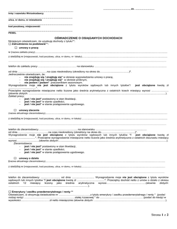........................................, dn. ............................. .................................................................................................. Imię i nazwisko Wnioskodawcy ................................................................................................. ulica, nr domu, nr mieszkania ................................................................................................. kod pocztowy, miejscowość ................................................................................................. PESEL OŚWIADCZENIE O OSIĄGANYCH DOCHODACH Niniejszym oświadczam, że uzyskuję dochody z tytułu**: Zatrudnienia na podstawie**: umowy o pracę w (nazwa zakładu pracy).................................................................................................................................................................................. z siedzibą w (miejscowość, kod pocztowy, ulica, nr domu, nr lokalu)................................................................................................................... …………………………………………………………………………………………………………………………………………………………… telefon do zakładu pracy ................................................... na stanowisku …………………………............................................................. od dnia .......................................na czas nieokreślony (określony na okres do……................................)*. Jednocześnie oświadczam, że: − nie znajduję się / znajduję się* w okresie wypowiedzenia umowy o pracę, − nie znajduję się / znajduję się* w okresie próbnym, − nie jestem / jestem* pracownikiem sezonowym. Wynagrodzenie moje nie jest obciążone z tytułu wyroków sądowych lub innych tytułów*/ jest obciążone kwotą zł .....................................*. Przeciętne wynagrodzenie miesięczne netto liczone jako średnia arytmetyczna z ostatnich trzech miesięcy wynosi ....................... (słownie złotych: ........................................................................................................................................................................................). Zakład pracy: − jest / nie jest* postawiony w stan likwidacji, − jest / nie jest* w stanie upadłości, − jest / nie jest* w stanie postępowania ugodowego. umowy zlecenie (nazwa aktualnego zleceniodawcy).................................................................................................................................................................... z siedzibą w (miejscowość, kod pocztowy, ulica, nr domu, nr lokalu) ................................................................................................................... …………………………………………………………………………………………………………………………………………………………… telefon do zleceniodawcy…………………........................... na stanowisku ..................................................................... od dnia………...............................na czas nieokreślony (określony na okres do…………...............................)*. Wynagrodzenie moje nie jest obciążone z tytułu wyroków sądowych lub innych tytułów */ jest obciążone kwotą zł ....................................*. Przeciętne wynagrodzenie miesięczne netto liczone jako średnia arytmetyczna z ostatnich dwunastu miesięcy wynosi…….......................(słownie złotych:.................................................................................................................................................). Zleceniodawca: − jest / nie jest* postawiony w stan likwidacji, − jest / nie jest* w stanie upadłości, − jest / nie jest* w stanie postępowania ugodowego. umowy o dzieło (nazwa aktualnego zleceniodawcy)................................................................................................................................................................. z siedzibą w (miejscowość, kod pocztowy, ulica, nr domu, nr lokalu)................................................................................................................. …………………………………………………………………………………………………………………………………………………………. telefon do zleceniodawcy .......................... od dnia .............................. Wynagrodzenie moje nie jest obciążone z tytułu wyroków sądowych lub innych tytułów */ jest obciążone kwotą zł .....................................*. Przeciętny dochód netto z umów o dzieło z okresu ostatnich 12 miesięcy liczony jako średnia arytmetyczna wynosi……………………........................(słownie złotych: ...........................................................................................................). Emerytury / zasiłku przedemerytalnego / renty ** Oświadczam, iż otrzymuję świadczenie nr ……………………….……..z tytułu emerytury / zasiłku przedemerytalnego / renty * (podać rodzaj renty) …………………………………………………stałej /czasowej * do ………………………………………… (podać do kiedy) w wysokości.......................................zł netto miesięcznie (słownie złotych: ................................................................................................). Strona 1 z 2 Własnej działalności gospodarczej Oświadczam, iż prowadzę własną działalność gospodarczą pod nazwą (nazwa)………………………………………………………………................................................................................................................... z siedzibą w (miejsc