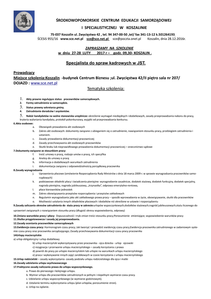 ŚRODKOWOPOMORSKIE CENTRUM EDUKACJI SAMORZĄDOWEJ I SPECJALISTYCZNEJ W KOSZALINIE 75-037 Koszalin ul. Zwycięstwa 42 , tel. 94 347-00-50 ,tel/ fax 341-13-12 k.501264193 ŚCESiS 955/16 www.sce.net.pl [email protected] [email protected] Koszalin, dnia 28.12.2016r. ZAPRASZAMY NA SZKOLENIE w dniu 27-28 LUTY 2017 r – godz. 09,30- KOSZALIN . Specjalista do spraw kadrowych w JST. Prowadzący Miejsce szkolenia:Koszalin -budynek Centrum Biznesu ;ul. Zwycięstwa 42/II piętro sala nr 207/ DOJAZD : www.sce.net.pl Tematyka szkolenia: 1. Akty prawne regulujące status pracowników samorządowych. Formy zatrudnienia w samorządzie. 3. Status prawny sekretarza gminy. Zatrudnianie doradców i asystentów. 2. 4. 5. Nabór kandydatów na wolne stanowiska urzędnicze: określenie wymagań niezbędnych i dodatkowych, zasady przeprowadzania naboru do pracy, kryteria wyłaniania kandydata, protokół pokonkursowy, wyjątki od przeprowadzania konkursu. 6.Akta osobowe: a. Obowiązek prowadzenia akt osobowych b. Zakres akt osobowych: dokumenty związane z ubieganiem się o zatrudnienie, nawiązaniem stosunku pracy, przebiegiem zatrudnienia i ustaniem. c. Zasady prowadzenia dokumentacji pracowniczej d. Zasady przechowywania akt osobowych pracowników e. Skutki braku lub nieprawidłowego prowadzenia dokumentacji pracowniczej – orzecznictwo sądowe 7.Dokumenty związane ze stosunkiem pracy: f. treść umowy o pracę, rodzaje umów o pracę, ich specyfika g. Aneksy do umowy o pracę h. informacja o dodatkowych warunkach zatrudnienia i. dokumentacja związana z odpowiedzialnością porządkową pracownika 8.Zasady wynagradzania j. Uprawnienia płacowe (omówienie Rozporządzenia Rady Ministrów z dnia 18 marca 2009 r. w sprawie wynagradzania pracowników samorządowych) k. podstawowe składniki płacy i świadczenia pieniężne: wynagrodzenie zasadnicze, dodatek stażowy, dodatek funkcyjny, dodatek specjalny, nagroda pieniężna, nagroda jubileuszowy, „trzynastka”, odprawa emerytalno-rentowa, l. płace kierowników jednostek m. Zakres obowiązywania przepisów rozporządzenia i przepisów zakładowych n. Regulamin wynagradzania jako akt zakładowego prawa pracy – sposób wprowadzenia w życie, obowiązywanie, skutki dla pracowników o. Możliwości ustalania innych składników płacowych i dodatków niż określone w ustawie i rozporządzeniu 9.Zasady zaliczania okresów zatrudnienia do stażu pracy w zakresie:urlopów wypoczynkowych;dodatków stażowych;nagród jubileuszowych;stażu liczonego do uprawnień związanych z rozwiązaniem stosunku pracy (długość okresu wypowiedzenia, odprawy) 10.Zmiana warunków pracy i płacy: Dopuszczalność i tryb zmian treści stosunku pracy;Porozumienie zmieniające; wypowiedzenie warunków pracy 11.Służba przygotowawcza i zasady jej przeprowadzania. 12.Zasady oceniania pracowników samorządowych 13.Ewidencja czasu pracy: Harmonogram czasu pracy; Jak tworzyć i prowadzić ewidencję czasu pracy;Ewidencja pracownika zatrudnionego w zadaniowym systemie czasu pracy oraz pracownika zarządzającego; Zasady przechowywania dokumentacji czasu pracy pracownika 14Urlopy macierzyńskie a) urlop obligatoryjny i urlop dodatkowy b) urlop macierzyński wykorzystywany przez pracownika - ojca dziecka - urlop ojcowski c) rezygnacja i przerwanie urlopu macierzyńskiego – zasady korzystania z prawa d) powrót do pracy po urlopie macierzyńskim lub urlopie na warunkach urlopu macierzyńskiego e) praca i wykonywanie innych zajęć zarobkowych w czasie korzystania z urlopu macierzyńskiego 15.Urlop rodzicielski – zasady wykorzystania -zasady podziału urlopu rodzicielskiego dla ojca i matki 16.Zasady udzielania urlopu wychowawczego 17.Praktyczne zasady naliczania prawa do urlopu wypoczynkowego. a. Prawo do pierwszego i kolejnego urlopu. b. Wymiar urlopu dla pracowników zatrudnionych w pełnym i niepełnym wymiarze czasu pracy. c. Udzielanie urlopu wypoczynkowego (w wymiarze godzinowym). d. Ustalanie terminu wykorzystania urlopu (plan urlopów, porozumienie stron). e. Urlop na żądanie. f. Wykorzystanie urlopów zaległych g. Urlop w okresie wypowiedzenia umowy a zwolnienie z obowiązku świadczenia pracy. f. Wpływ choroby na urlop wypoczynkowy. 18.Urlop bezpłatny. a. Rodzaje urlopów bezpłatnych ( wliczane do okresu zatrudnienia, nie wliczane do okresu zatrudnienia – podobieństwa i różnice). 19.Zwolnienia od pracy i zasady usprawiedliwiania nieobecności w pracy a. Przyczyny usprawiedliwiające nieobecność z mocy prawa/uznane przez pracodawcę. b. Obowiązki pracownika/obowiązki pracodawcy c. Zachowanie prawa do wynagrodzenia/brak prawa do wynagrodzenia. 20.Rozwiązywanie umów o pracę: a. b. Rozwiązanie umowy o pracę na zasadzie porozumienia stron Rozwiązanie umowy o pracę za wypowiedzeniem, 1.wypowiedzenie umów terminowych 2.wypowiedzenie umowy zawartej na czas nieokreślony c. Rozwiązanie umowy o pracę bez wypowiedzenia 1. Rozwiązanie umowy o pracę z przyczyn zawinionych przez pracownika 2. Rozwiązanie umowy o pracę z przyczyn niezawinionych przez pracownika 3. Rozwiązanie umowy o pracę bez wypowiedzenia d. Rozwiązanie umowy z przyczyn nie dotyczących pracownika. e. pracownicy podlegający szczególnej ochronie f. odprawy pieniężne. 21. Świadectwo pracy: a. Zasady prawidłowego sporządzania świadectwa pracy, termin, treść b. Obligatoryjne i fakultatywne elementy treści świadectwa pracy, jakich informacji nie można zamieszczać w świadectwie pracy, informacje o wykorzystanym urlopie wypoczynkowym, urlopie na żądanie oraz wypłaconym ekwiwalencie urlopowym, podstawa rozwiązania umowy o pracę c. Sprostowanie świadectwa pracy 22. Udostępnianie dokumentów pracownikowi i osobom trzecim np. radnym. 23. Wzory pism i dokumentów związanych z realizacją obowiązków ustawowych. Materiały szkoleniowe obejmują część teoretyczną, obowiązujące orzecznictwo sądowe oraz wzory dokumentów pism które można wykorzystać w bieżącej pracy.
