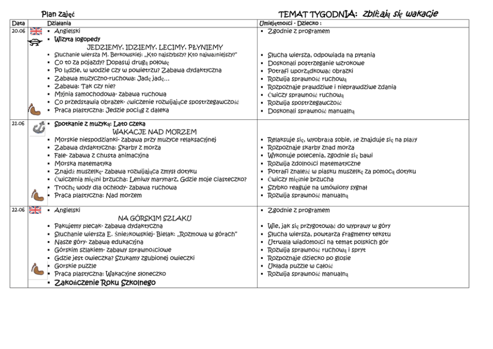 TEMAT TYGODNIA: Plan zajęć Data 20.06 Działania Umiejętności - Dziecko : Angielski Wizyta logopedy JEDZIEMY, IDZIEMY, LECIMY, PŁYNIEMY Zgodnie z programem Słuchanie wiersza M. Berkowskiej: „Kto najszybszy? Kto najważniejszy?” Co to za pojazdy? Dopasuj drugą połowę Po lądzie, w wodzie czy w powietrzu? Zabawa dydaktyczna Zabawa muzyczno-ruchowa: Jadę jadę… Zabawa: Tak czy nie? Myjnia samochodowa- zabawa ruchowa Co przedstawia obrazek- ćwiczenie rozwijające spostrzegawczość Praca plastyczna: Jedzie pociąg z daleka Słucha wiersza, odpowiada na pytania Doskonali postrzeganie wzrokowe Potrafi uporządkować obrazki Rozwija sprawność ruchową Rozpoznaje prawdziwe i nieprawdziwe zdania Ćwiczy sprawność ruchową Rozwija spostrzegawczość Doskonali sprawność manualną Spotkanie z muzyką: Lato czeka WAKACJE NAD MORZEM Morskie niespodzianki- zabawa przy muzyce relaksacyjnej Zabawa dydaktyczna: Skarby z morza Fale- zabawa z chusta animacyjna Morska matematyka Znajdź muszelkę- zabawa rozwijająca zmysł dotyku Ćwiczenia mięśni brzucha: Leniwy marynarz, Gdzie moje ciasteczko? Trochę wody dla ochłody- zabawa ruchowa Praca plastyczna: Nad morzem Relaksuje się, wyobraża sobie, że znajduje się na plaży Rozpoznaje skarby znad morza Wykonuje polecenia, zgodnie się bawi Rozwija zdolności matematyczne Potrafi znaleźć w piasku muszelkę za pomocą dotyku Ćwiczy mięśnie brzucha Szybko reaguje na umówiony sygnał Rozwija sprawność manualną Angielski Zgodnie z programem NA GÓRSKIM SZLAKU Pakujemy plecak- zabawa dydaktyczna Słuchanie wiersza E. Śnieżkowskiej- Bielak: „Rozmowa w górach” Nasze góry- zabawa edukacyjna Górskim szlakiem- zabawy sprawnościowe Gdzie jest owieczka? Szukamy zgubionej owieczki Gorskie puzzle Praca plastyczna: Wakacyjne słoneczko 21.06 22.06 zbliżają się wakacje Zakończenie Roku Szkolnego Wie, jak się przygotować do wyprawy w góry Słucha wiersza, powtarza fragmenty tekstu Utrwala wiadomości na temat polskich gór Rozwija sprawność ruchową i spryt Rozpoznaje dziecko po glosie Układa puzzle w całość Rozwija sprawność manualną 23.06 Rytmika 24.06 Z MAPĄ W RĘKU List w butelce- odczytujemy list Mapa skarbu- zabawa tropiąca Zabawa: Niebezpieczna droga Klucz do bramy- traf do celu Zabawa ucząca współpracy: Pomóż koledze Zjedz do podziemi – zabawa dla spryciarzy Ćwiczenie w skakaniu w dal: Przeskocz na drugą stronę Mądra głowa- rozwiązywanie zagadek Uwaga rekiny- zabawa sprawnościowa Zabawa: Na drugą stronę Balonowa gra- celny strzał Zdobywamy skarb! WITAMY WAKACJE! Słuchanie opowiadania Z. Szczepańskiego: „Przygoda Podróżnika” Bezpieczne wakacje- zabawa dydaktyczna Zabawa rozwijająca spryt i zwinność: Nad wodą Wykonie ćwiczenia na karcie pracy W lodziarni- zabawa tematyczna Praca plastyczna: Pudełko na wakacyjne pamiątki Zapoznaje się ze wskazówkami zawartymi w liście Szuka mapy sugerując się wskazówkami Przechodzi trasę po wyznaczonych elementach Trafia do celu Współpracuje z dziećmi Zjeżdża ze zjeżdżalni uważając na przeszkody Ćwiczy skok w dal Rozwiązuje zagadki Przechodzi dookoła piaskownicy, tak żeby nie spaść Skupia się na zadaniu Ćwiczy celny strzał Okazuje radość ze zdobytego skarbu Doskonali Słucha opowiadania, odpowiada na pytania Wie, jak bezpiecznie spędzić wakacje Rozwija spryt i zwinność Wykonuje ćwiczenie na karcie pracy Bawi się w lodziarnię, przelicza na konkretach Rozwija sprawność manualna