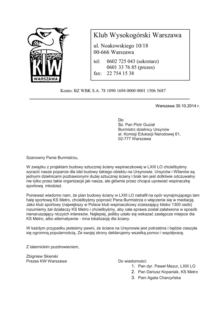 Klub Wysokogórski Warszawa ul. Noakowskiego 10/18 00-666 Warszawa tel: 0602 725 043 (sekretarz) 0601 33 76 85 (prezes) fax: 22 754 15 38 Konto: BZ WBK S.A. 78 1090 1694 0000 0001 1506 5687 Warszawa 30.10.2014 r. Do Sz. Pan Piotr Guział Burmistrz dzielnicy Ursynów al. Komisji Edukacji Narodowej 61, 02-777 Warszawa Szanowny Panie Burmistrzu, W związku z projektem budowy sztucznej ściany wspinaczkowej w LXIII LO chcielibyśmy wyrazić nasze poparcie dla idei budowy takiego obiektu na Ursynowie. Ursynów i Wilanów są jednymi dzielnicami pozbawionymi dużej sztucznej ściany i brak ten jest dotkliwie odczuwalny nie tylko przez takie organizacje jak nasza, ale głównie przez chcąca uprawiać wspinaczkę sportową młodzież. Ponieważ wiadomo nam, że plan budowy ściany w LXIII LO natrafił na opór wynajmującego tam halę sportową KS Metro, chcielibyśmy poprosić Pana Burmistrza o włączenie się w mediację. Jako klub sportowy (największy w Polsce klub wspinaczkowy zrzeszający blisko 1300 osób) rozumiemy żal działaczy KS Metro i chcielibyśmy, aby cała sprawa został załatwiona w sposób nienaruszający niczyich interesów. Najlepiej, jeśliby udało się wskazać zastępcze miejsce dla KS Metro, albo alternatywnie - inna lokalizację dla ściany. W każdym przypadku jesteśmy pewni, że ściana na Ursynowie jest potrzebna i będzie cieszyła się ogromną popularnością. Ze swojej strony deklarujemy wszelką pomoc i współpracę. Z taternickim pozdrowieniem, Zbigniew Skierski Prezes KW Warszawa Do wiadomości: 1. Pan dyr. Paweł Mazur, LXIII LO 2. Pan Dariusz Kopaniak, KS Metro 3. Pani Agata Charzyńska