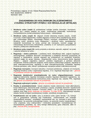 Prowadzący zajęcia: dr inŜ. Edyta Ropuszyńska-Surma Rok akademicki: 2009/10 Semestr: letni ZAGADNIENIA DO KOLOKWIUM ZALICZENIOWEGO Z KURSU STRUKTURY RYNKU I ICH REGULACJE (WYKŁAD) 1. Struktura rynku (część I): podstawowe rodzaje rynków (monopol, monopson, polipol, itp.), bariery wejścia na rynek, konkurencja doskonała, konkurencja monopolistyczna (model podwójnej funkcji popytu - interpretacja), 2. Struktura rynku (część II): oligopol (model złamanej krzywej popytu, model Cournota, model Edgewortha, modele oligopolu w którym firmy współpracują, teoria gier (równowaga Nasha, równowaga Pareto), monopol, podstawowe elementy struktury rynku, struktura rynku dostawców i struktura rynku sprzedawców, wskaźniki koncentracji na rynku, pomiar siły monopolu, zwrócić uwagę na interpretację ekonomiczną wskaźników, problemy w ich wyliczaniu (pozyskiwaniu danych), praktyczne zastosowanie. 3. Struktura rynku (część III): cechy produktu a struktura, warunki „wejścia” na rynek i warunki istnienia na rynku. 4. Regulacja i dobra publiczne – podstawy teorii, klasyfikacja dóbr, pojęcia regulacja i samoregulacja, podejście ekonomii normatywnej a podejście ekonomii pozytywnej do regulacji w gospodarce, podział regulacji wg omawianych na wykładzie kryteriów, (zwrócić wagę na: grupy interesu, niesprawność rynku, ekonomiczna teoria regulacji Stiglera – pojęcie „regulatory capture”, państwo regulacyjne a państwo aktywnie zarządzane, finanse publiczne (pojęcie), teoria wyboru publicznego (pojęcie), regulacje w skali makroekonomicznej, regulacje w skali mikroekonomicznej, przesłanki regulacji (funkcje państwa), cele, zakres i podstawowe narzędzia polityki makroekonomicznej 5. Regulacja monopolu: monopol naturalny i monopol państwowy, odejście od monopolu, regulacja struktury rynku i organizacja regulacji, .m.in. regulacje dotyczące cen – głównie na podstawie ćwiczeń do przedmiotu 6. Regulacja działalności przedsiębiorstw na rynku oligopolistycznym: zasady regulacji instrumenty regulacji koncepcja urzędów regulacji (niezaleŜni regulatorzy, np. URE, OFGEM, wprowadzanie konkurencji przez regulacje (np. zasada TPA, regulacja cen głównie na podstawie ćwiczeń do przedmiotu 7. Regulacja wybranych rynków - głównie na podstawie ćwiczeń do przedmiotu 8. Koszty w przedsiębiorstwie: koszty utopione, koszty osierocone, koszt alternatywny, koszt referencyjny, ekonomia skali produkcji a koszty, przykłady ekonomii i dysekonomii skali produkcji, analiza kosztów i korzyści (AKK) – po co jest przeprowadzana oraz ogólnie znać ideę (patrz dyskusja na wykładzie 19 maja 2010), internalizacja kosztów, zasady handlu emisjami (podstawowe modele, certyfikaty energetyczne). 9. Kształtowanie cen na rynku: ceny a struktura rynku (patrz tematy 1-3), funkcje cen w gospodarce rynkowej (wg Friedmana), zróŜnicowanie cen (rodzaje dywersyfikacji cenowej – przykłady), usztywnianie cen: np. monopol a ceny (ceny regulowane: na poziomie przeciętnego kosztu, na poziomie kosztu marginalnego), ceny urzędowe, ceny maksymalne i minimalne (przesłanki i konsekwencje ich wprowadzania, przykłady, np. ceny energii elektrycznej, gazu (klauzula „take or pay”, formuła RPI), wynagrodzenia