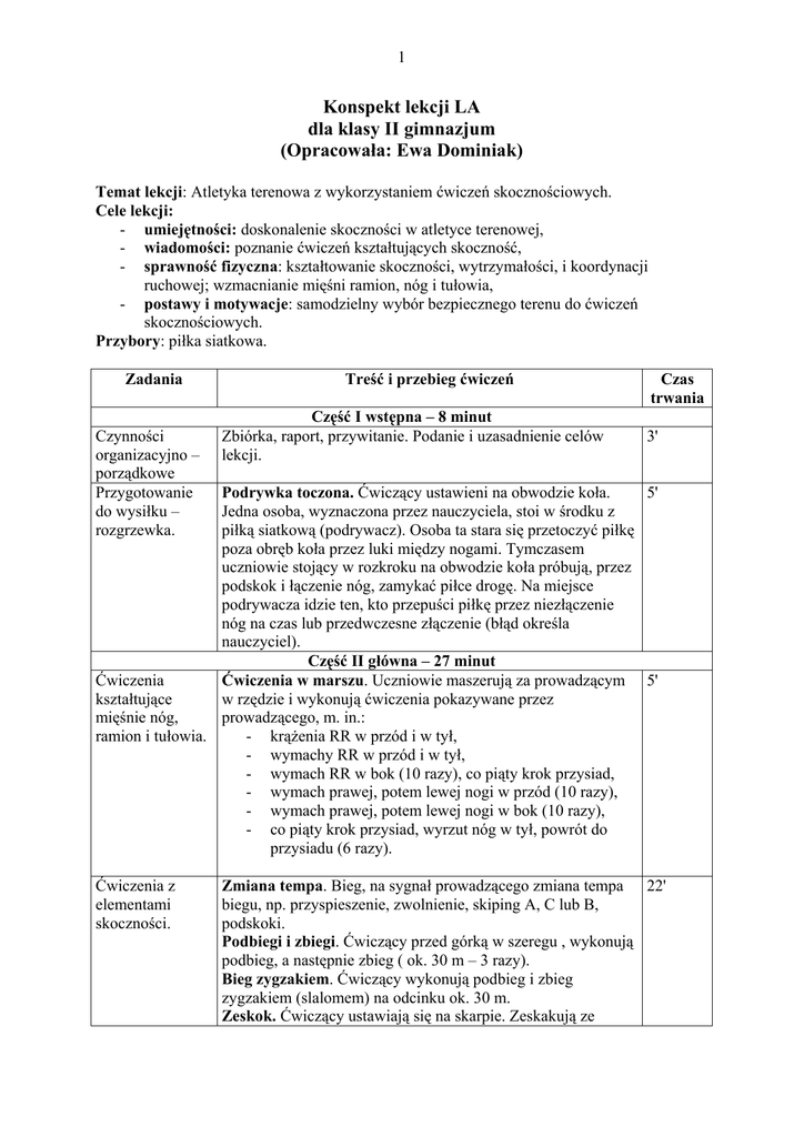 1 Konspekt lekcji LA dla klasy II gimnazjum (Opracowała: Ewa Dominiak) Temat lekcji: Atletyka terenowa z wykorzystaniem ćwiczeń skocznościowych. Cele lekcji: - umiejętności: doskonalenie skoczności w atletyce terenowej, - wiadomości: poznanie ćwiczeń kształtujących skoczność, - sprawność fizyczna: kształtowanie skoczności, wytrzymałości, i koordynacji ruchowej; wzmacnianie mięśni ramion, nóg i tułowia, - postawy i motywacje: samodzielny wybór bezpiecznego terenu do ćwiczeń skocznościowych. Przybory: piłka siatkowa. Zadania Czynności organizacyjno – porządkowe Przygotowanie do wysiłku – rozgrzewka. Treść i przebieg ćwiczeń Część I wstępna – 8 minut Zbiórka, raport, przywitanie. Podanie i uzasadnienie celów lekcji. Czas trwania 3' Podrywka toczona. Ćwiczący ustawieni na obwodzie koła. 5' Jedna osoba, wyznaczona przez nauczyciela, stoi w środku z piłką siatkową (podrywacz). Osoba ta stara się przetoczyć piłkę poza obręb koła przez luki między nogami. Tymczasem uczniowie stojący w rozkroku na obwodzie koła próbują, przez podskok i łączenie nóg, zamykać piłce drogę. Na miejsce podrywacza idzie ten, kto przepuści piłkę przez niezłączenie nóg na czas lub przedwczesne złączenie (błąd określa nauczyciel). Część II główna – 27 minut Ćwiczenia Ćwiczenia w marszu. Uczniowie maszerują za prowadzącym 5' kształtujące w rzędzie i wykonują ćwiczenia pokazywane przez mięśnie nóg, prowadzącego, m. in.: ramion i tułowia. - krążenia RR w przód i w tył, - wymachy RR w przód i w tył, - wymach RR w bok (10 razy), co piąty krok przysiad, - wymach prawej, potem lewej nogi w przód (10 razy), - wymach prawej, potem lewej nogi w bok (10 razy), - co piąty krok przysiad, wyrzut nóg w tył, powrót do przysiadu (6 razy). Ćwiczenia z elementami skoczności. Zmiana tempa. Bieg, na sygnał prowadzącego zmiana tempa 22' biegu, np. przyspieszenie, zwolnienie, skiping A, C lub B, podskoki. Podbiegi i zbiegi. Ćwiczący przed górką w szeregu , wykonują podbieg, a następnie zbieg ( ok. 30 m – 3 razy). Bieg zygzakiem. Ćwiczący wykonują podbieg i zbieg zygzakiem (slalomem) na odcinku ok. 30 m. Zeskok. Ćwiczący ustawiają się na skarpie. Zeskakują ze 2 Zabawa, gra lub ćwiczenie uspokajające. Korekcja wad postawy. Podsumowanie lekcji. skarpy i wdrapują się na nią na czworaka (5 razy). Skoki przez rów. Ćwiczący wykonują skoki przez rów: - jednonóż z rozbiegu pięciu kroków (5 razy) - obunóż z rozbiegu pięciu kroków (5 razy) - skok do rowu i wyskok na brzeg rowu z odbicia obunóż. Bieg z przeszkodami. Ćwiczący biegnąc wolno, pokonują napotkane przeszkody np. krzaki, dołki kamienie itp. Bieg dookoła drzewa. Ćwiczący biegną dookoła drzewa w prawo i w lewo. Bieg z wyskokiem dosiężnym. Ćwiczący w czasie biegu pod drzewami, wykonują odbicie jednonóż i dotykają ręką do gałęzi. Bieg z odbiciem. Ćwiczący w trakcie biegu wykonują naskok na pień ( lub kamień) odbijają się i zeskakują. Podskoki w miejscu. Uczniowie stoją przodem do drzewa i trzymają ramionami pień na wysokości barków. Wykonują podskoki obunóż w miejscu. Opady. Ćwiczący, ustawieni w postawie zasadniczej krok od drzewa, wykonują opady na drzewo. Wstępowania w marszu. Ćwiczący wykonują w marszu wejścia na leżące kłody, pniaki, kamienie. Przeskoki. Ćwiczący, stojąc przed przeszkodą (pniem, kamieniem, kłodą) wykonują przeskoki jednonóż nad przeszkodą w przód i w tył oraz w prawo i w lewo ( prawą i lewą nogą ). Skoki zawrotne. Ćwiczący, stojąc przed kłodą lub ławeczką, wykonują skoki zawrotne. Luźny marsz. Ćwiczący wykonują marsz z rozluźnieniem nóg i ramion. Część III końcowa – 10 minut Skłony. Rozsypka. Ćwiczący wykonują skłony w dół z 4' rozluźnieniem ramion i tułowia. Opady. Ćwiczący ustawieni w rozsypce wykonują klęk obunóż, z ramionami wzdłuż tułowia, następnie opad tułowia w tył i powrót do klęku. Rower. Ćwiczący w leżeniu tyłem wykonują ruchy nóg jak przy pedałowaniu. Ćwiczenie wzmacniające mięśnie brzucha. Uczniowie 3' dobierają się parami. Leżenie tyłem głowami do siebie, ręce wyciągnięte do siebie, chwyt za dłonie. Obaj uczniowie unoszą złączone nogi do pionu. Równocześnie opuszczają nogi w swoją prawą stronę do kąta 45º, podnoszą nogi z powrotem do pionu i powtarzają ćwiczenie w lewą stronę. Zbiórka, przypomnienie celów lekcji i ocena ich realizacji. 3' Ocena aktywności i osiągnięć uczniów. Pożegnanie.