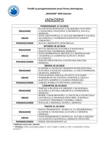 Posiłki są przygotowywane przez firmę cateringową „BALDAM” Wilk Damian JADŁOSPIS PONIEDZIAŁEK 17.10.2016 ŚNIADANIE OBIAD PODWIECZOREK PŁATKI KUKURYDZIANE Z MLEKIEM(4), KANAPKA Z MASŁEM(4) I POLĘDWICĄ POL DROBIOWĄ Ą, SAŁATĄ, HERBATA ZUPA JARZYNOWA(4, 2), GULASZ DROBIOWY Z KASZĄ JĘ JĘCZMIENNĄ I OGÓRKIEM KISZONYM, KOMPOT JABŁKOWY BANAN, BISZKOPTY, BAWARKA(4) WTOREK 18.10.2016 ŚNIADANIE OBIAD PODWIECZOREK RYŻ NA MLEKU(4), KANAPKA Z MASŁEM(4), MASŁEM(4) PASZTETEM I OGÓRKIEM, HERBATA ZUPA OGÓRKOWA(4), BRYZOL(3) Z ZIEMNIAKAMI I SURÓWKĄ SURÓWK Z CZERWONEJ KAPUSTY, WODA Z CYTRYNĄ CYTRYN JOGURT OWOCOWY(4), CIASTECZKO KRUCHE, HERBATA ŚRODA 19.10.2016 ŚNIADANIE OBIAD PODWIECZOREK KAJZERKA Z MASŁEM I SERKIEM WANILIOWYM(4), KANAPKA Z MASŁEM JAJKIEM(4, 3) I SZCZYPIORKIEM, MLEKO(4), HERBATA ZUPA KARTOFLANKA(4), PULPETY (3) W SOSIE POMIDOROWYM Z RYŻEM RY I SURÓWKĄ Ą Z BIAŁEJ KAPUSTY, KOMPOT Z CZARNEJ PORZECZKI JABŁKO, BABKA CYTRYNOWA, BAWARKA CZWARTEK 20.10.2016 ŚNIADANIE OBIAD PODWIECZOREK PSZENICA PRAŻONA PRA ONA W MIODZIE Z MLEKIEM(4), KANAPKA Z SZYNKĄ SZYNK DROBIOWĄ Ą I POMIDOREM, HERBATA ROSÓŁ Z MAKARONEM(3, 2), PAŁECZKA Z KURCZAKA GOTOWANA Z ZIEMNIAKAMI PURRE, SURÓWKA Z KAPUSTY PEKIŃSKIEJ SKIEJ I OGÓRKA, MIĘTA MIĘ ROGALIK Z SEREM(4), ŚLIWKA, LIWKA, HERBATA PIĄTEK 21.10.2016 PASTA TWAROGOWO - RYBNA (4, 5) Z RZODKIEWKĄ, RZODKIEWK KAJZERKA Z MASŁEM(4), KANAPKA Z MIODEM, ŚNIADANIE HERBATA ZUPA POMIDOROWA Z RYŻEM RY EM (4) , KLUSKI Z MIĘSEM MI OBIAD (3) I KAPUSTĄ GOTOWANĄ,, HERBATA OWOCOWA SEREK TRUSKAWKOWY (4) PODWIECZOREK *Jadłospis możee ulec zmianie * Alergeny: zboża zawierające ące ce gluten 1, seler 2, jajka 3, mleko 4, ryba 5, musztarda 6, ziarna sezonowe 7