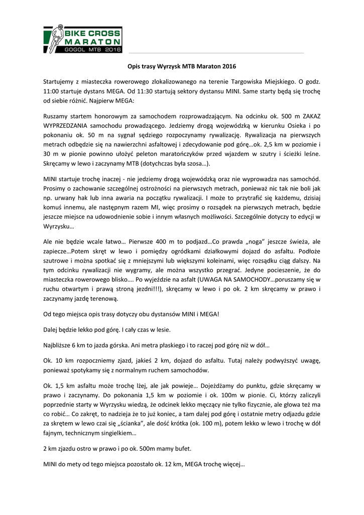 Opis trasy Wyrzysk MTB Maraton 2016 Startujemy z miasteczka rowerowego zlokalizowanego na terenie Targowiska Miejskiego. O godz. 11:00 startuje dystans MEGA. Od 11:30 startują sektory dystansu MINI. Same starty będą się trochę od siebie różnić. Najpierw MEGA: Ruszamy startem honorowym za samochodem rozprowadzającym. Na odcinku ok. 500 m ZAKAZ WYPRZEDZANIA samochodu prowadzącego. Jedziemy drogą wojewódzką w kierunku Osieka i po pokonaniu ok. 50 m na sygnał sędziego rozpoczynamy rywalizację. Rywalizacja na pierwszych metrach odbędzie się na nawierzchni asfaltowej i zdecydowanie pod górę…ok. 2,5 km w poziomie i 30 m w pionie powinno ułożyć peleton maratończyków przed wjazdem w szutry i ścieżki leśne. Skręcamy w lewo i zaczynamy MTB (dotychczas była szosa…). MINI startuje trochę inaczej - nie jedziemy drogą wojewódzką oraz nie wyprowadza nas samochód. Prosimy o zachowanie szczególnej ostrożności na pierwszych metrach, ponieważ nic tak nie boli jak np. urwany hak lub inna awaria na początku rywalizacji. I może to przytrafić się każdemu, dzisiaj komuś innemu, ale następnym razem MI, więc prosimy o rozsądek na pierwszych metrach, będzie jeszcze miejsce na udowodnienie sobie i innym własnych możliwości. Szczególnie dotyczy to edycji w Wyrzysku… Ale nie będzie wcale łatwo… Pierwsze 400 m to podjazd…Co prawda „noga” jeszcze świeża, ale zapiecze…Potem skręt w lewo i pomiędzy ogródkami działkowymi dojazd do asfaltu. Podłoże szutrowe i można spotkać się z mniejszymi lub większymi koleinami, więc rozsądku ciąg dalszy. Na tym odcinku rywalizacji nie wygramy, ale można wszystko przegrać. Jedyne pocieszenie, że do miasteczka rowerowego blisko…. Po wyjeździe na asfalt (UWAGA NA SAMOCHODY…poruszamy się w ruchu otwartym i prawą stroną jezdni!!!), skręcamy w lewo i po ok. 2 km skręcamy w prawo i zaczynamy jazdę terenową. Od tego miejsca opis trasy dotyczy obu dystansów MINI i MEGA! Dalej będzie lekko pod górę. I cały czas w lesie. Najbliższe 6 km to jazda górska. Ani metra płaskiego i to raczej pod górę niż w dół… Ok. 10 km rozpoczniemy zjazd, jakieś 2 km, dojazd do asfaltu. Tutaj należy podwyższyć uwagę, ponieważ spotykamy się z normalnym ruchem samochodów. Ok. 1,5 km asfaltu może trochę lżej, ale jak powieje… Dojeżdżamy do punktu, gdzie skręcamy w prawo i zaczynamy. Do pokonania 1,5 km w poziomie i ok. 100m w pionie. Ci, którzy zaliczyli poprzednie starty w Wyrzysku wiedzą, że odcinek lekko męczący nie tylko fizycznie, ale głowa też ma co robić… Co zakręt, to nadzieja że to już koniec, a tam dalej pod górę i ostatnie metry odjazdu gdzie za skrętem w lewo czai się „ścianka”, ale dość krótka (ok. 100 m), potem lekko w lewo i trochę w dół fajnym, technicznym singielkiem… 2 km zjazdu ostro w prawo i po ok. 500m mamy bufet. MINI do mety od tego miejsca pozostało ok. 12 km, MEGA trochę więcej… Najbliższe 8 km to jazda drogami leśnymi, ale nie tak od razu… Zaraz za bufetem zaczyna się ,,bruczek”…Ot taka lokalna atrakcja…700 m w poziomie i 40 m w pionie, nie przeraża, ale boli… Potem już tylko leśne drogi, czasami w górę czasami w dół… Na liczniku powinno być ok. 25 km i mamy rozjazd: MEGA w PRAWO, MINI w LEWO (do mety ok. 3,5 km, można zacząć finisz). Uczestnicy z MINI będą mieli od tego miejsca więcej w dół. Jednak dalej koncentracja potrzebna, ponieważ pomimo iż do mety jest blisko, to lepiej ten dystans pokonać na kołach niż pieszo… Po drodze jest jeszcze przejazd przez asfalt, będą tam stały odpowiednie służby, jednak zalecamy podwyższoną ostrożność, zawsze można trafić na jakiś samochód… MEGA po skręcie w PRAWO i pokonaniu ok. 500 m trafią na bufet. Biorąc pod uwagę, że do mety pozostało ok. 27 km, a większość nie miała czasu zatrzymać się na pierwszym bufecie, proponujemy uzupełnić zapasy, bo przed maratończykami powtórka z rozrywki, czyli: górska jazda w Wielkopolsce, więcej w górę, niż w dół… Łącznik do pokonywanej już trasy to ok. 3,5 km bardzo interesujących dróg leśnych. Potem skręt w prawo i wracamy na trasę już opisywaną. …Dalej będzie lekko pod górę. I cały czas w lesie. Najbliższe 6 km to jazda górska. Ani metra płaskiego i to raczej pod górę niż w dół… Ok. 10 km rozpoczniemy zjazd, jakieś 2 km, dojazd do asfaltu. Tutaj należy podwyższyć uwagę, ponieważ spotykamy się z normalnym ruchem samochodów…i tak dalej… Do mety pozostaną 24 km, jeden bufet, dwa długie zjazdy, kilka podjazdów, jeden „bruczek”, dojazd do rozjazdu i 3,5 km finiszu. A potem już tradycja - miasteczko rowerowe, doping kibiców na ostatnich metrach, za linią mety czasami deklaracje, że nigdy więcej, jednak po kilku chwilach pytanie kiedy następna impreza… Zapraszamy!