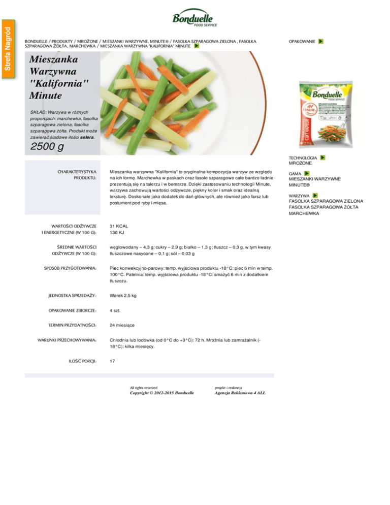BONDUELLE / PRODUKTY / MROŻONE / MIESZANKI WARZYWNE, MINUTE® / FASOLKA SZPARAGOWA ZIELONA , FASOLKA SZPARAGOWA ŻÓŁTA, MARCHEWKA / MIESZANKA WARZYWNA "KALIFORNIA" MINUTE OPAKOWANIE Mieszanka Warzywna "Kalifornia" Minute SKŁAD: Warzywa w różnych proporcjach: marchewka, fasolka szparagowa zielona, fasolka szparagowa żółta. Produkt może zawierać śladowe ilości selera. 2500 g TECHNOLOGIA MROŻONE CHARAKTERYSTYKA PRODUKTU: WARTOŚCI ODŻYWCZE I ENERGETYCZNE (W 100 G): ŚREDNIE WARTOŚCI ODŻYWCZE (W 100 G): SPOSÓB PRZYGOTOWANIA: Mieszanka warzywna "Kalifornia" to oryginalna kompozycja warzyw ze względu na ich formę. Marchewka w paskach oraz fasole szparagowe całe bardzo ładnie prezentują się na talerzu i w bemarze. Dzięki zastosowaniu technologii Minute, warzywa zachowują wartości odżywcze, piękny kolor i smak oraz idealną teksturę. Doskonałe jako dodatek do dań głównych, ale również jako farsz lub postument pod ryby i mięsa. 31 KCAL 130 KJ węglowodany – 4,3 g; cukry – 2,9 g; białko – 1,3 g; tłuszcz – 0,3 g, w tym kwasy tłuszczowe nasycone – 0,1 g; sól – 0,03 g Piec konwekcyjno-parowy: temp. wyjściowa produktu -18°C: piec 6 min w temp. 100°C. Patelnia: temp. wyjściowa produktu -18°C: smażyć 6 min z dodatkiem tłuszczu. JEDNOSTKA SPRZEDAŻY: Worek 2,5 kg OPAKOWANIE ZBIORCZE: 4 szt. TERMIN PRZYDATNOŚCI: 24 miesiące WARUNKI PRZECHOWYWANIA: ILOŚĆ PORCJI: Chłodnia lub lodówka (od 0°C do +3°C): 72 h. Mroźnia lub zamrażalnik (18°C): kilka miesięcy. 17 All rights reserved projekt i realizacja Copyright © 2012-2015 Bonduelle Agencja Reklamowa 4 ALL GAMA MIESZANKI WARZYWNE MINUTE® WARZYWA FASOLKA SZPARAGOWA ZIELONA FASOLKA SZPARAGOWA ŻÓŁTA MARCHEWKA