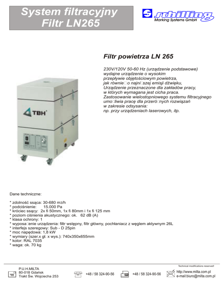 System filtracyjny Filtr LN265 Filtr powietrza LN 265 230V/120V 50-60 Hz (urządzenie podstawowe) wydajne urządzenie o wysokim przepływie objętościowym powietrza, jak również o najniższej emisji dźwięku, Urządzenie przeznaczone dla zakładów pracy, w których wymagana jest cicha praca. Zastosowanie wielostopniowego systemu filtracyjnego umożliwia pracę dla przeróżnych rozwiązań w zakresie odsysania: np. przy urządzeniach laserowych, itp. Dane techniczne: * zdolność ssąca: 30-680 m3/h * podciśnienie: 15.000 Pa * króciec ssący: 2x fi 50mm, 1x fi 80mm i 1x fi 125 mm * poziom ciśnienia akustycznego: ok. 62 dB (A) * klasa ochrony: 1 * wyposażenie urządzenia: filtr wstępny, filtr główny, pochłaniacz z węglem aktywnym 26L * interfejs szeregowy: Sub - D 25pin * moc napędowa: 1,8 kW * wymiary (szer.x gł. x wys.): 740x350x655mm * kolor: RAL 7035 * waga: ok. 70 kg Technical modifications reserved! P.U.H.MILTA 80-018 Gdańsk Trakt Św. Wojciecha 253 +48 / 58 324-90-56 +48 / 58 324-90-56 http://www.milta.com.pl e-mail:[email protected]