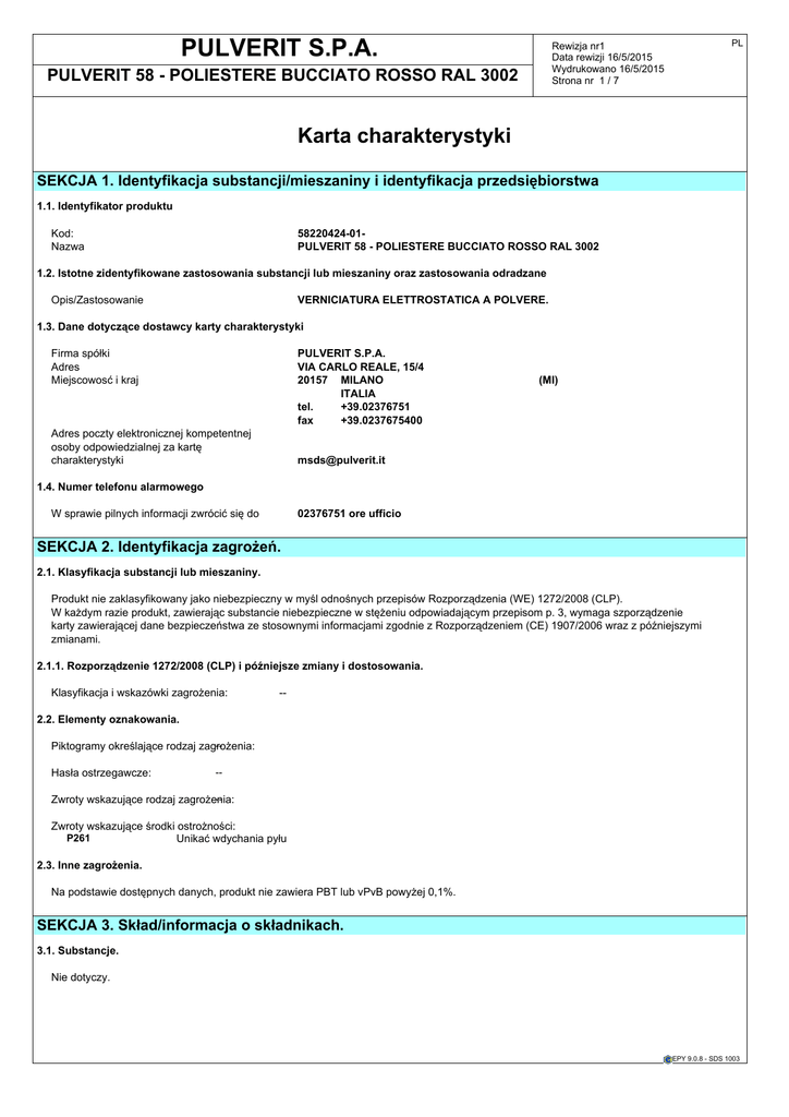 PULVERIT S.P.A. PL Rewizja nr1 Data rewizji 16/5/2015 Wydrukowano 16/5/2015 Strona nr 1 / 7 PULVERIT 58 - POLIESTERE BUCCIATO ROSSO RAL 3002 Karta charakterystyki SEKCJA 1. Identyfikacja substancji/mieszaniny i identyfikacja przedsiębiorstwa 1.1. Identyfikator produktu Kod: Nazwa 58220424-01PULVERIT 58 - POLIESTERE BUCCIATO ROSSO RAL 3002 1.2. Istotne zidentyfikowane zastosowania substancji lub mieszaniny oraz zastosowania odradzane Opis/Zastosowanie VERNICIATURA ELETTROSTATICA A POLVERE. 1.3. Dane dotyczące dostawcy karty charakterystyki Firma spółki Adres Miejscowosć i kraj PULVERIT S.P.A. VIA CARLO REALE, 15/4 20157 MILANO ITALIA tel. +39.02376751 fax +39.0237675400 Adres poczty elektronicznej kompetentnej osoby odpowiedzialnej za kartę charakterystyki (MI) [email protected] 1.4. Numer telefonu alarmowego W sprawie pilnych informacji zwrócić się do 02376751 ore ufficio SEKCJA 2. Identyfikacja zagrożeń. 2.1. Klasyfikacja substancji lub mieszaniny. Produkt nie zaklasyfikowany jako niebezpieczny w myśl odnośnych przepisów Rozporządzenia (WE) 1272/2008 (CLP). W każdym razie produkt, zawierając substancie niebezpieczne w stężeniu odpowiadającym przepisom p. 3, wymaga szporządzenie karty zawierającej dane bezpieczeństwa ze stosownymi informacjami zgodnie z Rozporządzeniem (CE) 1907/2006 wraz z późniejszymi zmianami. 2.1.1. Rozporządzenie 1272/2008 (CLP) i późniejsze zmiany i dostosowania. Klasyfikacja i wskazówki zagrożenia: -- 2.2. Elementy oznakowania. -Piktogramy określające rodzaj zagrożenia: Hasła ostrzegawcze: -- -Zwroty wskazujące rodzaj zagrożenia: Zwroty wskazujące środki ostrożności: P261 Unikać wdychania pyłu 2.3. Inne zagrożenia. Na podstawie dostępnych danych, produkt nie zawiera PBT lub vPvB powyżej 0,1%. SEKCJA 3. Skład/informacja o składnikach. 3.1. Substancje. Nie dotyczy. EPY 9.0.8 - SDS 1003 PULVERIT S.P.A. PULVERIT 58 - POLIESTERE BUCCIATO ROSSO RAL 3002 SEKCJA 3. Skład/informacja o składnikach. PL Rewizja nr1 Data rewizji 16/5/2015 Wydrukowano 16/5/2015 Strona nr 2 / 7 ... / >> 3.2. Mieszaniny. Zawiera: Identyfikacja. Stęż. %. Klasyfikacja 67/548/CEE. Klasyfikacja 1272/2008 (CLP). SIARCZAN BAROWY 58,8% - pierwiastka metalicznego CAS. 7727-43-7 30 - 32,5 WE. 231-784-4 INDEX. Nr. Rej. 01-2119491274-35 Substancja o obowiązującym we Wspólnocie najwyższym dopuszc zalnym stężeniu w srodowisku pracy. Uwaga: Górna wartość zakresu nie wliczana. Pełne znaczenie zwrotów (R) i symboli zagrożenia (H) ujęto w p. 16 karty. T+ = Bardzo Toksyczny(T+), T = Toksyczny(T), Xn = Szkodliwy(Xn), C = Żracy(C), Xi = Drażniący(Xi), O = Utleniający(O), E = Wybuchowy(E), F+ = Skrajnie Łatwopalny(F+), F = Wysoce Łatwopalny(F), N = Niebezpieczny dla Środowiska(N) SEKCJA 4. Środki pierwszej pomocy. 4.1. Opis środków pierwszej pomocy. Nie są wymagane. W kazdym razie, zaleca się przestrzegać przepisów higieny pracy. 4.2. Najważniejsze ostre i opóźnione objawy oraz skutki narażenia. Nie są znane przypadki ujemnego skutkowania produktu na zdrowie. 4.3. Wskazania dotyczące wszelkiej natychmiastowej pomocy lekarskiej i szczególnego postępowania z poszkodowanym. Brak. SEKCJA 5. Postępowanie w przypadku pożaru. 5.1. Środki gaśnicze. ZALECANE ŚRODKI GAŚNICZE Zwykłe środki gaśnicze: dwutlenek węgla, piana, proszki gaśnicze i mgła chłodziwa. NIE ZALECANE ŚRODKI GAŚNICZE Żaden. 5.2. Szczególne zagrożenia związane z substancją lub mieszaniną. ZAGROŻENIA ZWIĄZANE Z EKSPOZYCJĄ NA POŻAR Unikać wdychania produktów rozkładu. Produkt jest łatwopalny, dane stężenie pyłu rozproszonego w powietrzu ze źródłem zapłonu w pobliżu może wytworzyć z powietrzem mieszaniny wybuchowe. Produkt stały, w przypadku niezamierzonego wydostania się z pojemnika, narażony na wysokie temperatury lub w kontakcie źródła zapłonu, może wywołać lub rozprzestrzenić pożar. 5.3. Informacje dla straży pożarnej. WSKAZÓWKI OGÓLNE Pojemniki chłodzić strumieniami wody, aby zapobiec rozkładowi produktu i powstaniu substancji potencjalnie szkodliwych dla zdrowia. Wyposażenie ochrony przeciwpożarowej należy stosować zawsze w komplecie. Zebrać mieszaninę gaśniczą nie odprowadzając do kanalizacji. Zanieczyszczoną wodę i pozostałości gaśnicze skierować do zniszczenia zgodnie z obowiązującymi normami. WYPOSAŻENIE OCHRONNE Stosowna odzież przeznaczona do akcji przeciwpożarowej, tj aparat powietrzny butlowy ze sprężonym powietrzem i otwartym obwodem (EN 137), odzież ognioodporna (EN469), rękawice ognioodporne (EN659) i obuwie wysokie dla strażaków (HO A29 lub A30). SEKCJA 6. Postępowanie w przypadku niezamierzonego uwolnienia do środowiska. 6.1. Indywidualne środki ostrożności, wyposażenie ochronne i procedury w sytuacjach awaryjnych. W przypadku par lub pyłu rozproszonych w powietrzu stosować ochronę dróg oddechowych. Niniejsze wskazówki odnoszą się do osób uczestniczących w obrocie substancją, jak również w przypadku sytuacji awaryjnej. 6.2. Środki ostrożności w zakresie ochrony środowiska. Unikać przedostania się produktu do kanalizacji, do wód powierzchniowych i do wód gruntowych. 6.3. Metody i materiały zapobiegające rozprzestrzenianiu się skażenia i służące do usuwania skażenia. Potraktować ziemią lub kruszywem. Zebrać większość materiału i usunąć pozostałości za pomocą strumieni wody. Likwidacja zanieczyszczonego materiału winna się odbywać zgodnie z wytycznymi zawartymi w punkcie 13. EPY 9.0.8 - SDS 1003 PULVERIT S.P.A. PULVERIT 58 - POLIESTERE BUCCIATO ROSSO RAL 3002 SEKCJA 6. Postępowanie w przypadku niezamierzonego uwolnienia do środowiska. PL Rewizja nr1 Data rewizji 16/5/2015 Wydrukowano 16/5/2015 Strona nr 3 / 7 ... / >> 6.4. Odniesienia do innych sekcji. Ewentualne informacje odnośnie do ochrony indywidualnej i postępowaniem z odpadami podano w punktach 8 i 13. SEKCJA 7. Postępowanie z substancjami i mieszaninami oraz ich magazy