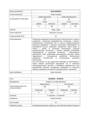 Nazwa przedmiotu JĘZYK BIZNESU Forma kształcenia studia I stopnia studia stacjonarne studia niestacjonarne 120 60 w tym w tym Liczba godzin i forma zajęd wykład dwiczenia wykład 0 120 0 Semestr dwiczenia 60 drugi - piąty Forma zaliczenia zaliczenie na ocenę Liczba punktów ECTS 11 Cele przedmiotu Przekazanie wiadomości merytorycznych o świecie biznesu z zakresu zarządzania i organizacji przedsiębiorstw, marketingu i reklamy, funkcjonowania narodowych firm w świecie międzynarodowych korporacji, globalizacji i różnicach kulturowych wpływających na prowadzenie biznesu. Rozwijanie umiejętności użycia języka w mowie i piśmie w sytuacjach biznesowych, poznanie specjalistycznego słownictwa i różnych rodzajów komunikacji obowiązujących w sytuacjach formalnych i nieformalnych, opanowanie sztuki publicznego przemawiania, poznanie stylów negocjowania i rozwiązywania problemów. Zastosowanie wiadomości teoretycznych w symulowanych sytuacjach biznesowych. Kurs ma również na celu zapoznanie studentów ze słownictwem i stylem tekstów biznesowych ukazujących się w czołowych niemieckojęzycznych pismach o charakterze gospodarczym oraz doskonalenie własnych umiejętności językowych w tworzeniu tekstów o podobnym charakterze w języku polskim i niemieckim. Język wykładowy Język niemiecki Fach BUSINESS – SPRACHE Bildungsform Studium 1. Grades (Bachelor) Tagesstudium Fernstudium 120 60 Unterrichtsstunden und Unterrichtsform Semester Testatform ECTC-Punkte Ziel(e) des Faches Vorlesung Seminar Vorlesung 0 120 0 Seminar 60 2. Semester - 5. Semester Testat mit Note 11 Vermittlung praktischer Inhalte aus der Welt des Handels im Bereich der Führung, des Marketings und der Werbung sowie Existenz nationaler Unternehmen in der Welt der internationalen Korporationen, Globalisierung und Einfluss kultureller Unterschiede auf die Leitung eines Unternehmens. Verwendung der gesprochenen und geschriebenen Handelssprache, Einführung in die Fachsprache und verschiedene in formellen und informellen Situationen übliche Kommunikationsformen, Beherrschung des öffentlichen Auftretens, Einführung in die Verhandlungsstrategien und Möglichkeiten der Problembeseitigung. Praktische Anwendung des theoretischen Wissens bei simulierten Verhandlungen. Das Ziel des Seminars ist außerdem, die Einführung der Studenten in das Fachvokabular und den Stil der Handelssprache. Im Rahmen des Kurses sollen die Studenten auch dazu animiert werden, eigene Fähigkeiten im Verfassen polnisch- und deutschsprachiger Texte mit Wirtschaftscharakter zu verbessern. Vorlesungssprache/ Seminarsprache Deutsch