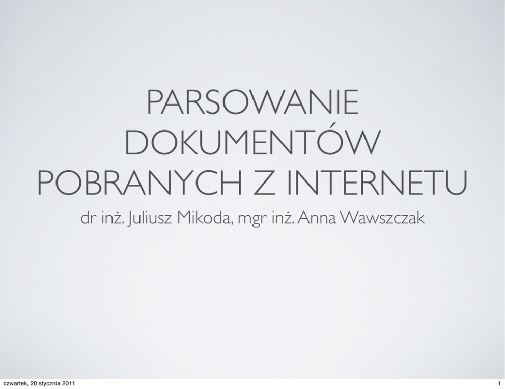 PARSOWANIE DOKUMENTÓW POBRANYCH Z INTERNETU dr inż. Juliusz Mikoda, mgr inż. Anna Wawszczak czwartek, 20 stycznia 2011 1 PARSOWANIE DOKUMENTU XML - PARSER DOM Plik nagłówkowy: FXml.h Przestrzeń nazw: Osp::Base::Xml http://www.xmlsoft.org/html/libxml-parser.html#xmlReadMemory http://xmlsoft.org/html/libxml-tree.html#xmlDoc http://xmlsoft.org/html/libxml-tree.html#xmlNode czwartek, 20 stycznia 2011 2 xmlReadMemory czwartek, 20 stycznia 2011 3 xmlDoc czwartek, 20 stycznia 2011 4 xmlNode czwartek, 20 stycznia 2011 5 ZADANIE 3 Pod adresem jar.icis.pcz.pl umieszczony jest WebServis pozwalający na przeliczanie walut. Wywołanie metody: • jar.icis.pcz.pl?method=method_name¶metry Odczyt kursu waluty w stosunku do złotego: • metoda getCourse • parametr: curr - waluta Przeliczanie kursów walut: • metoda convertCurr • parametry: from, to, amount czwartek, 20 stycznia 2011 Dostępne waluty: •PLN •EUR •USD •GBP 6 PRZYKŁADOWE WYWOŁANIE Odczyt kursu dolara: http://jar.icis.pcz.pl?method=getCourse&curr=USD W programie należy sprawdzić czy otrzymano poprawne dane! WebServis może zwrócić komunikat o błędzie. Jeśli WebServis zwrócił poprawne dane korzeniem drzewa jest węzeł „result”, w przeciwnym wypadku „error”. czwartek, 20 stycznia 2011 7