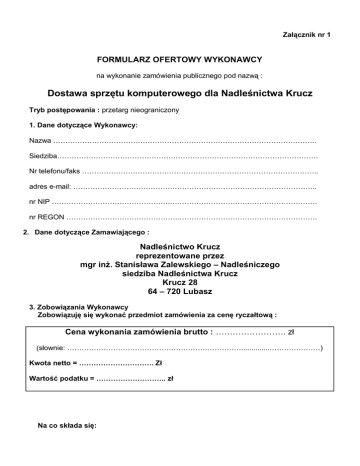 Załącznik nr 1 FORMULARZ OFERTOWY WYKONAWCY na wykonanie zamówienia publicznego pod nazwą : Dostawa sprzętu komputerowego dla Nadleśnictwa Krucz Tryb postępowania : przetarg nieograniczony 1. Dane dotyczące Wykonawcy: Nazwa ………………………………………………………………………………………………. Siedziba……………………………………………………………………………………………… Nr telefonu/faks …………………………………………………………………………………….. adres e-mail: ……………………………………………………………………………………….. nr NIP ………………………………………….……………………………………………………. nr REGON ……………………………………….…………………………………………………. 2. Dane dotyczące Zamawiającego : Nadleśnictwo Krucz reprezentowane przez mgr inż. Stanisława Zalewskiego – Nadleśniczego siedziba Nadleśnictwa Krucz Krucz 28 64 – 720 Lubasz 3. Zobowiązania Wykonawcy Zobowiązuję się wykonać przedmiot zamówienia za cenę ryczałtową : Cena wykonania zamówienia brutto : ……………………. zł (słownie: ………………………………………………………………..............…………………) Kwota netto = …………………………. Zł Wartość podatku = ……………………….. zł Na co składa się: Komputery PC 4 szt. do zastosowań biurowych o parametrach minimalnych: (producent/model) ……………………………………………………………………………………………….. Cena (brutto) za 1 sztukę: …………………… zł., VAT ……………….…. zł., co daje …………………… zł. netto. Atrybut Opis Zastosowanie Komputer będzie wykorzystywany do pracy w domenie zamawiającego opartej na usłudze Active Directory z podstawowym sposobem logowania/uwierzytelniania przy użyciu karty kryptograficznej. Używany będzie w aplikacjach webowych, biurowych, terminalowych. Komputer powinien osiągać w teście wydajności „Geekbench 2.1.12 for Windows x86 (32-bit)” pod systemem Windows 7 wynik min. 3300 Geekbench Score. Pojemność min. 4 GB Wydajność obliczeniowa Pamięć operacyjna RAM Wydajność grafiki mierzona Indeksem wydajności systemu Windows (dla systemu Windows 7) Dźwięk Wydajność pulpitu dla interfejsu Windows Aero min. 4,4. Wydajność trójwymiarowej grafiki biznesowej: min. 4,4 Karta powinna być zgodna ze standardem DIRECTX 10.0 Wbudowany podsystem dźwiękowy High Definition, głośnik wewnętrzny Napędy wewnętrzne Min. 250GB SATA II kompatybilny z technologią SMART IV i NCQ DVD+/-RW 16x SuperMulti LightScribe Komunikacja LAN 10/100/1000 Mb/s Ergonomia Głośność maksymalnie 27 dB z pozycji operatora, pomiar zgodny z normą ISO 9296 / ISO 7779; wymaga się dostarczenia odpowiedniego certyfikatu lub deklaracji producenta Min. 10 USB (min. 2.0), z czego min 4 z przodu obudowy, 1 port szeregowy,2 PS/2, 1 RJ-45, 1 VGA, wejście/ wyjście audio, wejście mikrofonu. Dysk twardy Porty we/wy Typ obudowy Mysz Klawiatura System operacyjny Gwarancja Wymagania dodatkowe umożliwiająca pracę w pionie jak i w poziomie. Obudowa musi umożliwiać serwisowanie komputera bez użycia narzędzi. certyfikat bezpieczeństwa CE Optyczna mysz z 2 przyciskami i przewijaniem, trwale oznakowana logiem producenta jednostki centralnej. qwerty, standard amerykański, polska programisty wyposażona w czytnik kart procesorowych „Smart Card”, trwale oznakowana logiem producenta jednostki centralnej. Windows 7 Professional 36 miesięcy w następnym dniu roboczym w miejscu instalacji (onsite) Serwis musi być realizowany przez producenta lub autoryzowanego partnera serwisowego producenta (należy dołączyć do oferty) instrukcja obsługi w jęz. pol., dostęp do aktualnych sterowników zainstalowanych w komputerze realizowany przez podanie identyfikatora klienta, numeru seryjnego komputera lub innego identyfikatora produktu na dedykowanej przez Oferowane części odmienne od wymaganych producenta stronie internetowej – należy podać adres strony. CE, certyfikat zgodności z Microsoft Windows 7 dla całego komputera (wydruk ze strony Microsoft), ISO 9001oraz 14001 producenta komputera (wymagane dokumenty poświadczające) Certyfikaty i standardy Monitory 3 szt. LCD LED 19'' klasyczny o parametrach minimalnych: (producent/model) ……………………………………………………………………………………………….. Cena (brutto) za 1 sztukę: …………………… zł., VAT ……………….…. zł., co daje …………………… zł. netto. Atrybut Wartości Przekątna ekranu 19” Rozdzielczość nominalna Matryca 1280 x 1024 Podświetlenie LED, powłoka matowa, przeciwodblaskowa Proporcje obrazu klasyczne (4:3, 5:4) Jasność 250 cd/m2 Kontrast 700:1 Kąt widzenia poziom/pion min. 160 °/ 160 ° Łączny czas reakcji matrycy max. 5 ms Złącza D-SUB (15 pin), DVI-D CE, TCO 03, ISO 9001 oraz 14001 lub równoważne producenta monitora (wymagane dokumenty poświadczające) Jasność/kontrast, położenie obrazu, automatyczna kalibracja obrazu Certyfikaty Obsługa i regulacje Gwarancja Oferowane części odmienne od wymaganych 36 miesięcy Monitor 1 szt. LCD LED 19'' panoramiczny o parametrach minimalnych: (producent/model) ……………………………………………………………………………………………….. Cena (brutto) za 1 sztukę: …………………… zł., VAT ……………….…. zł., co daje …………………… zł. netto. Atrybut Wartość Przekątna ekranu 19” Rozdzielczość nominalna 1440 x 900 Matryca Podświetlenie LED Proporcje obrazu panoramiczne (16:9, 16:10) Jasność 250 cd/m2 Kontrast 1000:1 Kąt widzenia poziom/pion min. 160 °/ 160 ° Łączny czas reakcji ma