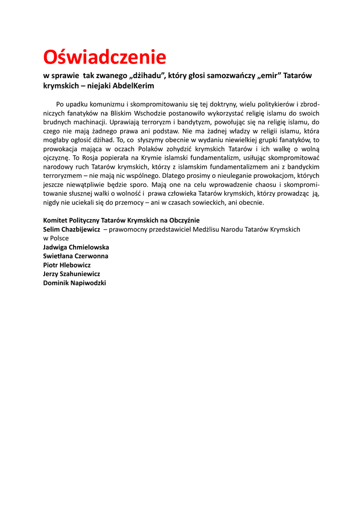 Oświadczenie w sprawie tak zwanego „dżihadu”, który głosi samozwańczy „emir” Tatarów krymskich – niejaki AbdelKerim Po upadku komunizmu i skompromitowaniu się tej doktryny, wielu politykierów i zbrodniczych fanatyków na Bliskim Wschodzie postanowiło wykorzystać religię islamu do swoich brudnych machinacji. Uprawiają terroryzm i bandytyzm, powołując się na religię islamu, do czego nie mają żadnego prawa ani podstaw. Nie ma żadnej władzy w religii islamu, która mogłaby ogłosić dżihad. To, co słyszymy obecnie w wydaniu niewielkiej grupki fanatyków, to prowokacja mająca w oczach Polaków zohydzić krymskich Tatarów i ich walkę o wolną ojczyznę. To Rosja popierała na Krymie islamski fundamentalizm, usiłując skompromitować narodowy ruch Tatarów krymskich, którzy z islamskim fundamentalizmem ani z bandyckim terroryzmem – nie mają nic wspólnego. Dlatego prosimy o nieuleganie prowokacjom, których jeszcze niewątpliwie będzie sporo. Mają one na celu wprowadzenie chaosu i skompromitowanie słusznej walki o wolność i prawa człowieka Tatarów krymskich, którzy prowadząc ją, nigdy nie uciekali się do przemocy – ani w czasach sowieckich, ani obecnie. Komitet Polityczny Tatarów Krymskich na Obczyźnie Selim Chazbijewicz – prawomocny przedstawiciel Medżlisu Narodu Tatarów Krymskich w Polsce Jadwiga Chmielowska Swietłana Czerwonna Piotr Hlebowicz Jerzy Szahuniewicz Dominik Napiwodzki