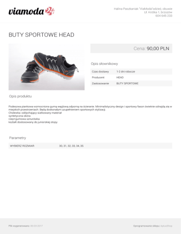 Halina Paszkaniak "ViaModa"odzież, obuwie Ul. Krótka 1, brzozów 604 645 233 BUTY SPORTOWE HEAD Cena: 90,00 PLN Opis słownikowy Czas dostawy 1-2 dni robocze Producent HEAD Zastosowanie BUTY SPORTOWE Opis produktu Podeszwa piankowa wzmocniona gumą węglową odporną na ścieranie. Minimalistyczny design i sportowy fason świetnie odnajdą się w miejskich przestrzeniach. Będą doskonałym uzupełnieniem sportowych stylizacji. Cholewka: oddychający siatkowany materiał syntetyczna skóra rzep+gumowa sznurówka kształt dostosowany do juniorskiej stopy Parametry WYBIERZ ROZMIAR Plik wygenerowano: 06-03-2017 30, 31, 32, 33, 34, 35 Oprogramowanie sklepu: AptusShop Halina Paszkaniak "ViaModa"odzież, obuwie Ul. Krótka 1, brzozów 604 645 233 Galeria Plik wygenerowano: 06-03-2017 Powered by TCPDF (www.tcpdf.org) Oprogramowanie sklepu: AptusShop