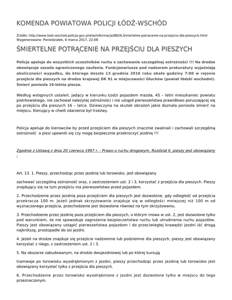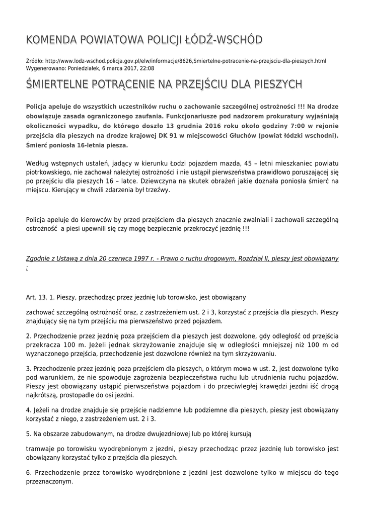 KOMENDA POWIATOWA POLICJI ŁÓDŹ-WSCHÓD Źródło: http://www.lodz-wschod.policja.gov.pl/elw/informacje/8626,Smiertelne-potracenie-na-przejsciu-dla-pieszych.html Wygenerowano: Poniedziałek, 6 marca 2017, 22:08 ŚMIERTELNE POTRĄCENIE NA PRZEJŚCIU DLA PIESZYCH Policja apeluje do wszystkich uczestników ruchu o zachowanie szczególnej ostrożności !!! Na drodze obowiązuje zasada ograniczonego zaufania. Funkcjonariusze pod nadzorem prokuratury wyjaśniają okoliczności wypadku, do którego doszło 13 grudnia 2016 roku około godziny 7:00 w rejonie przejścia dla pieszych na drodze krajowej DK 91 w miejscowości Głuchów (powiat łódzki wschodni). Śmierć poniosła 16-letnia piesza. Według wstępnych ustaleń, jadący w kierunku Łodzi pojazdem mazda, 45 – letni mieszkaniec powiatu piotrkowskiego, nie zachował należytej ostrożności i nie ustąpił pierwszeństwa prawidłowo poruszającej się po przejściu dla pieszych 16 – latce. Dziewczyna na skutek obrażeń jakie doznała poniosła śmierć na miejscu. Kierujący w chwili zdarzenia był trzeźwy. Policja apeluje do kierowców by przed przejściem dla pieszych znacznie zwalniali i zachowali szczególną ostrożność a piesi upewnili się czy mogę bezpiecznie przekroczyć jezdnię !!! Zgodnie z Ustawą z dnia 20 czerwca 1997 r. - Prawo o ruchu drogowym, Rozdział II, pieszy jest obowiązany : Art. 13. 1. Pieszy, przechodząc przez jezdnię lub torowisko, jest obowiązany zachować szczególną ostrożność oraz, z zastrzeżeniem ust. 2 i 3, korzystać z przejścia dla pieszych. Pieszy znajdujący się na tym przejściu ma pierwszeństwo przed pojazdem. 2. Przechodzenie przez jezdnię poza przejściem dla pieszych jest dozwolone, gdy odległość od przejścia przekracza 100 m. Jeżeli jednak skrzyżowanie znajduje się w odległości mniejszej niż 100 m od wyznaczonego przejścia, przechodzenie jest dozwolone również na tym skrzyżowaniu. 3. Przechodzenie przez jezdnię poza przejściem dla pieszych, o którym mowa w ust. 2, jest dozwolone tylko pod warunkiem, że nie spowoduje zagrożenia bezpieczeństwa ruchu lub utrudnienia ruchu pojazdów. Pieszy jest obowiązany ustąpić pierwszeństwa pojazdom i do przeciwległej krawędzi jezdni iść drogą najkrótszą, prostopadle do osi jezdni. 4. Jeżeli na drodze znajduje się przejście nadziemne lub podziemne dla pieszych, pieszy jest obowiązany korzystać z niego, z zastrzeżeniem ust. 2 i 3. 5. Na obszarze zabudowanym, na drodze dwujezdniowej lub po której kursują tramwaje po torowisku wyodrębnionym z jezdni, pieszy przechodząc przez jezdnię lub torowisko jest obowiązany korzystać tylko z przejścia dla pieszych. 6. Przechodzenie przez torowisko wyodrębnione z jezdni jest dozwolone tylko w miejscu do tego przeznaczonym. 7. Jeżeli wysepka dla pasażerów na przystanku komunikacji publicznej łączy się z przejściem dla pieszych, przechodzenie do i z przystanku jest dozwolone tylko po tym przejściu. 8. Jeżeli przejście dla pieszych wyznaczone jest na drodze dwujezdniowej, przejście na każdej jezdni uważa się za przejście odrębne. Przepis ten stosuje się odpowiednio do przejścia dla pieszych w miejscu, w którym ruch pojazdów jest rozdzielony wysepką lub za pomocą innych urządzeń na jezdni. Art. 14. Zabrania się: 1) wchodzenia na jezdnię: a) bezpośrednio przed jadący pojazd, w tym również na przejściu dla pieszych, b) spoza pojazdu lub innej przeszkody ograniczającej widoczność drogi; 2) przechodzenia przez jezdnię w miejscu o ograniczonej widoczności drogi; 3) zwalniania kroku lub zatrzymywania się bez uzasadnionej potrzeby podczas przechodzenia przez jezdnię lub torowisko; 4) przebiegania przez jezdnię; 5) chodzenia po torowisku; 6) wchodzenia na torowisko, gdy zapory lub półzapory są opuszczone lub opuszczanie ich rozpoczęto; 7) przechodzenia przez jezdnię w miejscu, w którym urządzenie zabezpieczające lub przeszkoda oddzielają drogę dla pieszych albo chodnik od jezdni, bez względu na to, po której stronie jezdni one się znajdują. Ocena: 0/5 (0) Tweetnij